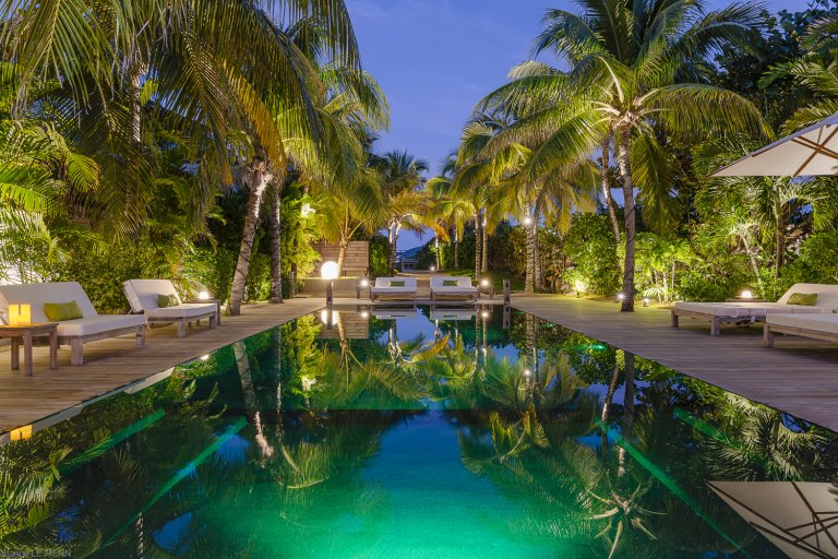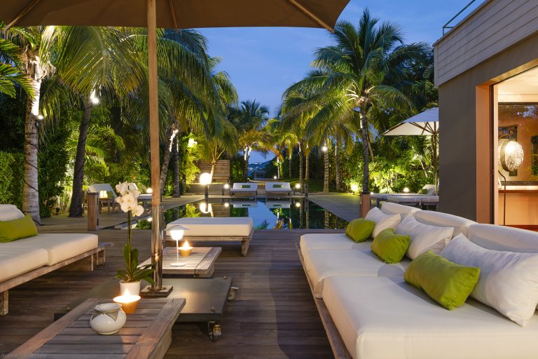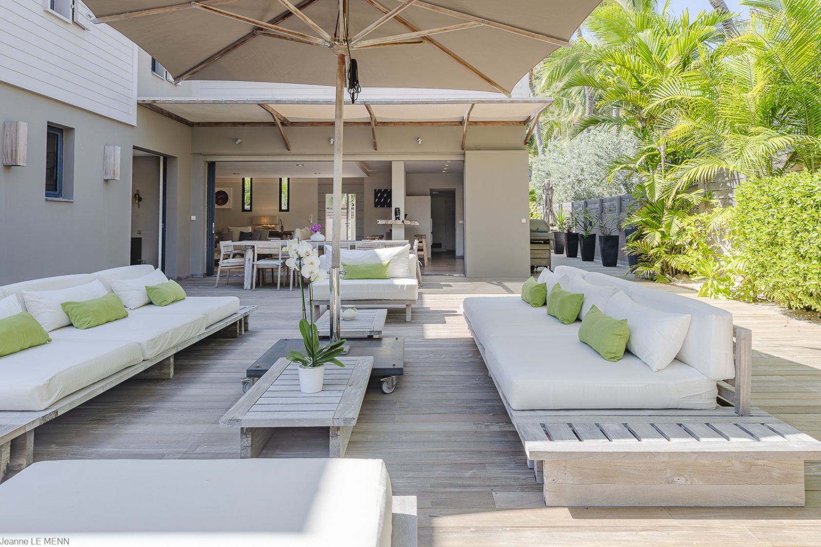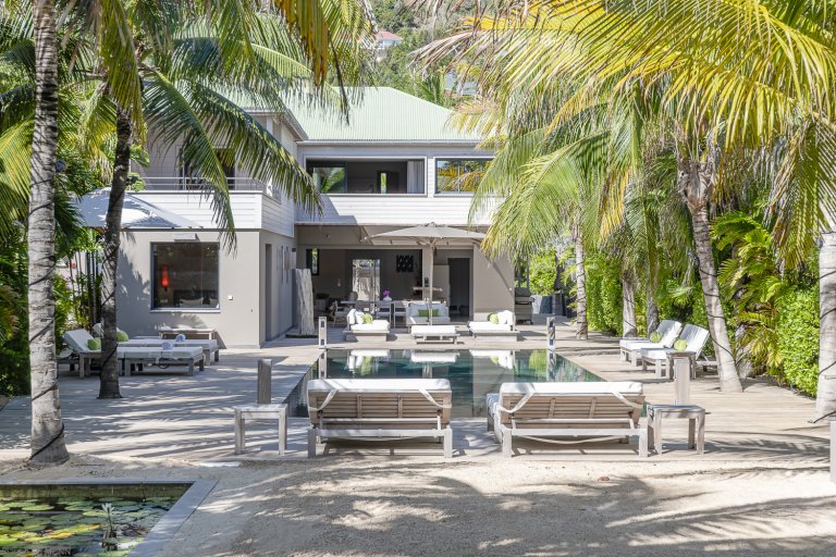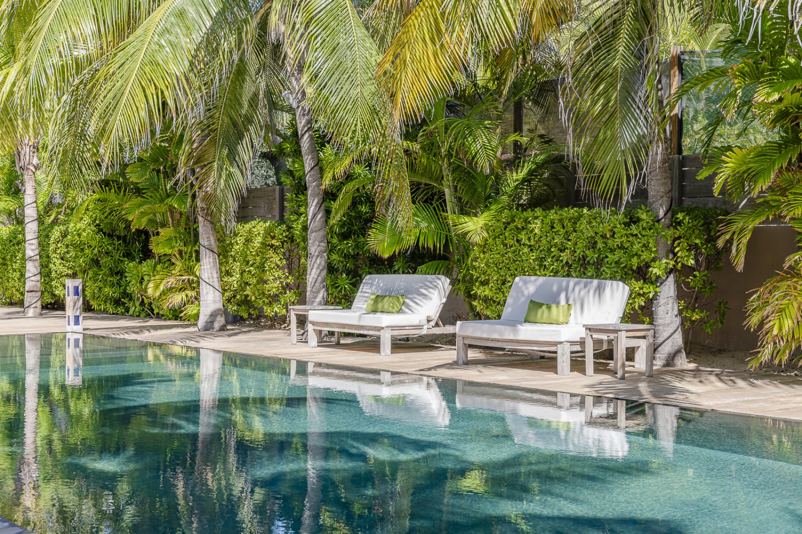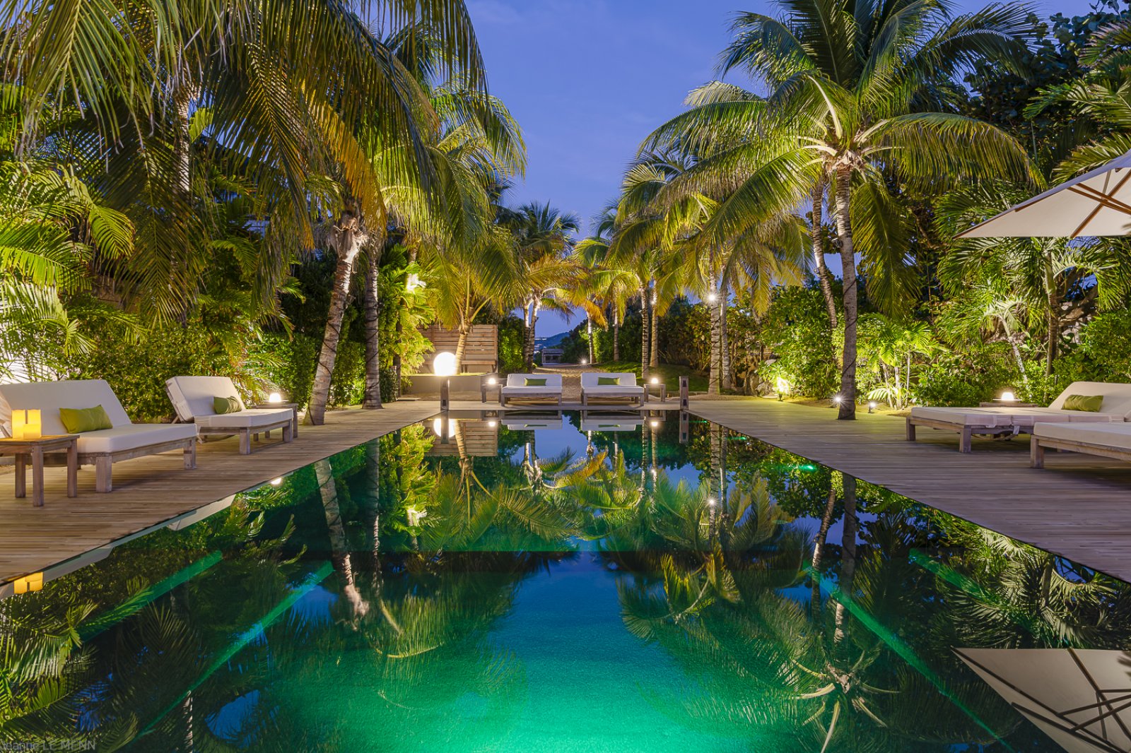 Tucked behind the dune and among coconut palms just steps from the water in Anse de Cayes, Villa K (VLK) adds another jewel to the rare selection of top-level beachfront properties on the island. Recently constructed by the renowned St. Barth architectural design firm of Patrick Raffeneau, Villa K is an exceptional property both inside and out. Well suited to a relaxed yet comfortable tropical lifestyle, the living area, kitchen and outdoor dining area are all contiguous, but the interior space can be closed and fully air conditioned when desired. The kitchen is equally well adapted to family meals or to catering for parties, with professional appliances and a large pantry with a second refrigerator and a Leibherr wine-storage unit. The living area offers comfortable seating, a high-end home theater system and elegant decor. Outdoor dining for ten is pleasant for breakfast and an absolutely magical location at night, beneath the palm fronds and in the dramatic lighting of the landscaped garden.
