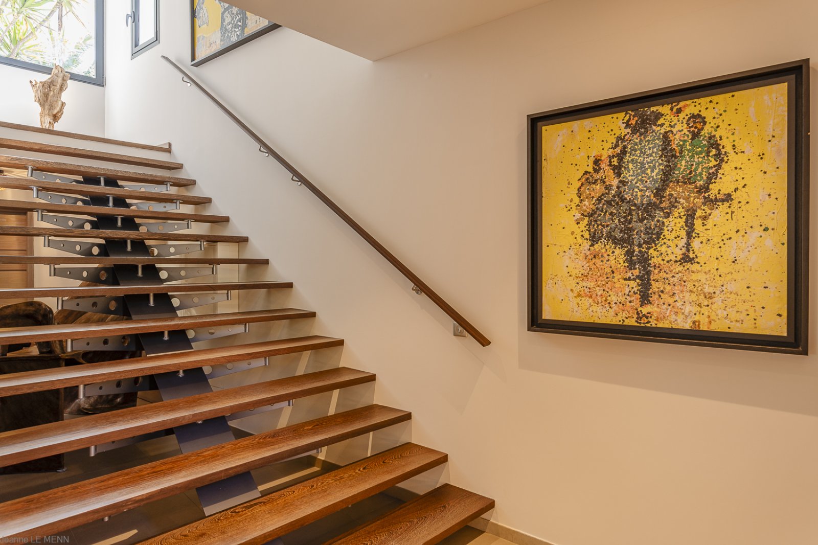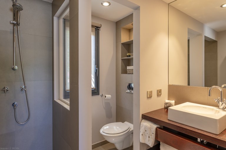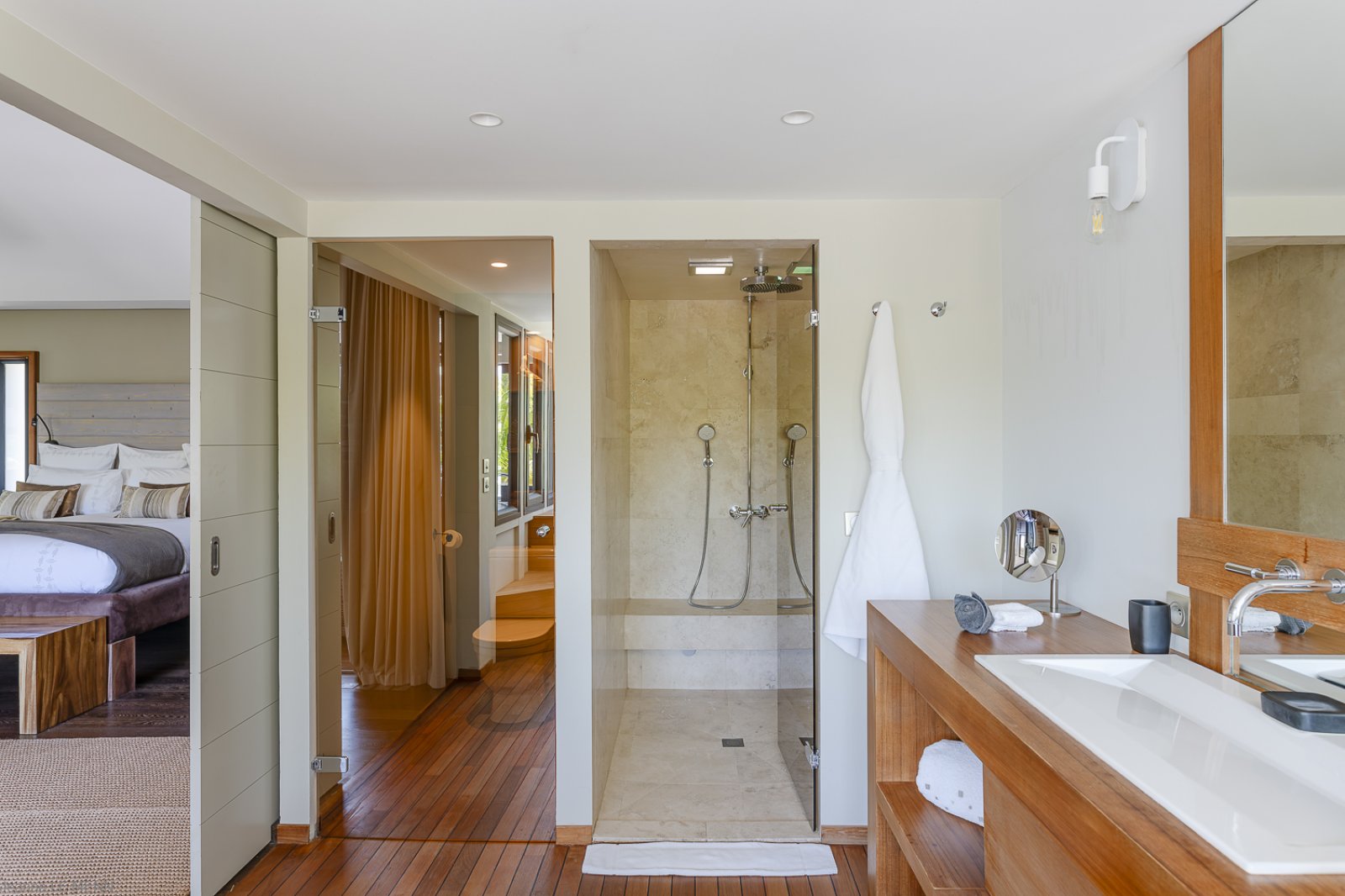 The master bedroom suite on the upper level offers a magnificent view of the Atlantic from its private terrace as well as from the full bathtub in the ensuite bathroom. Another bedroom on the upper level offers a sea view as well and its own private deck. The third and fourth bedrooms open onto the terrace and garden view. All bedrooms have their own ensuite baths and are appointed with fine linens and amenities.