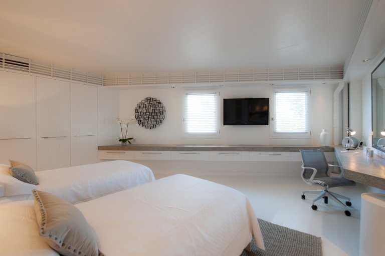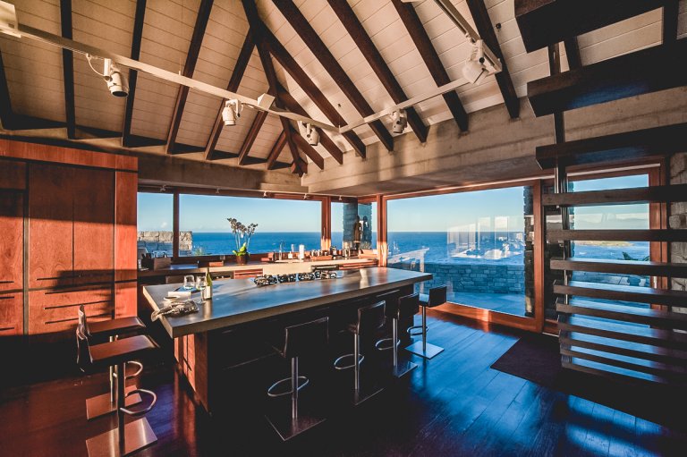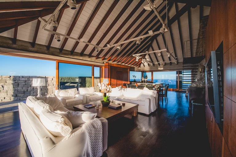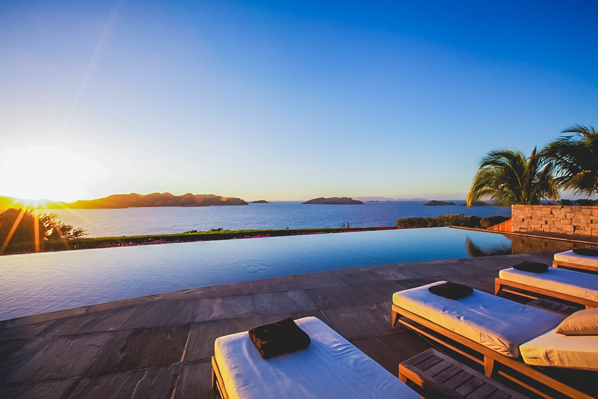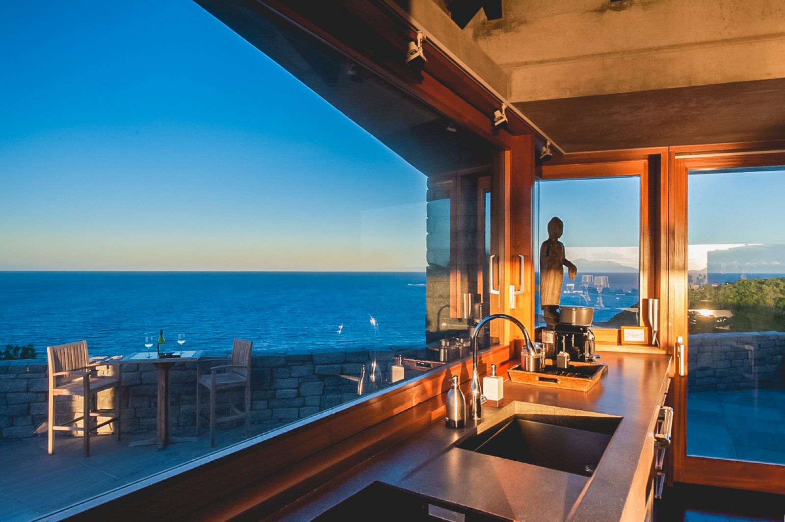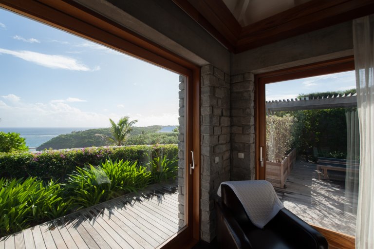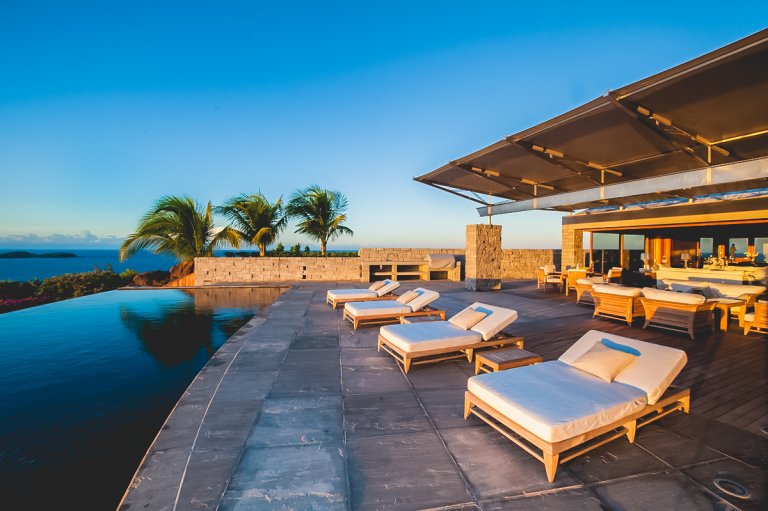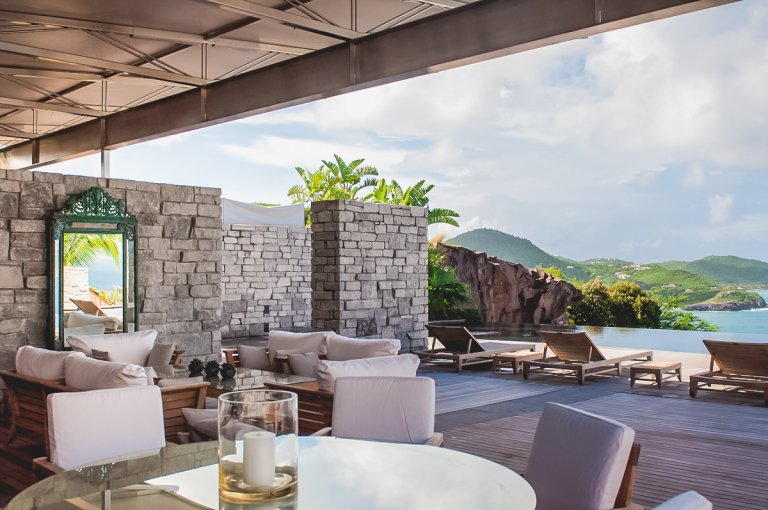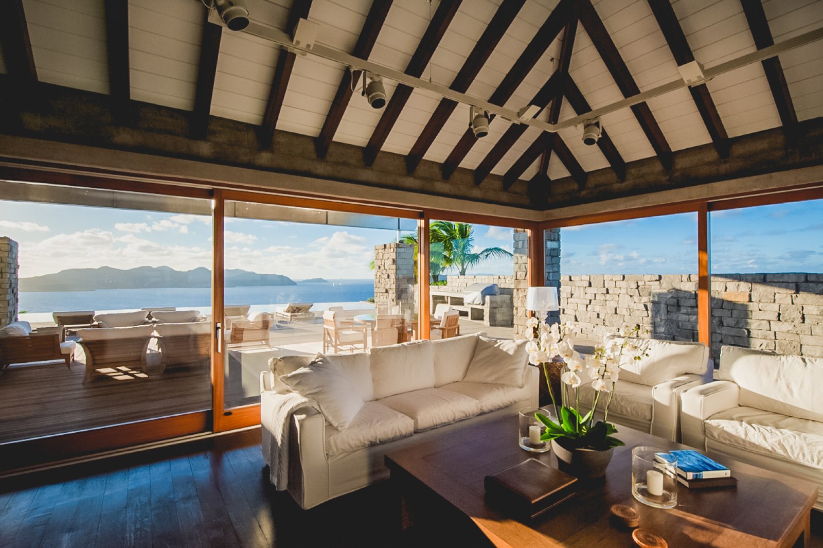 The large main living room that comfortably seats 10 is perfect for entertaining, with high ceilings and 270-degree ocean views, feels open, yet extremely inviting. It teases your senses, as you peer out over the bays of Lorient and St. Jean and the Atlantic Ocean from the cushy white sofas. Looking out at the wide expanse as far as you can see, St. Maarten can be spotted in the distance.