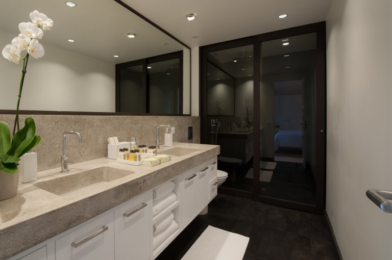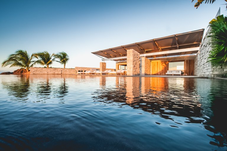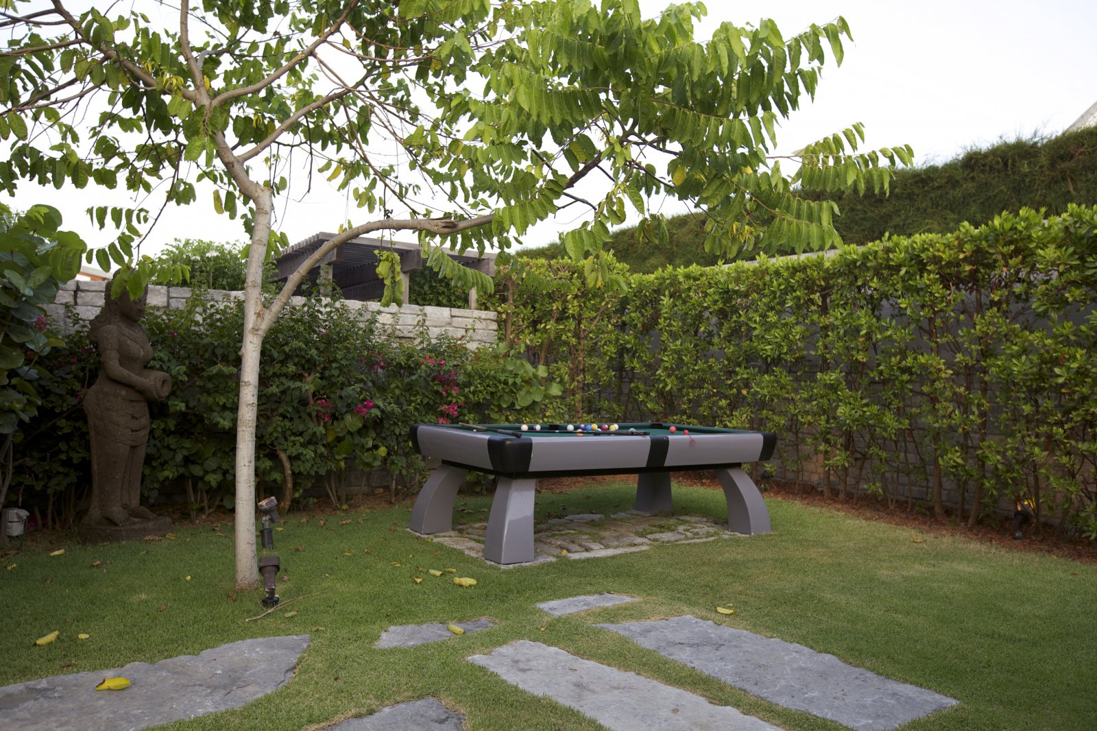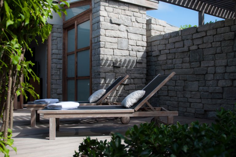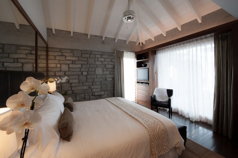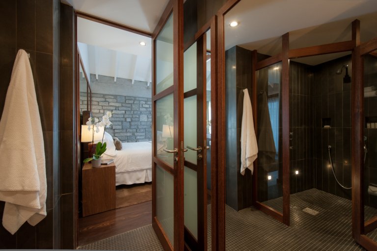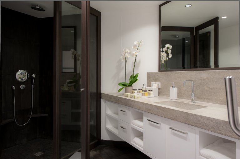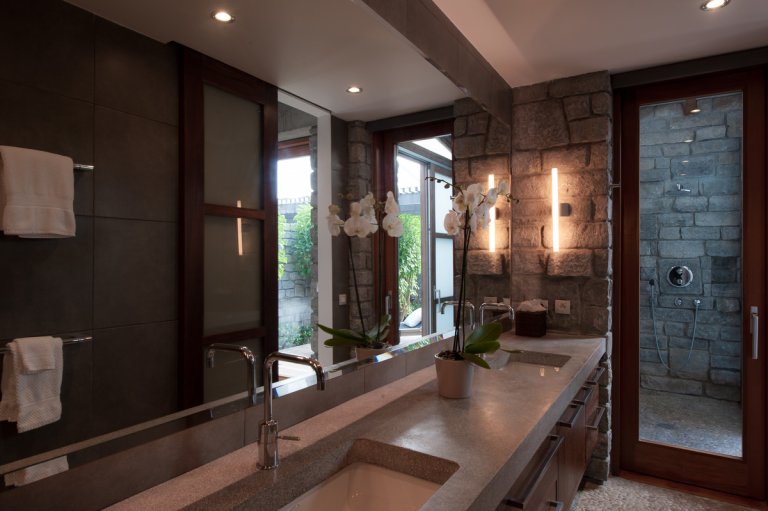 All five of the bedrooms in this Luxury Villa are large and elegant. Three of them are located on the main floor and two on the lower. The first bedroom offers an en-suite bath constructed primarily from glass tile and features a private chaise-filled deck and an outdoor shower. The second and third bedrooms, that open to the outside private deck with a black stone fountain, have their own lavishly-appointed modern baths. A well-equipped gym and massage room complement the lower level, providing even more ways to relax!