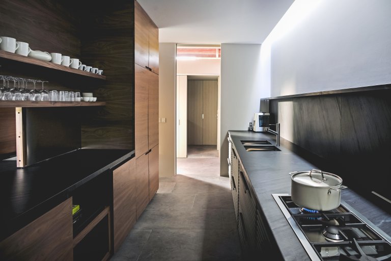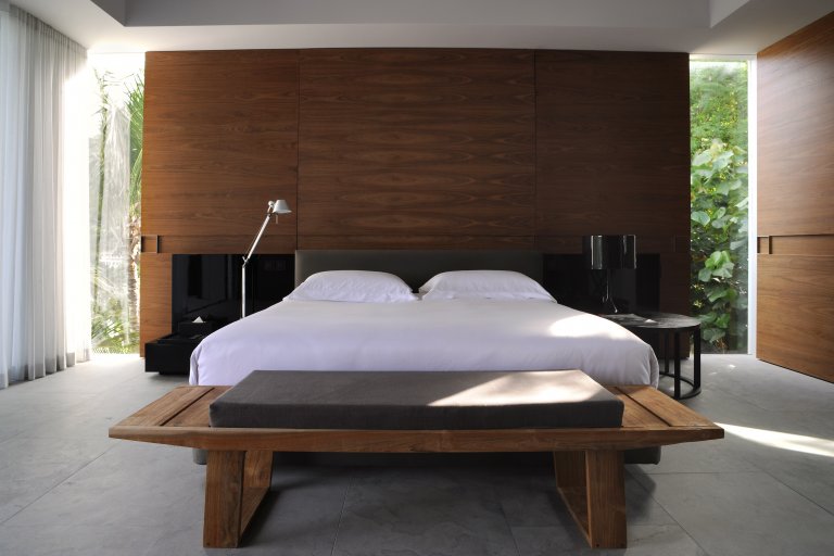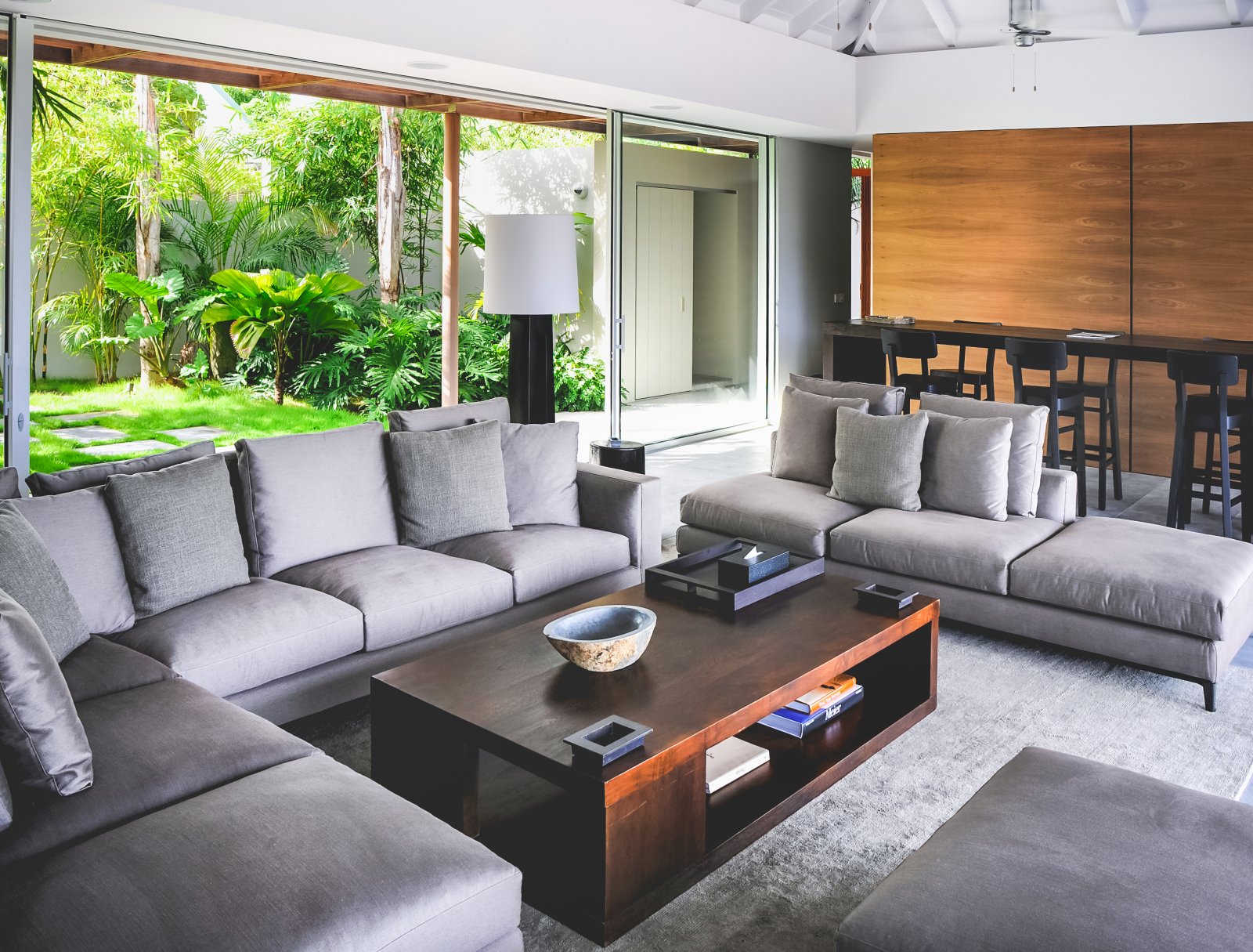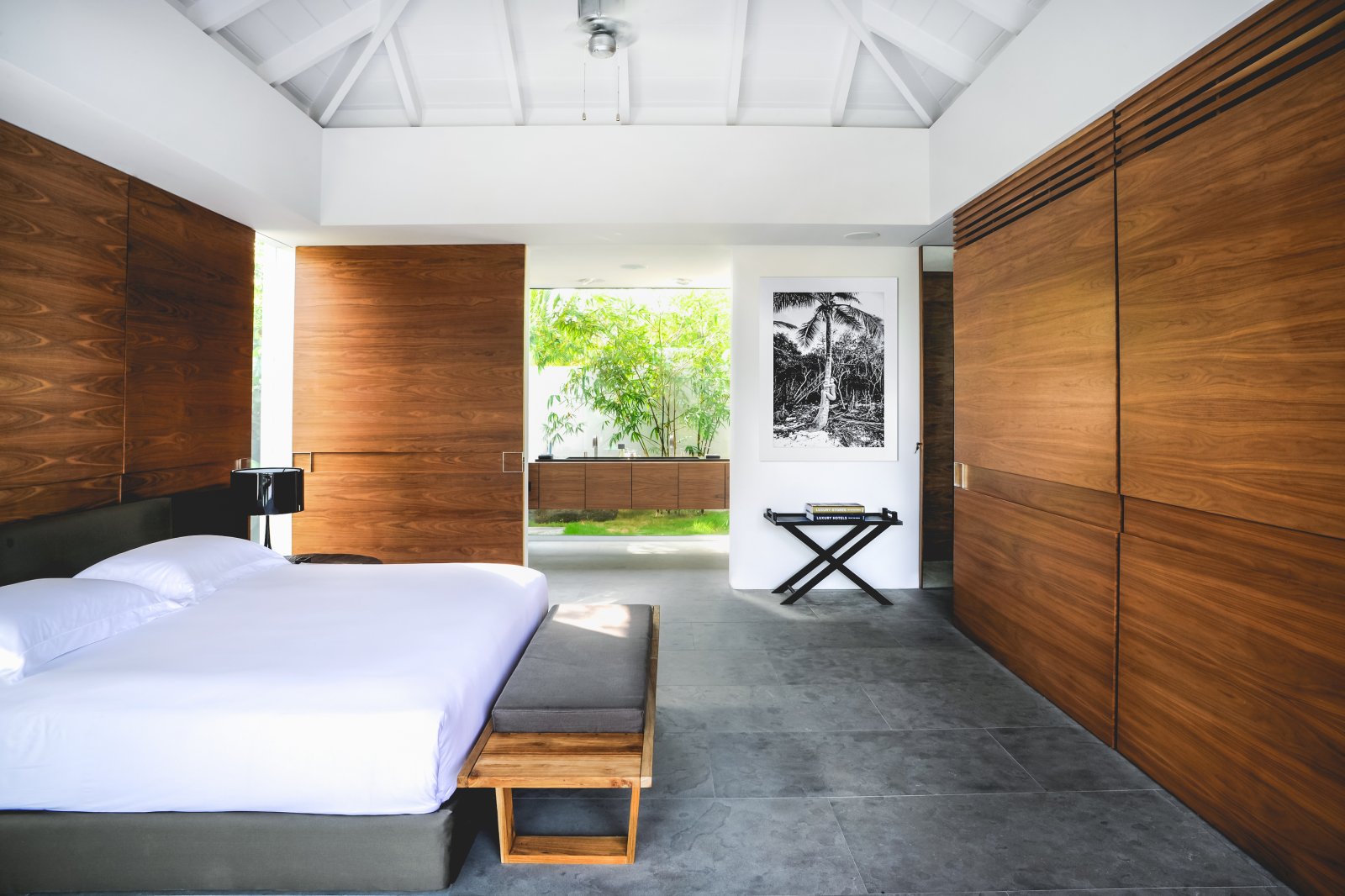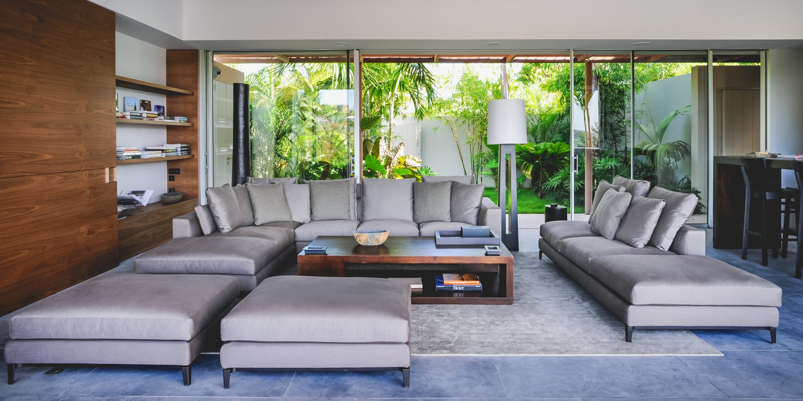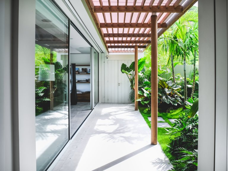 Upon entering this luxury villa, a coolly shaded hallway leads outward toward a sunlit greenery-filled patio. This space further magnifies the sense of inhabiting an extension of the gorgeous scenery outside.