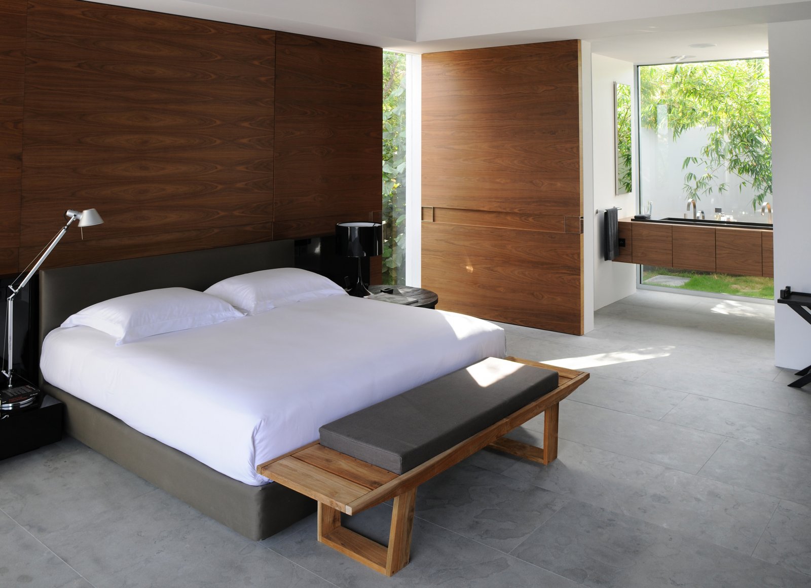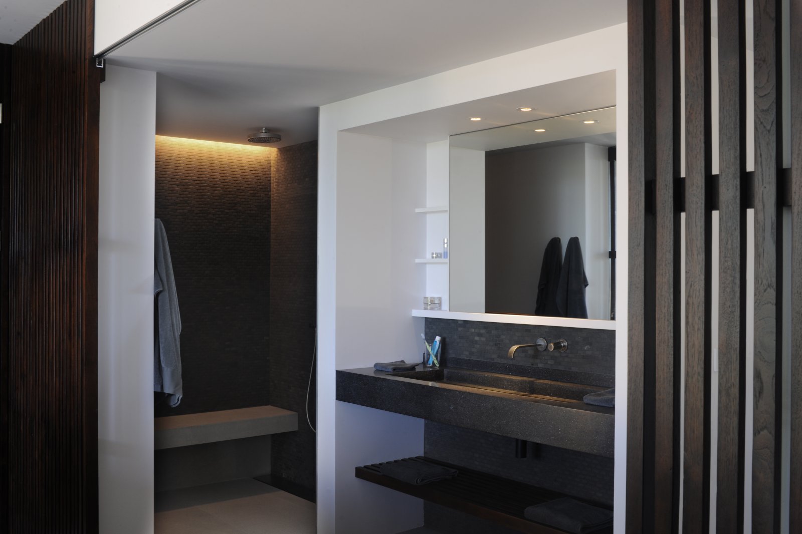A flawlessly well-appointed master suite anchors the main floor of this St. Barts villa. Understated elegance defines the space and furnishings in this master. Contemporary and stylish with enormous windows and sliding doors that allow for considerable natural light, again blurring the lines between the indoors and out. The sizable shower and vanity are spacious yet designed to not overpower or distract from the purity of the room.