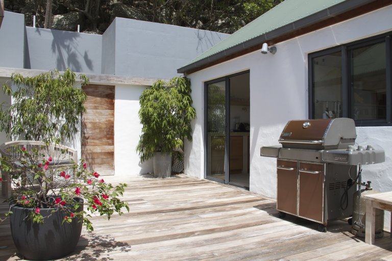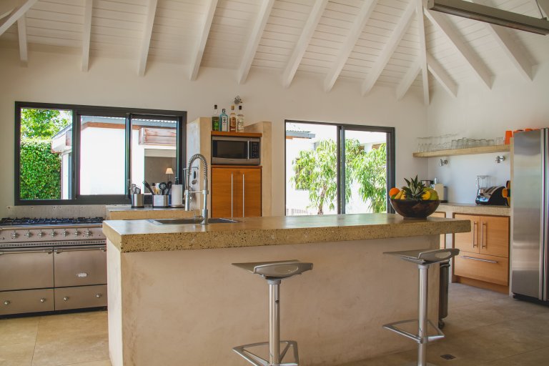 A set of stairs leads up from the poolside to the villa’s covered, ocean-view deck. Guests can relax in the shade and still enjoy ocean breezes. They can also sit down at the alfresco dining table with seats for eight guests. You can prepare meals outside on the barbecue grill or inside in the sleek, modern kitchen.