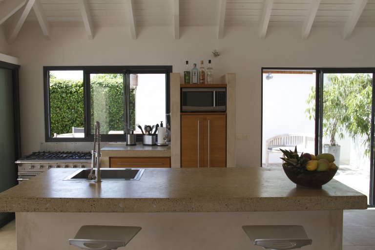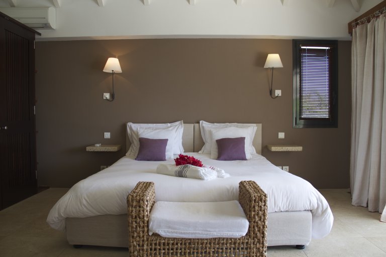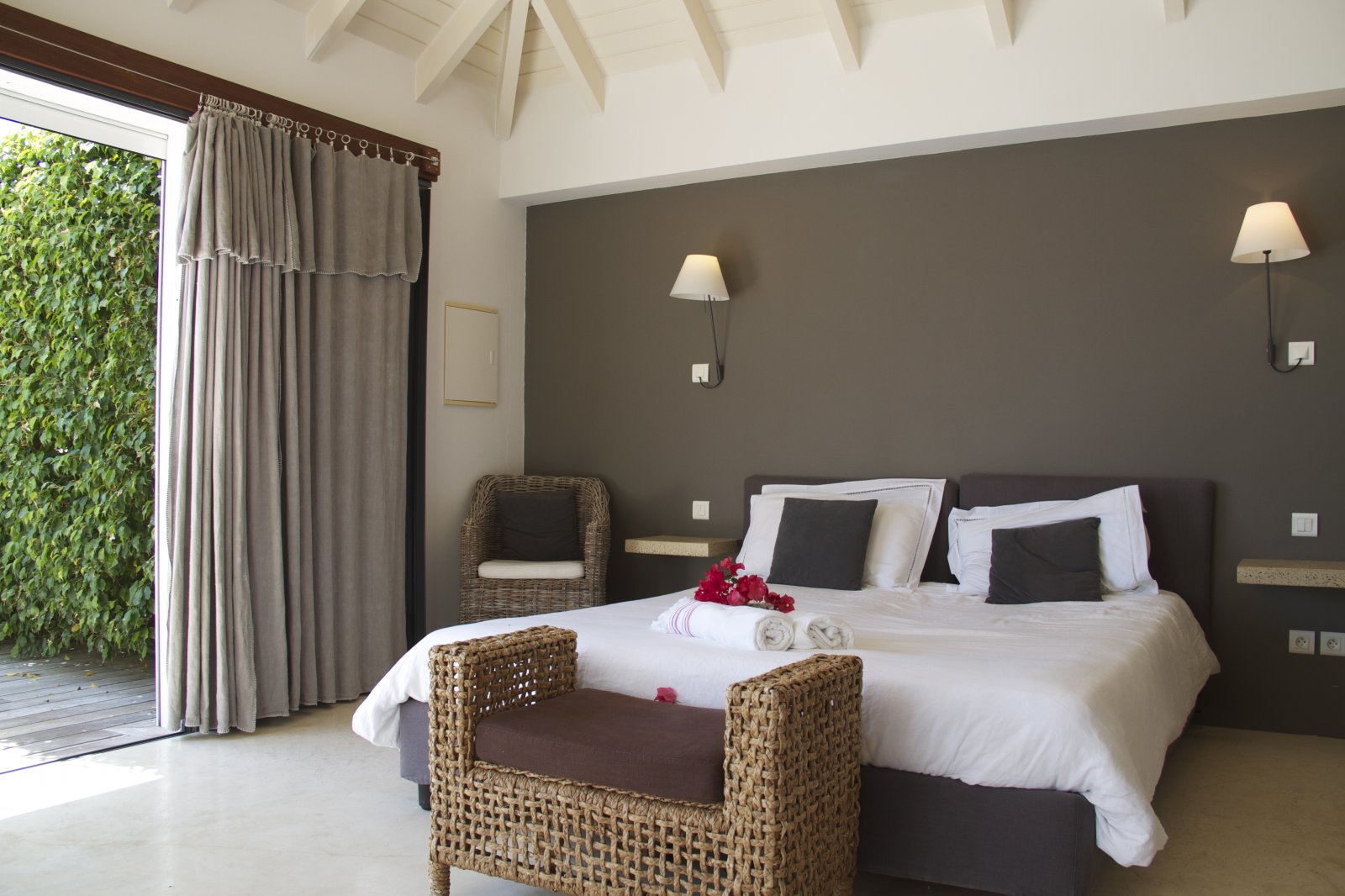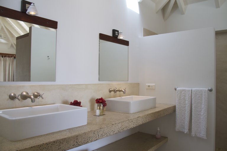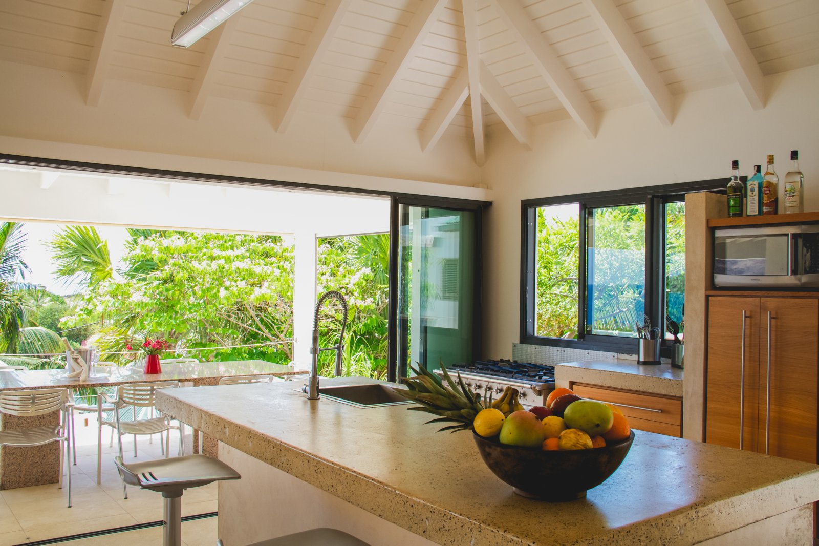 One bedroom, located adjacent to the living room in the main house, has a king-size bed that can be converted into two twin-size beds and an en-suite bathroom. A set of doors offers direct access to the outdoor terrace and pool. The other two bedrooms at Villa Caribbean Blue are located in two separate bungalows. One of these bedrooms has a vaulted ceiling, a king-size bed, a walk-in closet, and an en-suite bathroom. The second bungalow has a bedroom with a king-size bed that can be converted into two twin-size beds and a walk-in closet. Each of the villa’s bedrooms has a ceiling fan, air-conditioning, and a HDTV.