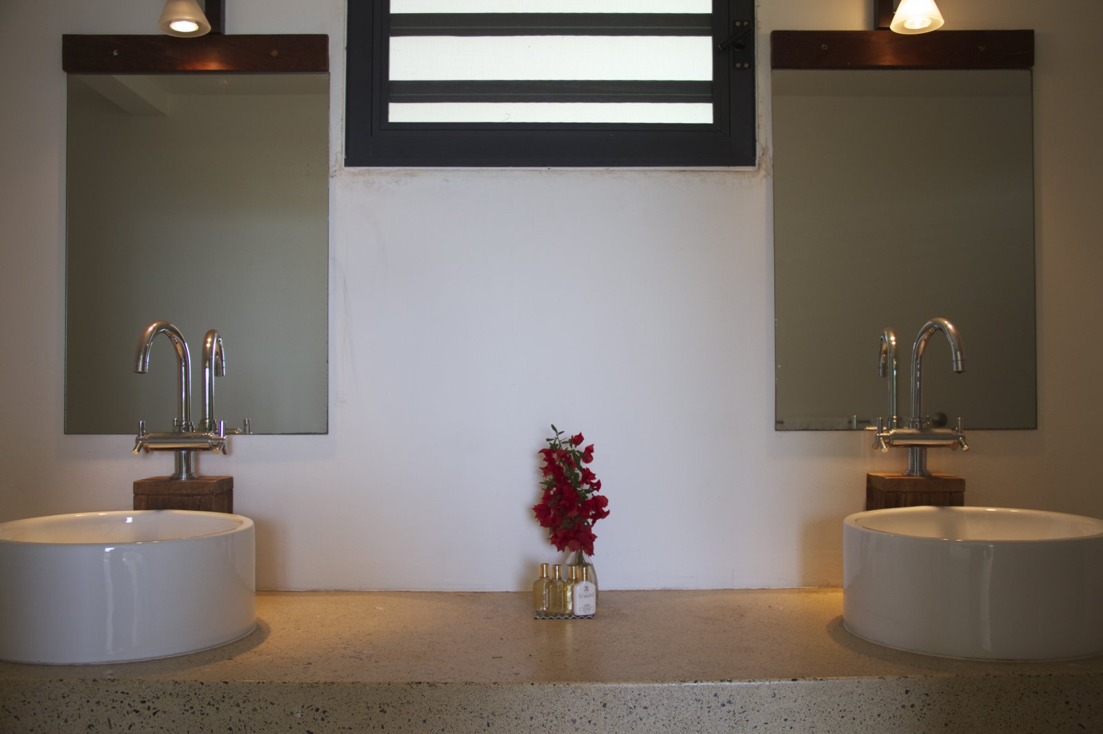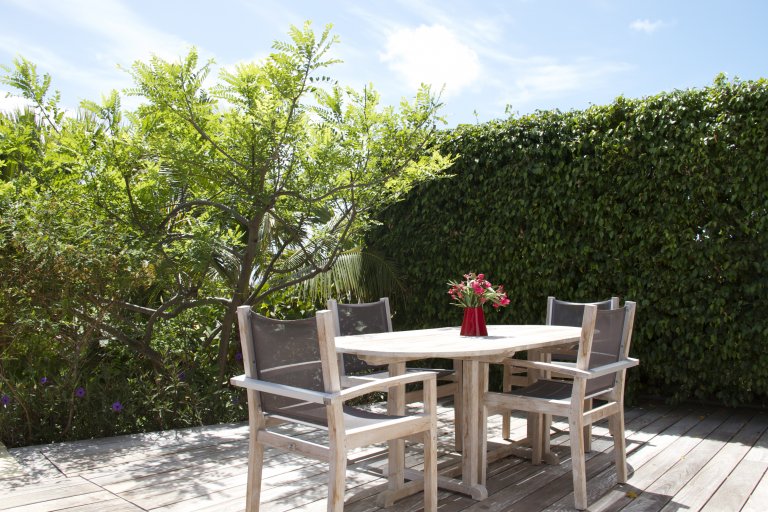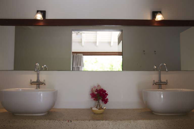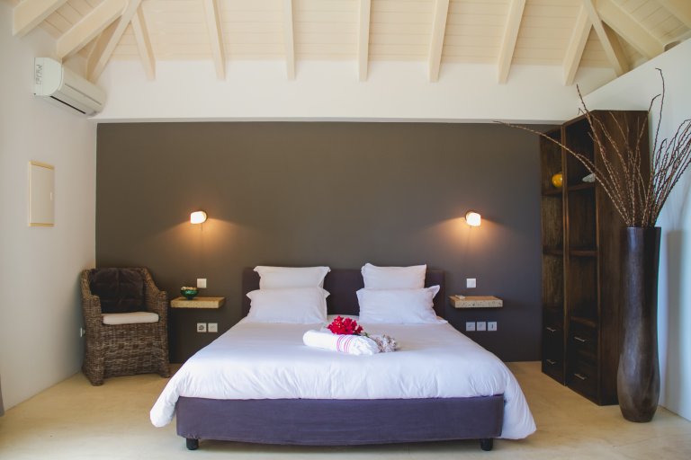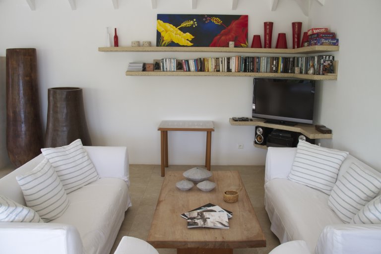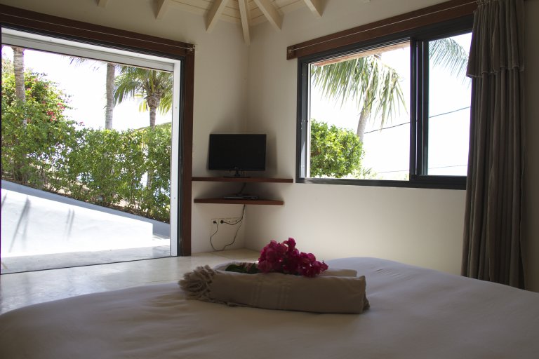 One bedroom, located adjacent to the living room in the main house, has a king-size bed that can be converted into two twin-size beds and an en-suite bathroom. A set of doors offers direct access to the outdoor terrace and pool. The other two bedrooms at Villa Caribbean Blue are located in two separate bungalows. One of these bedrooms has a vaulted ceiling, a king-size bed, a walk-in closet, and an en-suite bathroom. The second bungalow has a bedroom with a king-size bed that can be converted into two twin-size beds and a walk-in closet. Each of the villa’s bedrooms has a ceiling fan, air-conditioning, and a HDTV.