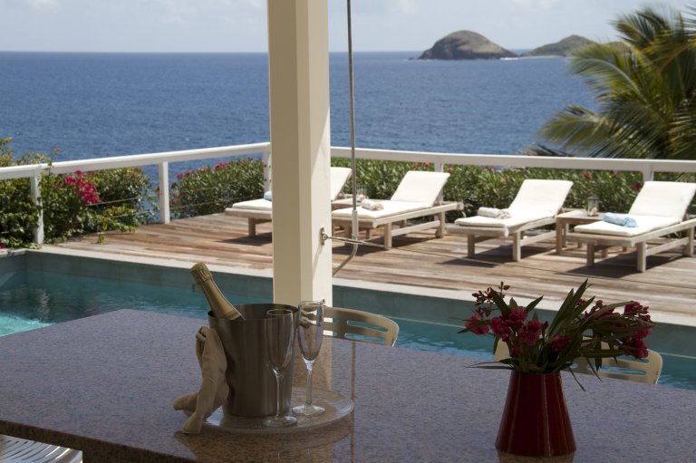 The focal point of the outdoor terrace at Villa Caribbean Blue is a large heated pool that overlooks the ocean. Guests can descend the pool’s steps and take a dip in the crystal clear water. Afterward, the sun deck – complete with chaise lounges – makes the perfect place to soak up the tropical sunshine.