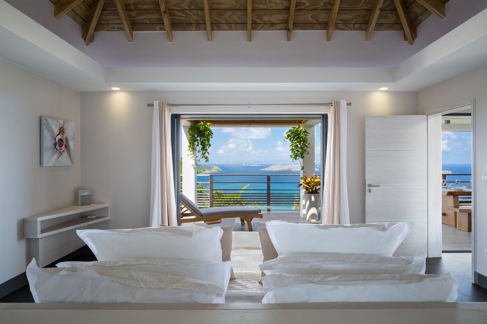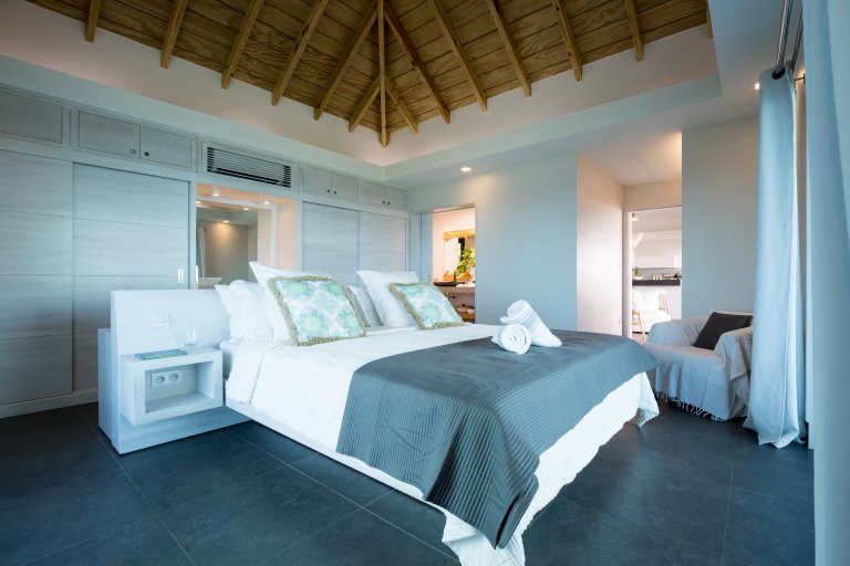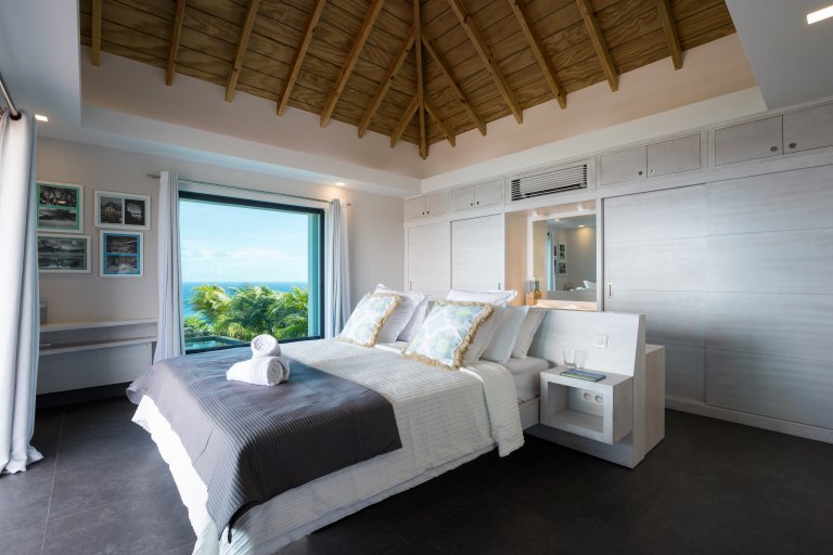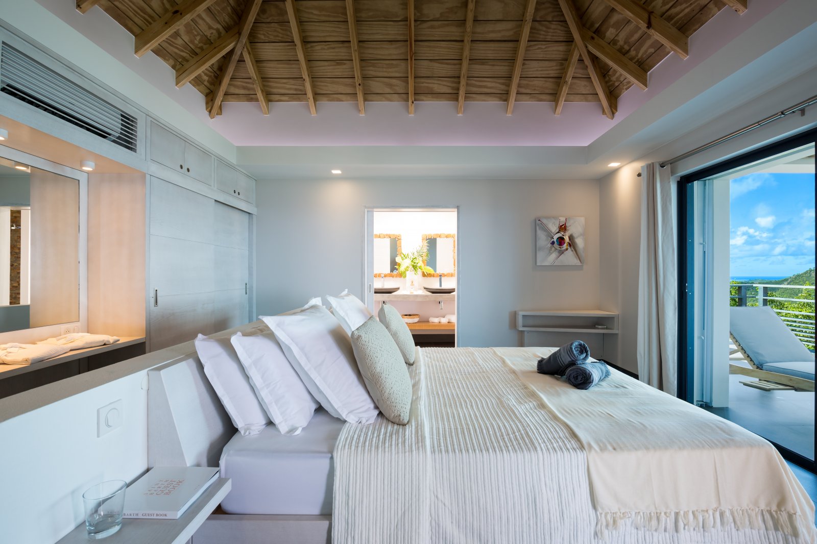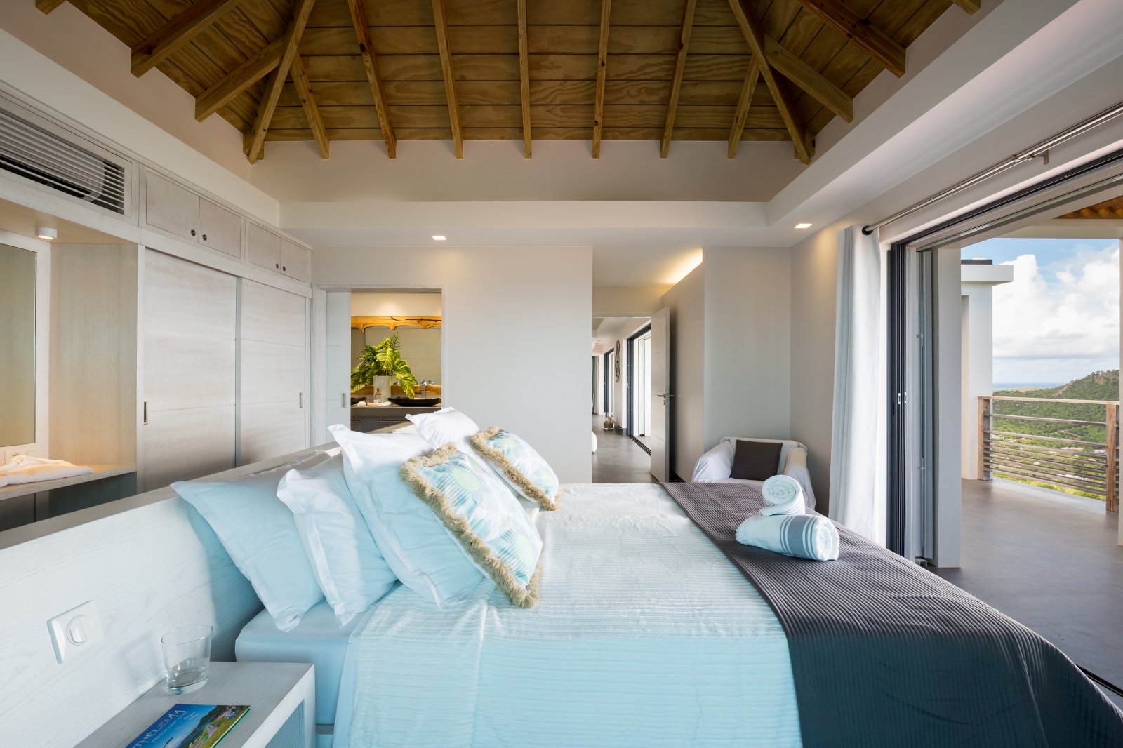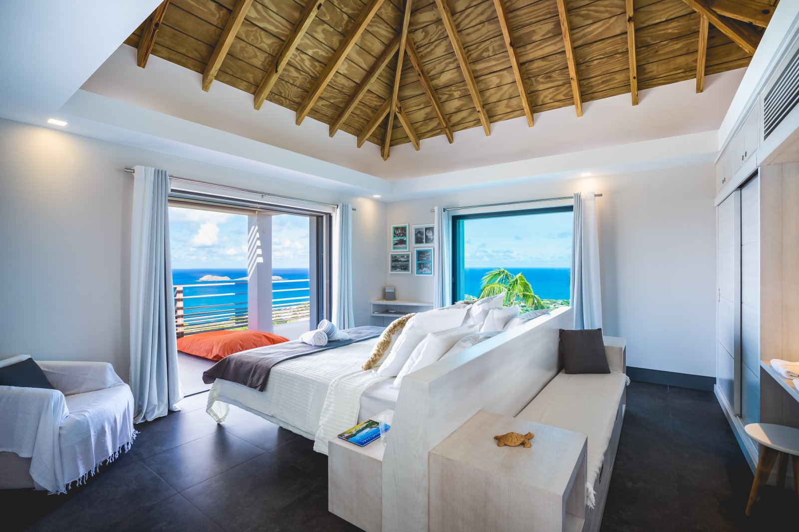 This Caribbean villa has luxurious touches that make it an ideal place to spend time when you are not outside enjoying the sunshine. You can relax on furniture constructed from reclaimed and weathered wood. Throws and cushions in bright colors add a cheerful note to the living area. These details and colorful artwork on the walls make this St. Barts villa feel like a home. It is set up so you can get together with others in the living area or out on the terrace. If you want some quiet time alone, you can head for your spacious bedroom.
