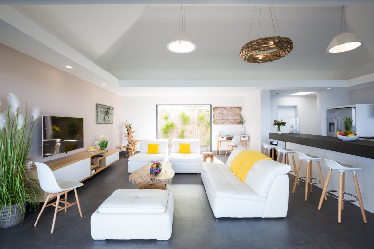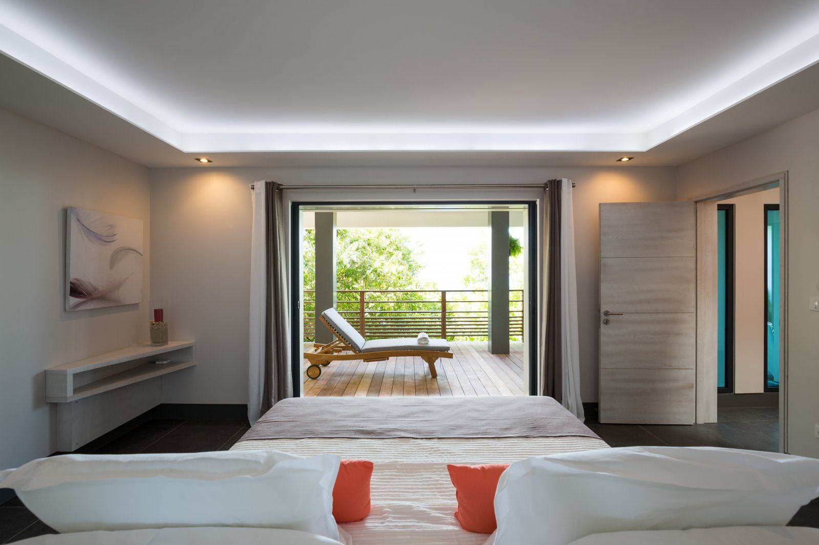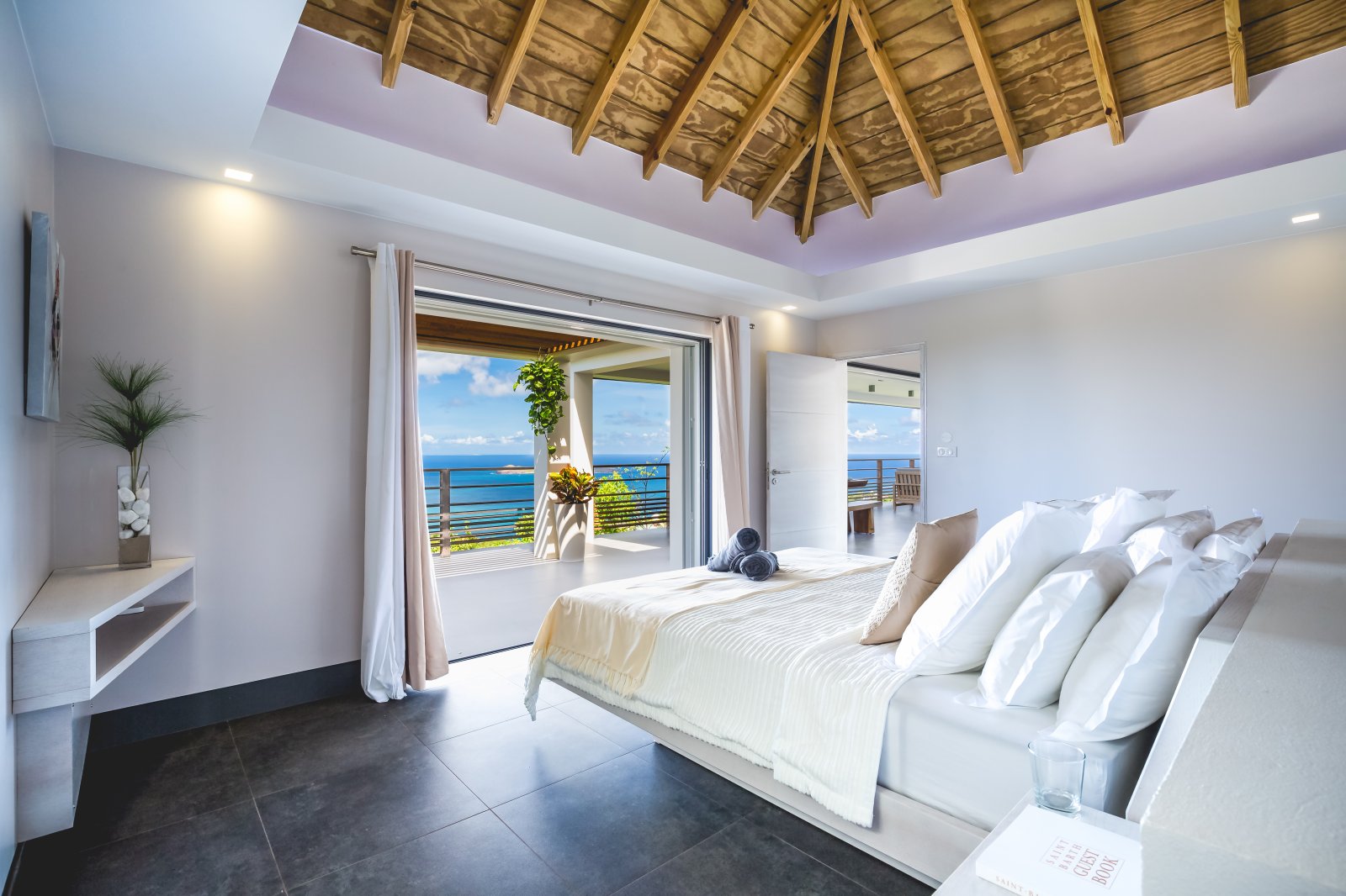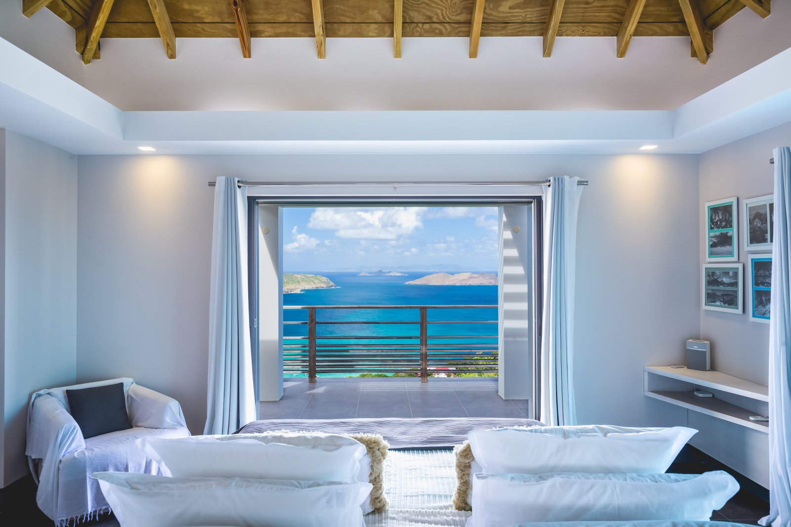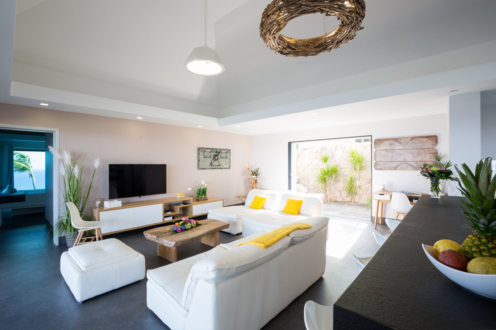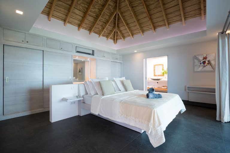 This Caribbean villa has luxurious touches that make it an ideal place to spend time when you are not outside enjoying the sunshine. You can relax on furniture constructed from reclaimed and weathered wood. Throws and cushions in bright colors add a cheerful note to the living area. These details and colorful artwork on the walls make this St. Barts villa feel like a home. It is set up so you can get together with others in the living area or out on the terrace. If you want some quiet time alone, you can head for your spacious bedroom.