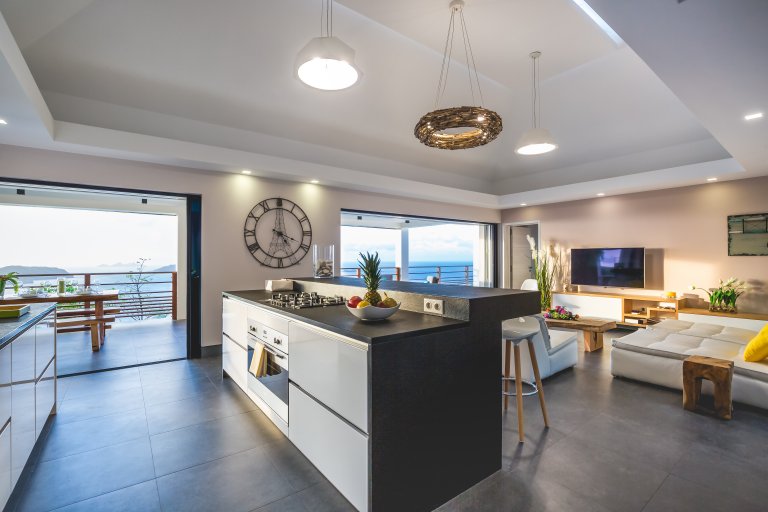 You can also enjoy spectacular views when you are inside. The kitchen has glass doors that lead to the terrace. Retractable walls in the living area open to the terrace.