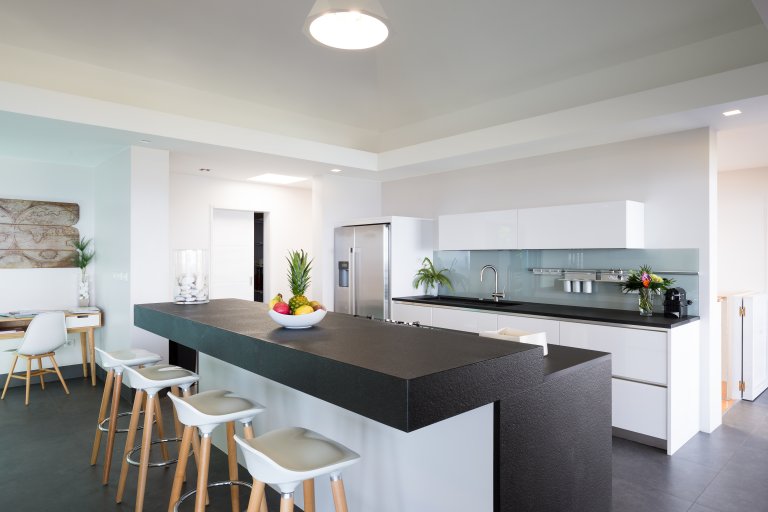 The kitchen has everything you need to prepare breakfast before you head out for fun in the sun on St. Barts. Use the espresso machine or coffee maker to prepare your morning beverage. You can use the waffle iron, the toaster or the oven to make breakfast. The kitchen also has a microwave and a blender.