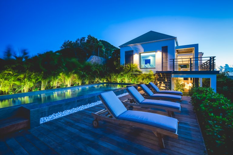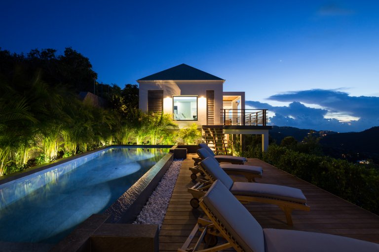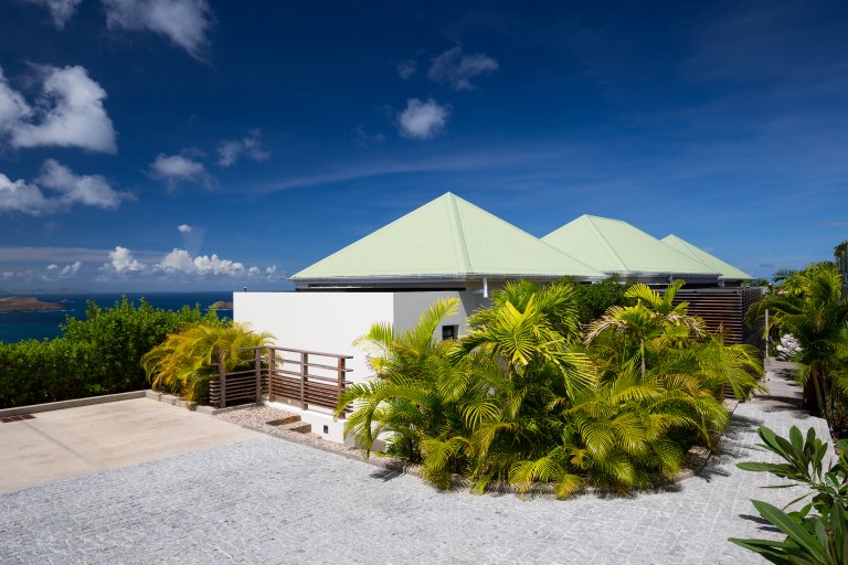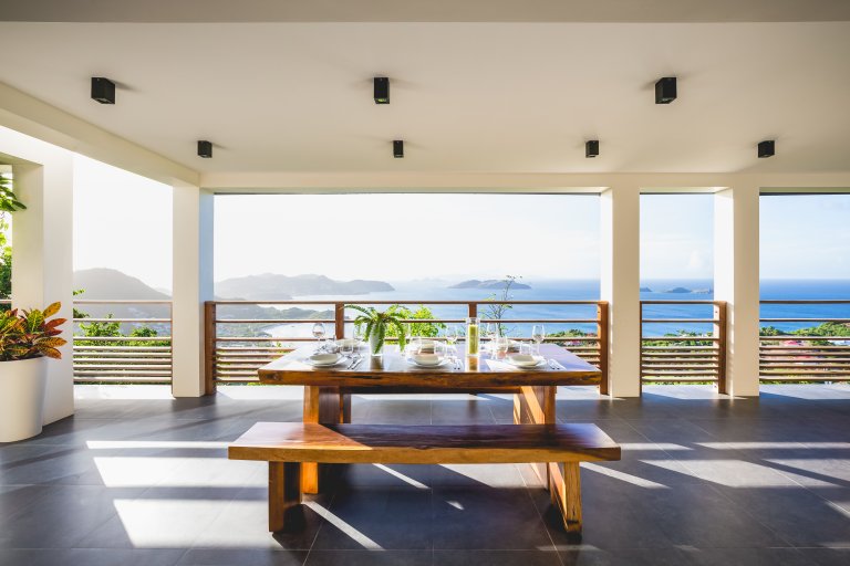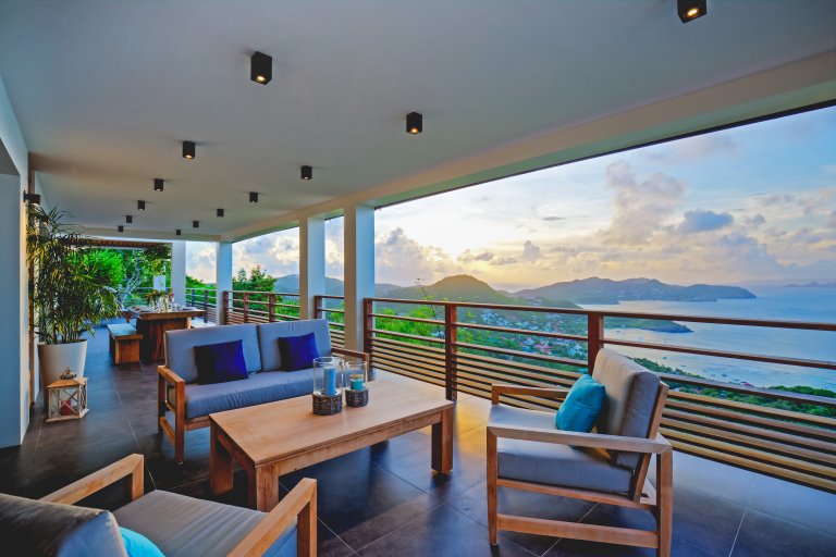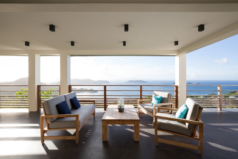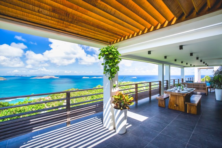 The view from this modern villa down on the water of Lorient Bay in St. Barhs is staggering. Totally modern and positioned to take advantage of the view, the home has an epic covered terrace that naturally draws you outside and into the landscape.