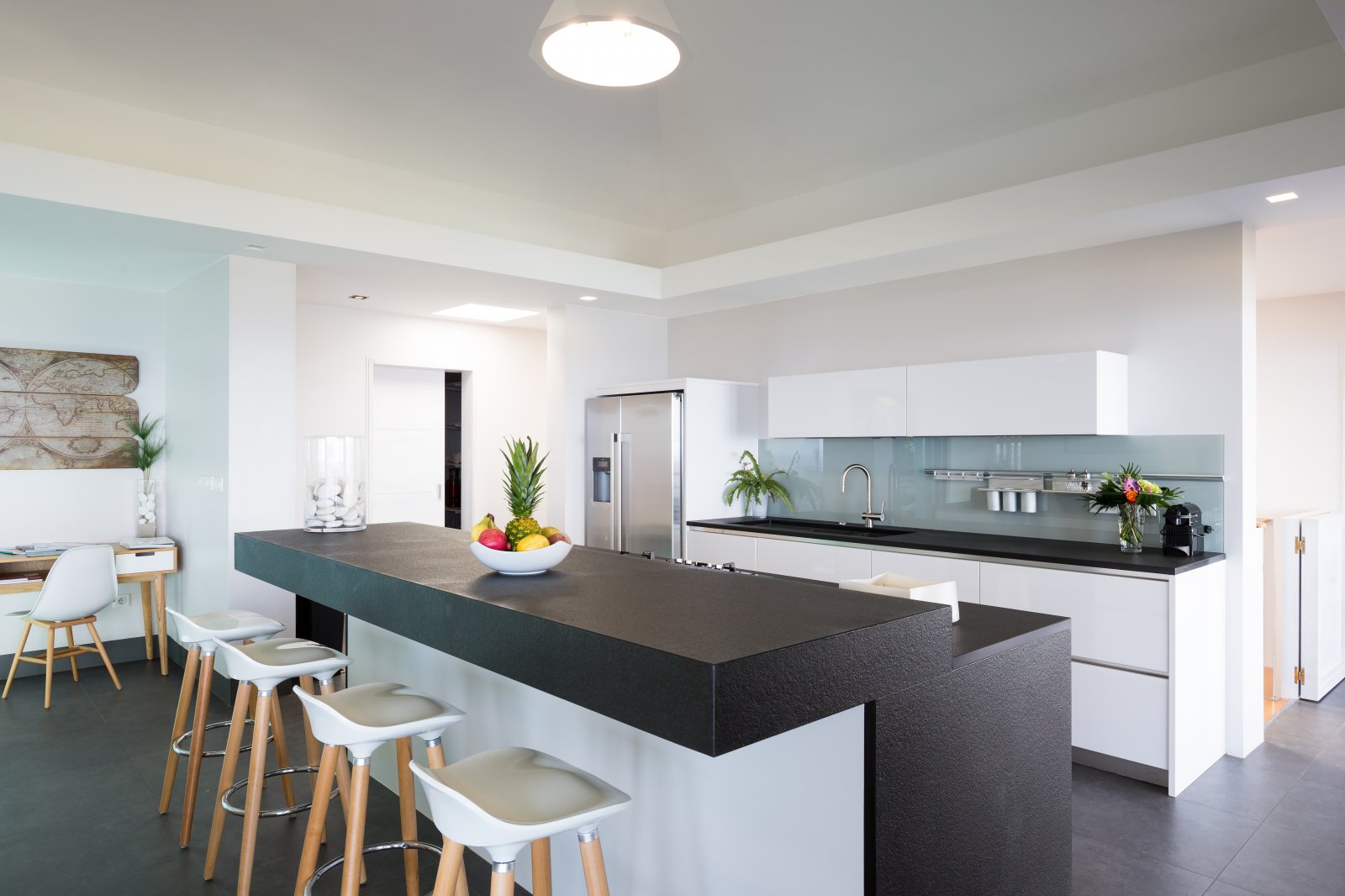 Rooms in the spacious living area flow into one another. The chairs in the seating area are placed so you can enjoy a view of the water while you are watching cable television or using the Caribbean villa's Wi-Fi. High stools and a bar separate the galley kitchen from the seating area.