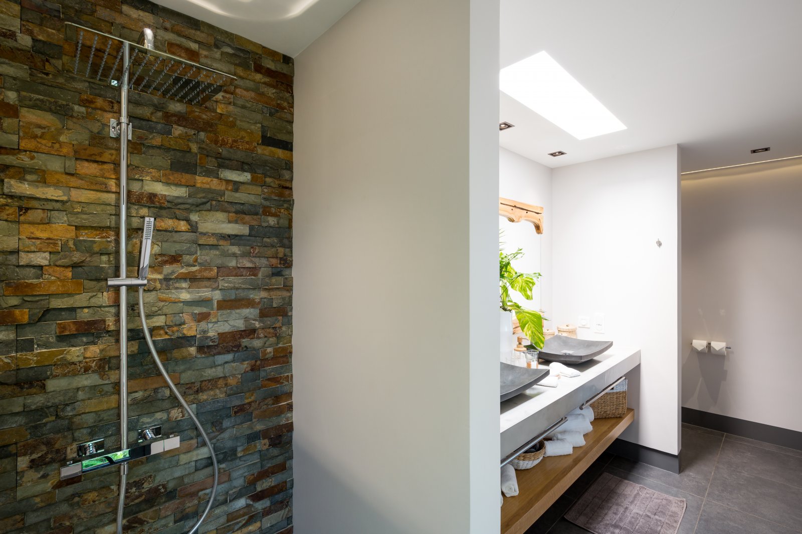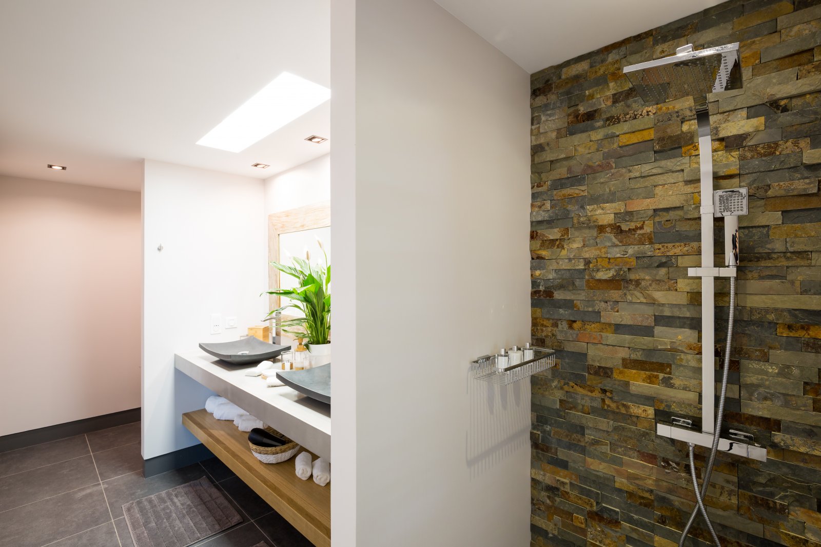 The bedroom on the lower level, close to the pool, has an outside door and can also be reached from inside the house. Every bedroom has a European king bed and an adjoining bathroom with a rain shower.