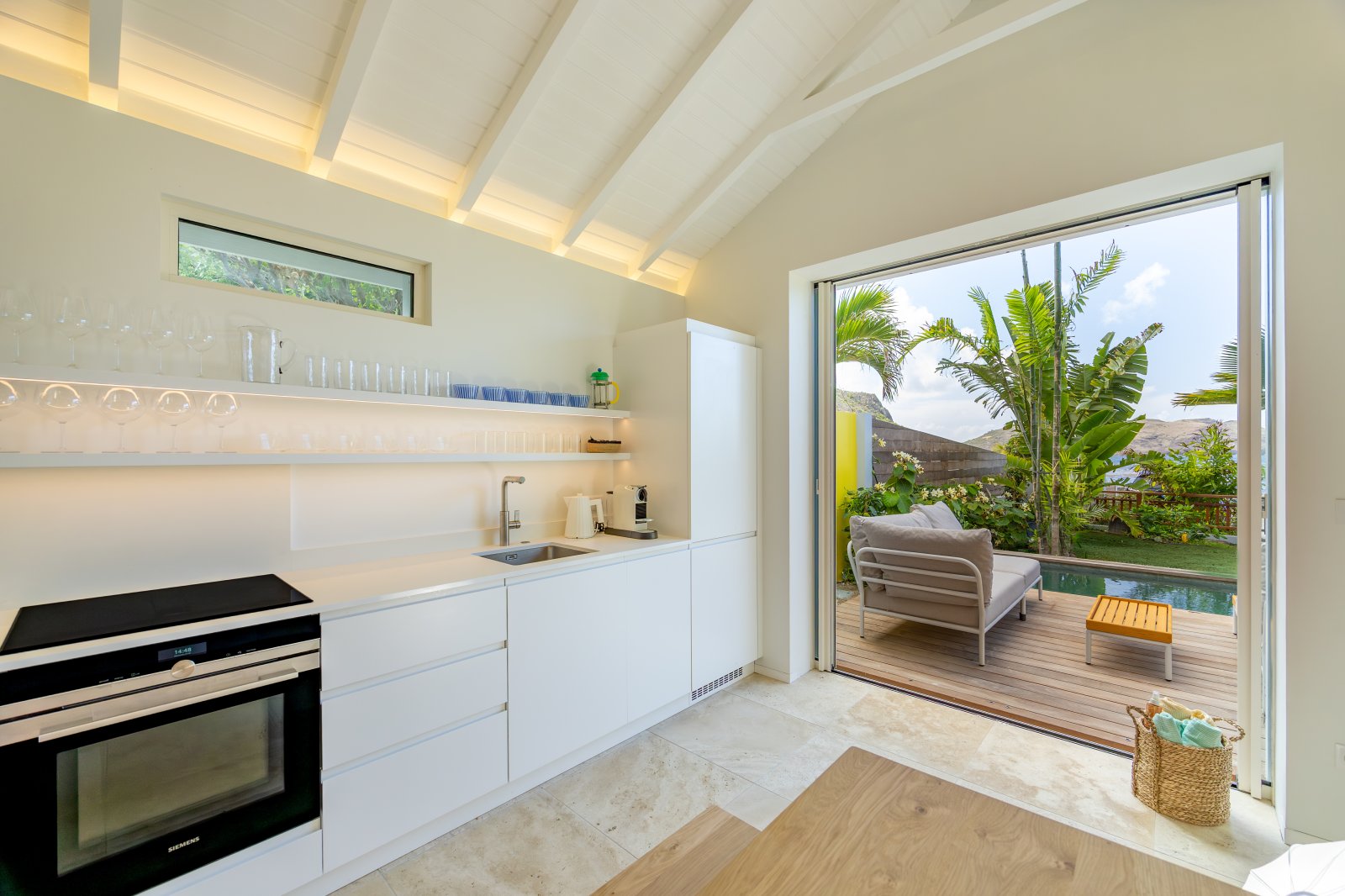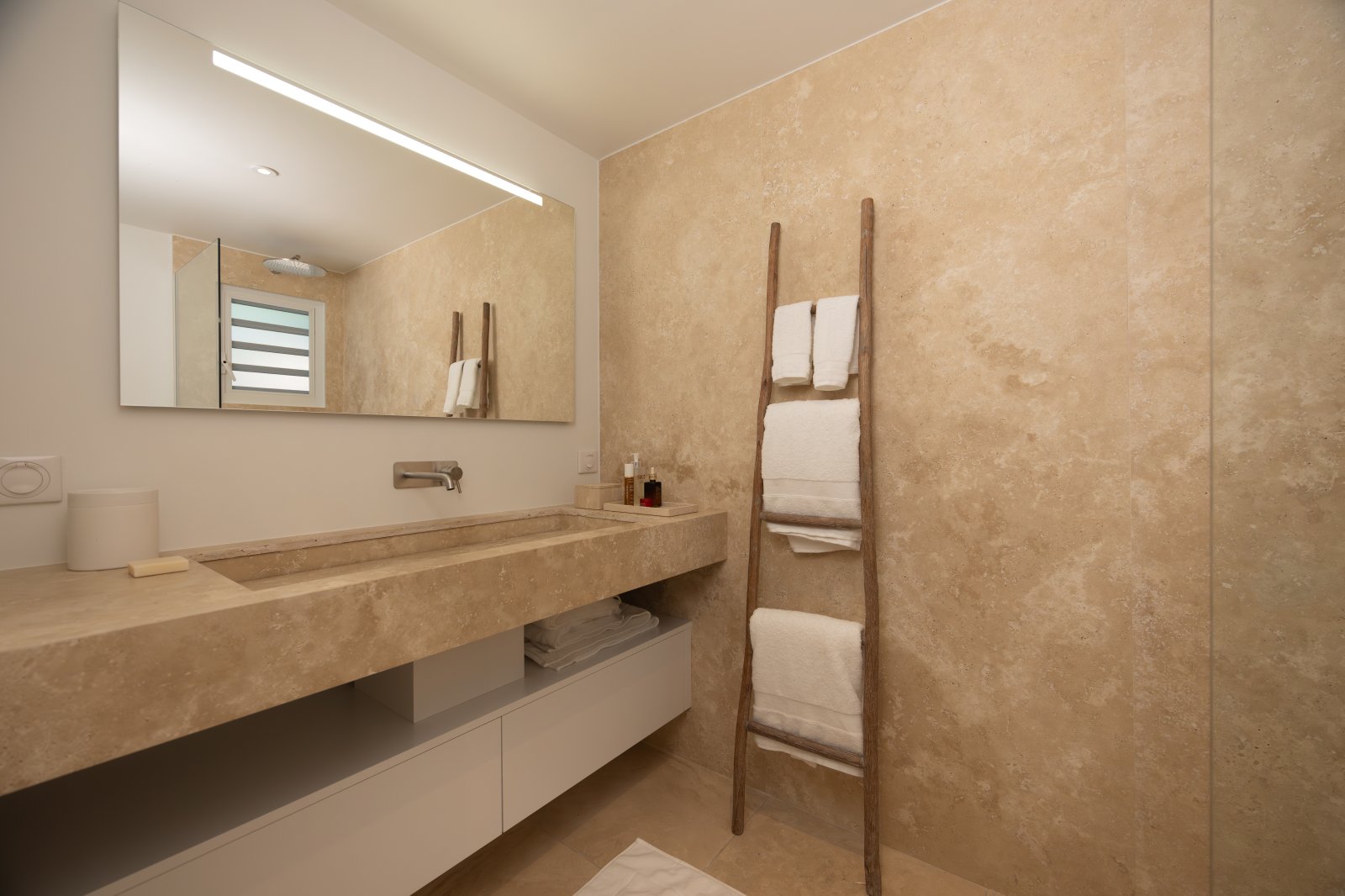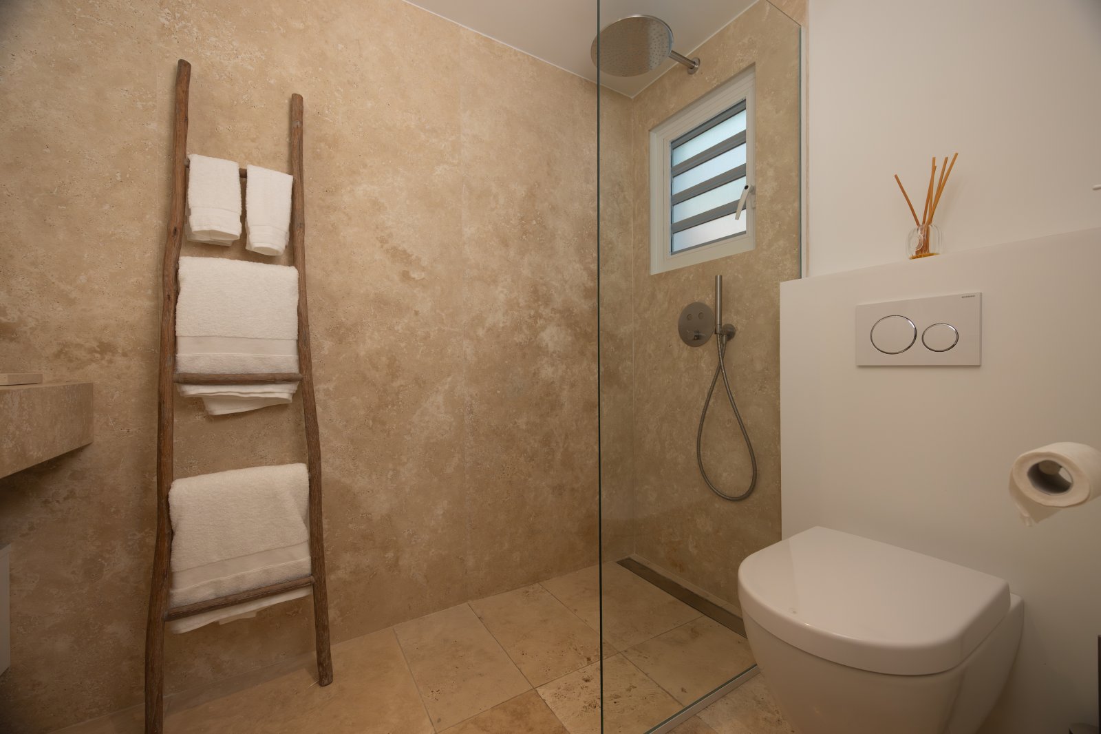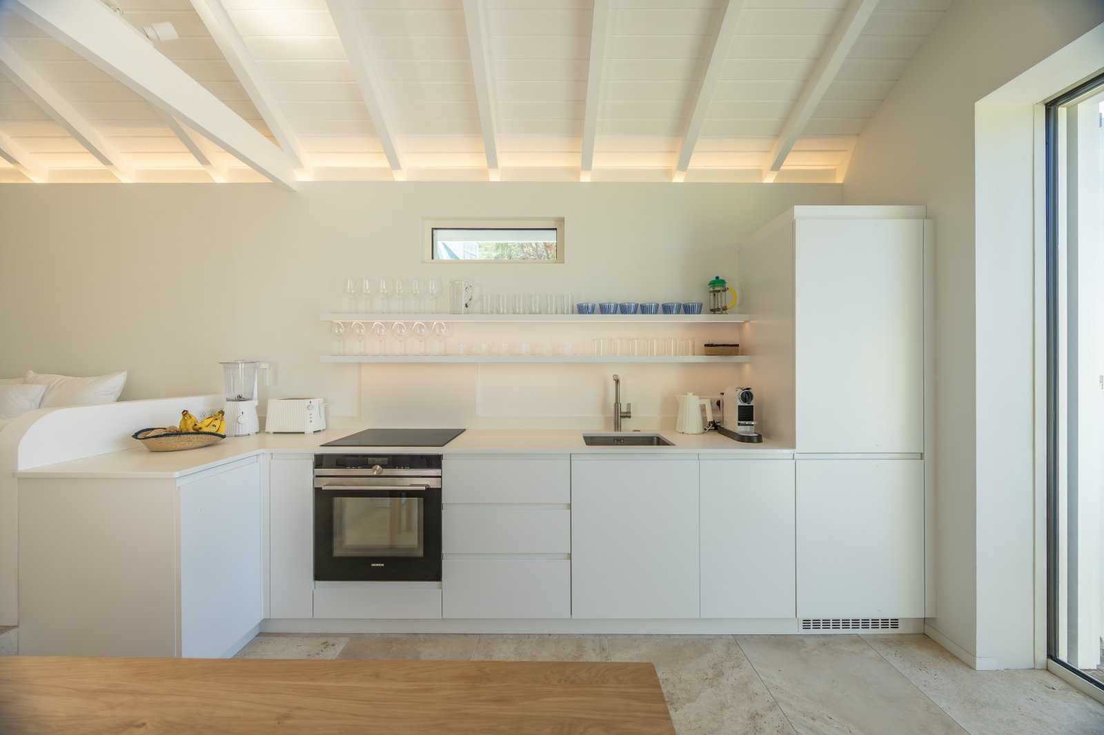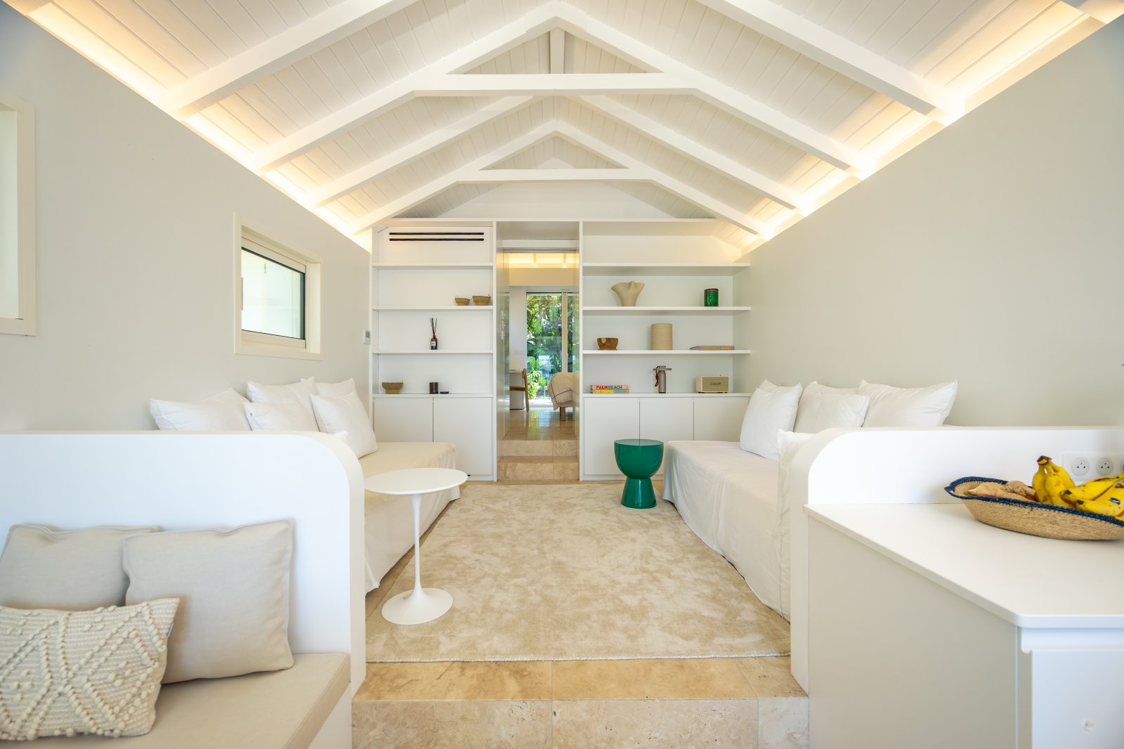 Recently renovated, The Yellow Hut balances history and modernity with ease. Natural travertine floors, whites, and clean lines keep the atmosphere contemporary, while traditional design elements root it in heritage.