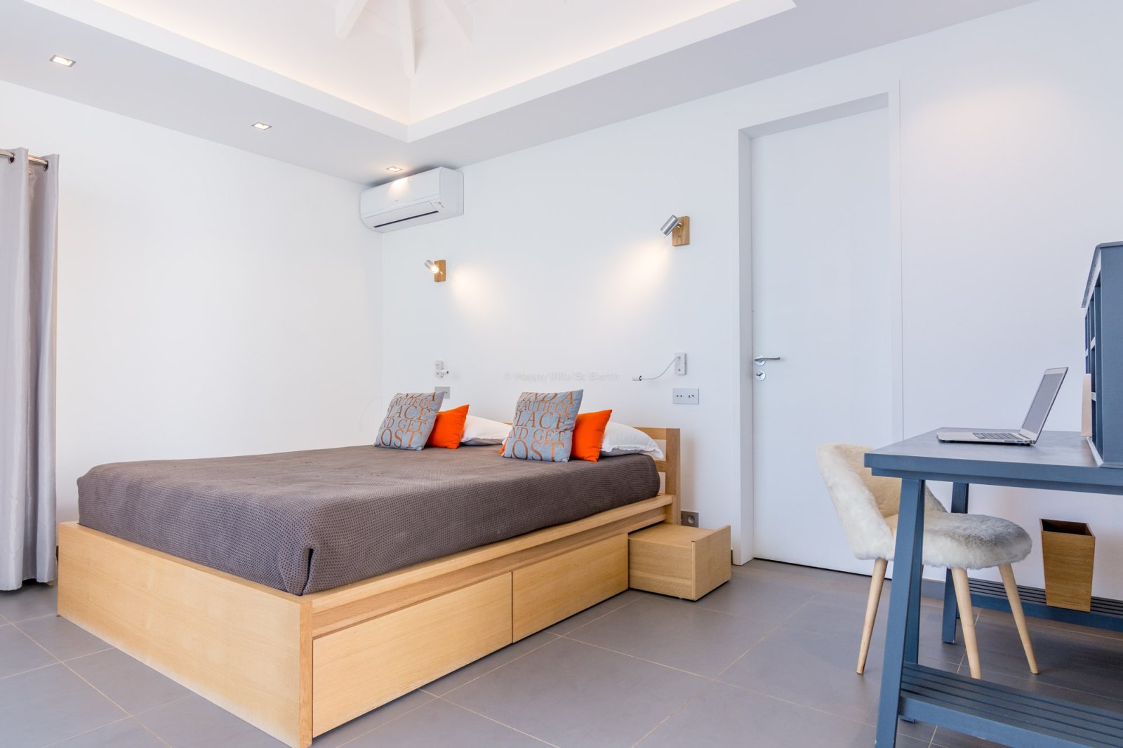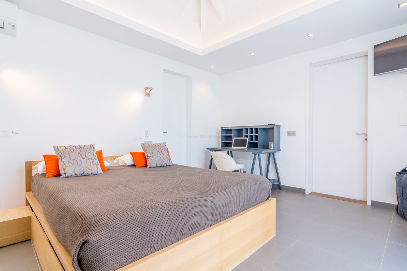 Two of the bedrooms open directly onto the deck and pool area, creating a close connection to the outdoors. The third is tucked away at the back of the house and features a semi-open bathroom with outdoor shower, adding a uniquely Caribbean touch. All three include air-conditioning, ensuite bathrooms, and a soothing, understated style.