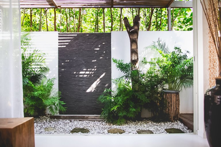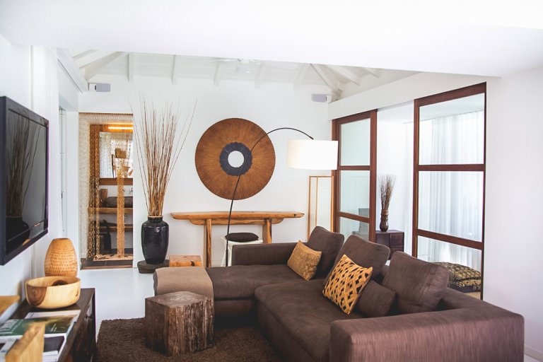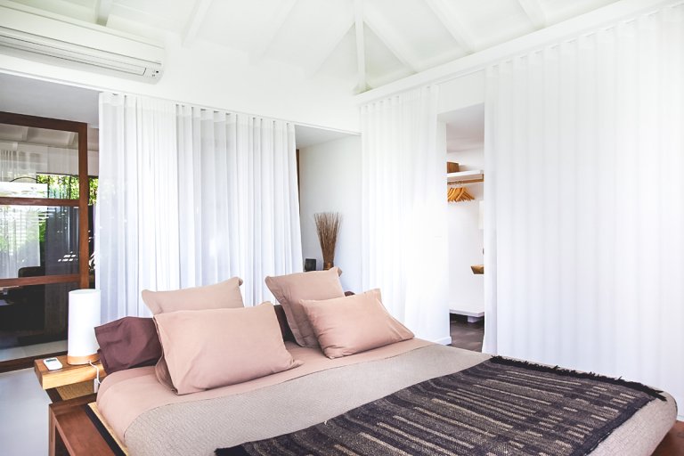 Relying on a gentle earth-tone palette and soothing textures, Villa Casamia exhibits a rare and coherent design aesthetic. An outdoor shower enclosed in bamboo, a Japanese tatami bed beside white curtains bathed in diffuse sunlight, the smooth grain of hand-carved Indonesian suar wood--such subtle design touches combine to create an extraordinarily relaxing atmosphere. You could enhance it with music, or simply enjoy the sound of the waves.