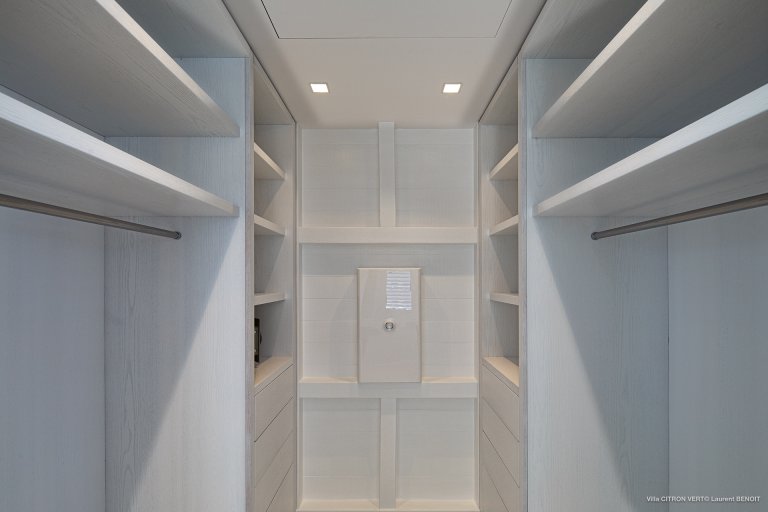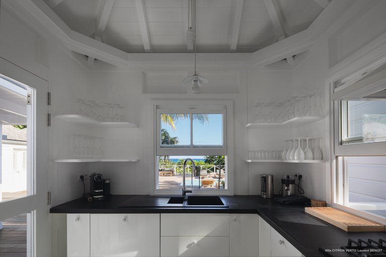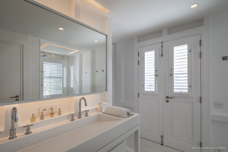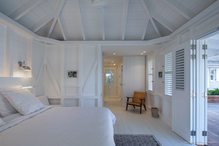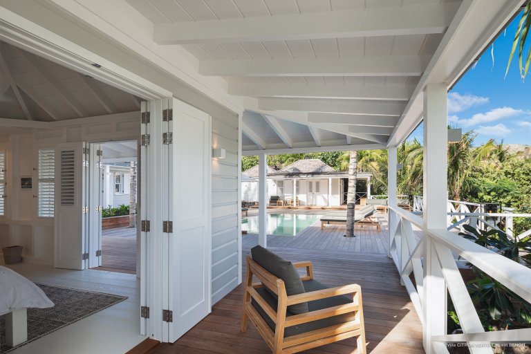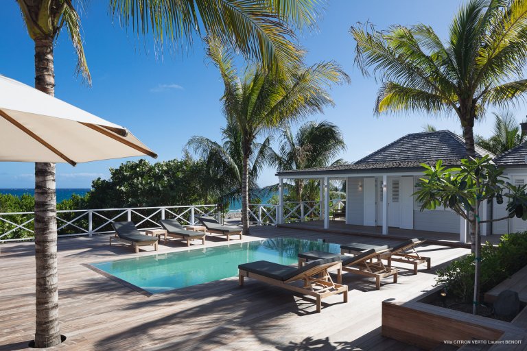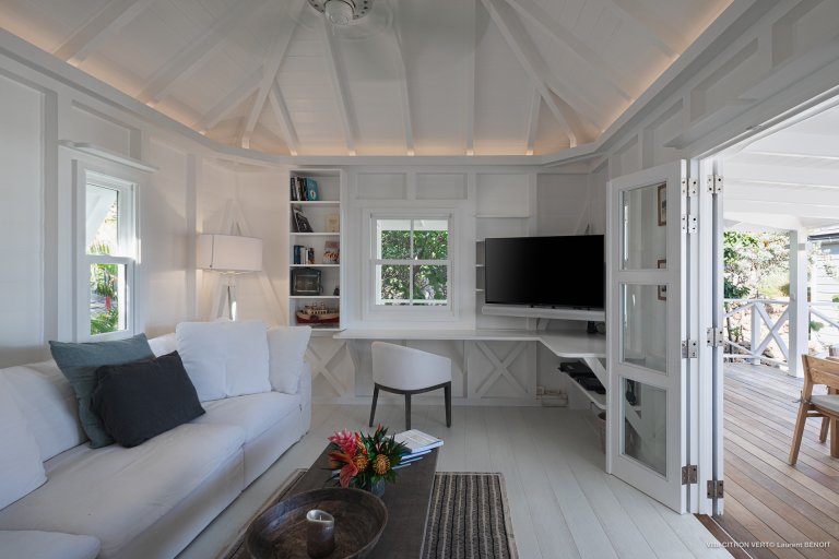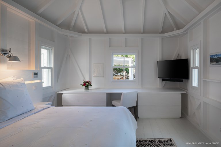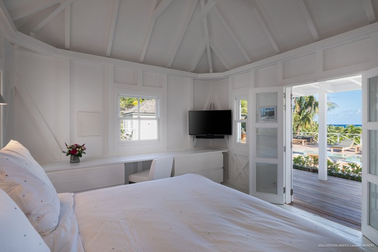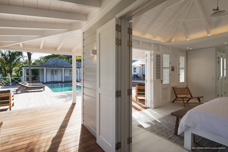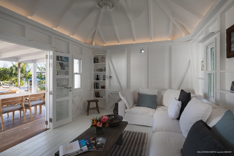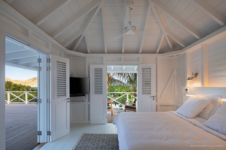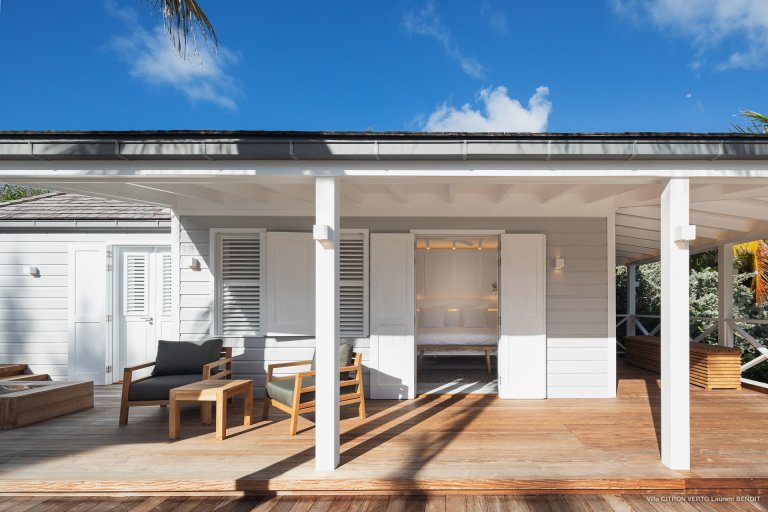 Set amid the peacefulness of Toiny’s côte sauvage, Villa Citron Vert (CVR) is a charming, romantic, and cozy hideaway for a couple. Each room of the luxury rental property occupies its own separate bungalow with a direct entrance from the terrace, on which you can find comfortable sitting areas, a dining area, and a sunny expanse with lounge chairs. The white cladding on the walls and ceiling creates the feeling of being in a classic St. Barth beach house, one where the island living is easy.
