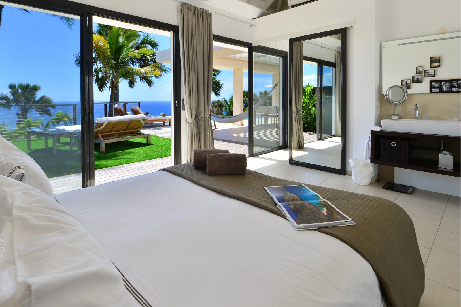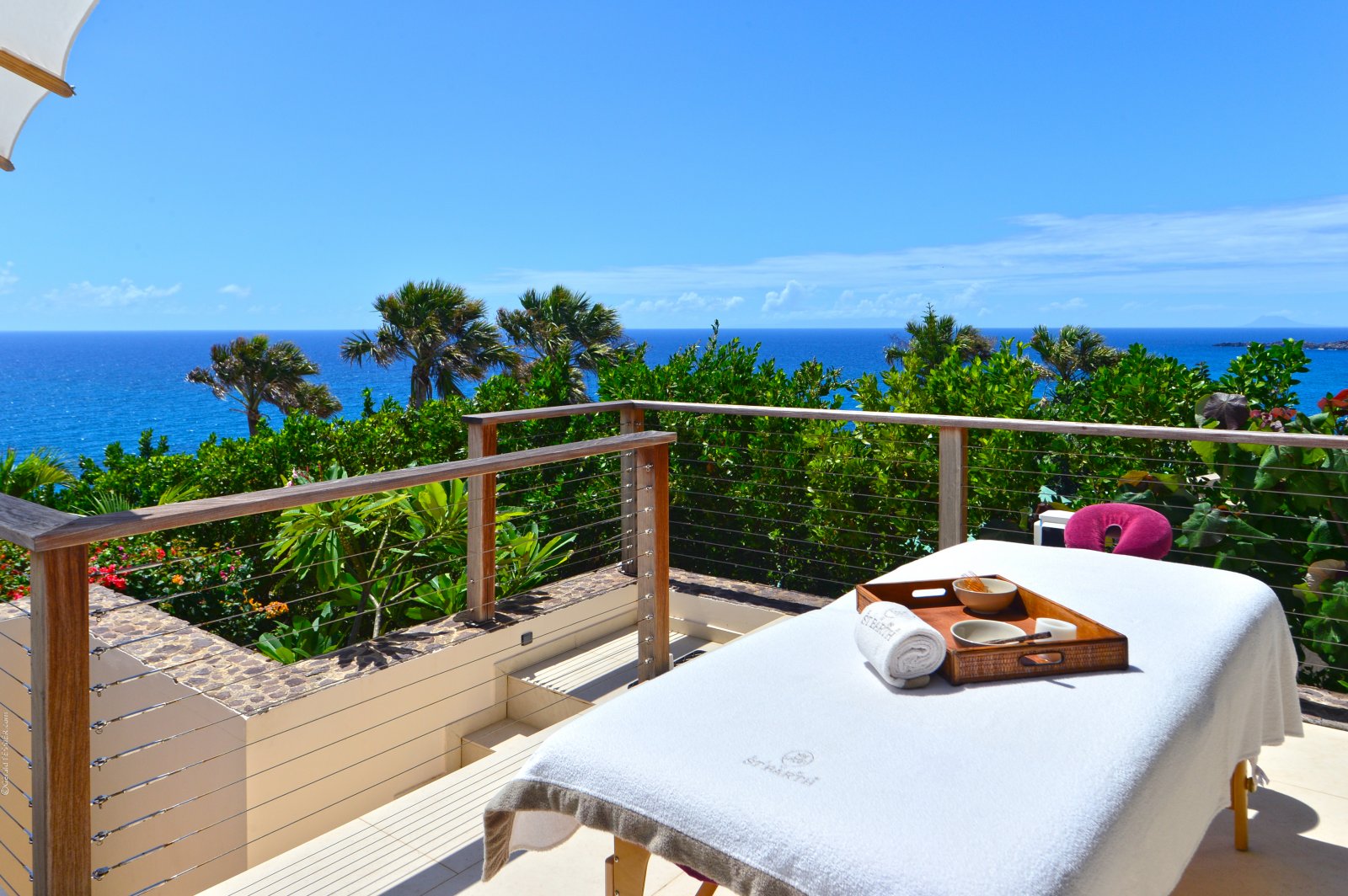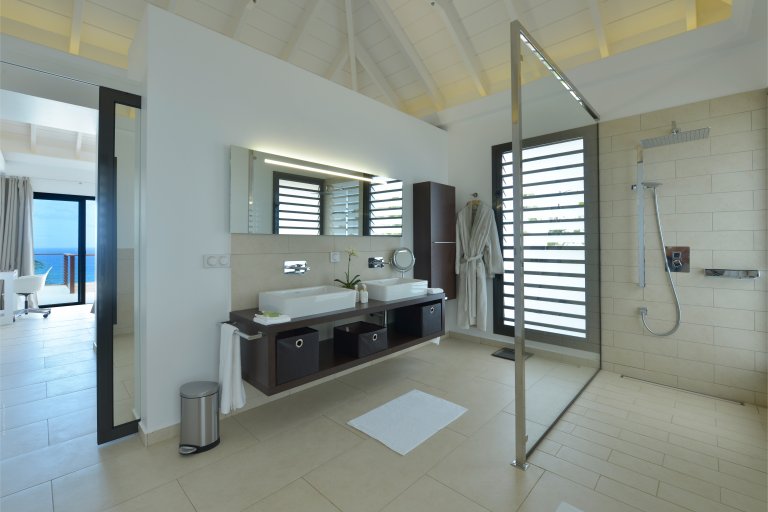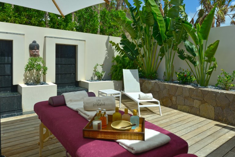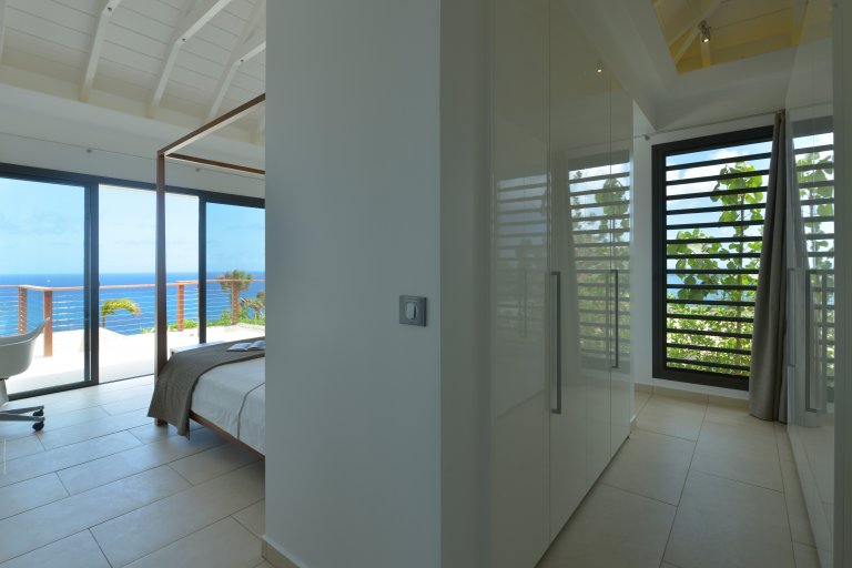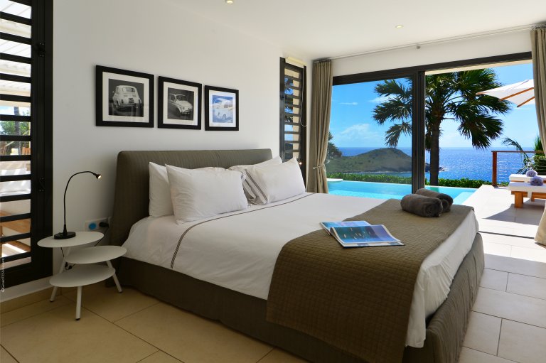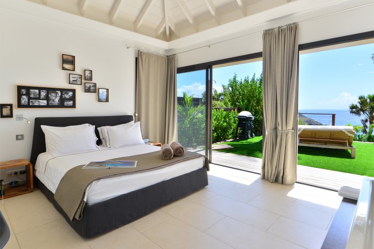 On one side lies a private bedroom with a queen bed and full ensuite bathroom. This room has wide glass doors that open onto the main terraces, as well as its own back patio with a soothing water feature. This is a great spot for massages and other spa services; therapists can easily be brought into to perform them with the island's cult-favorite Ligne St. Barth products.