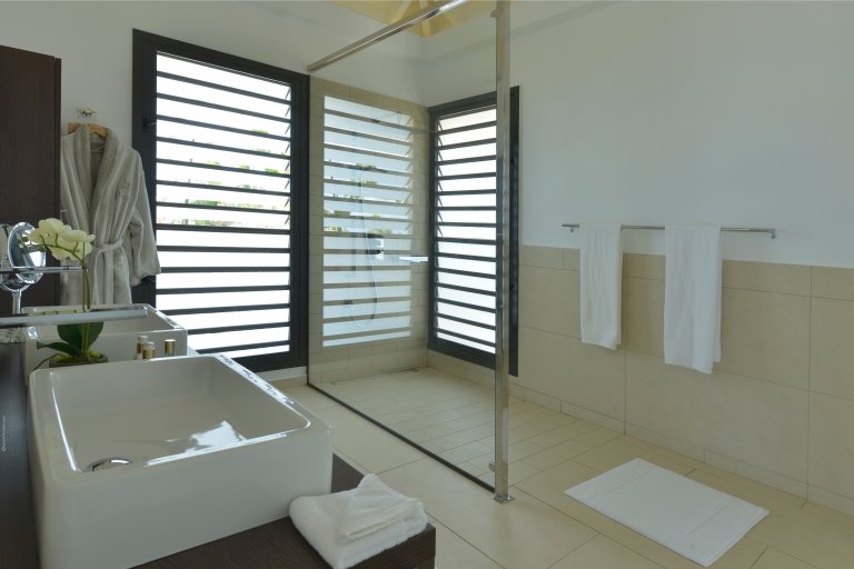 The second and third bedrooms are on the other side of the villa and best suited to families with children or easygoing adults who can be flexible with sharing space. One of them is generously sized, with a queen bed, nice dressing room, double vanity, and shower. The other is smaller, with a queen bed but no bathroom facilities. The two rooms share the WC in the guest bathroom, which is quite close by, and the shower in the larger room.