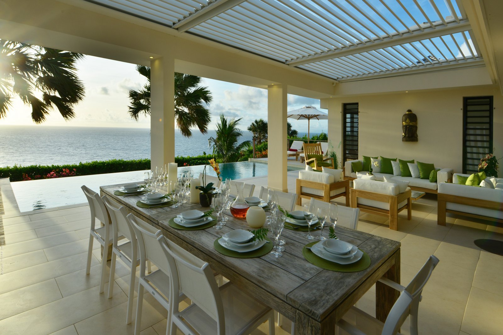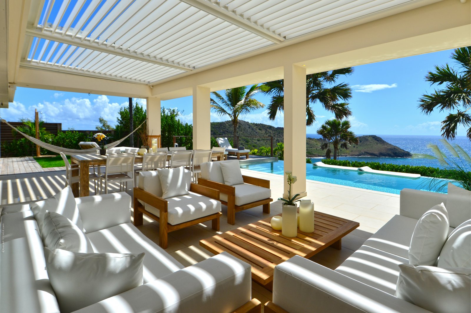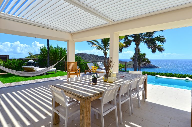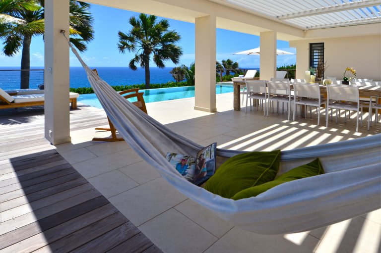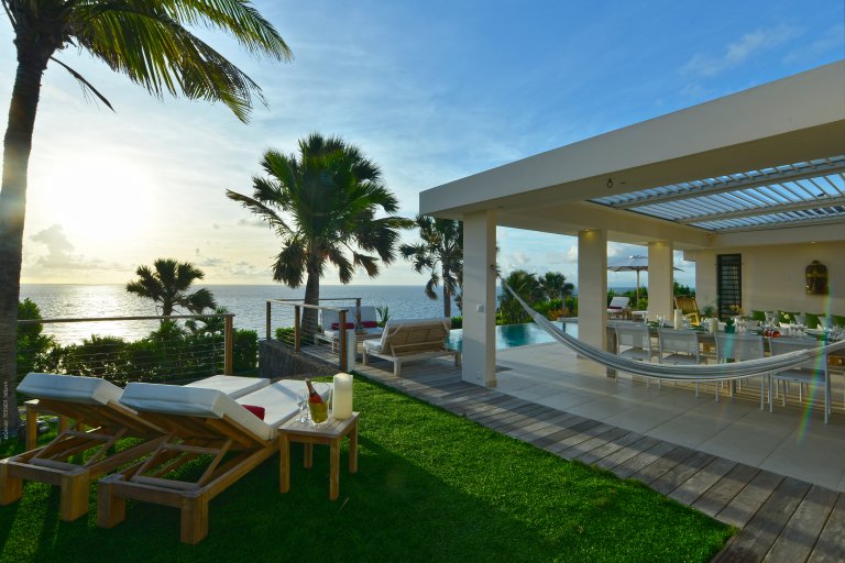 The heart of Villa Enzuma is its open living area, kitchen, and good-size terrace, which has a hammock, infinity pool, and adjustable roof that accommodates your desires for sunshine or shade. The bedrooms lie on either side of this central socializing space.