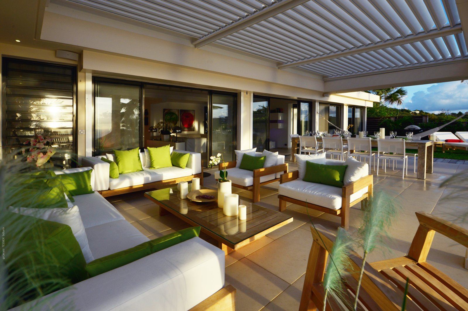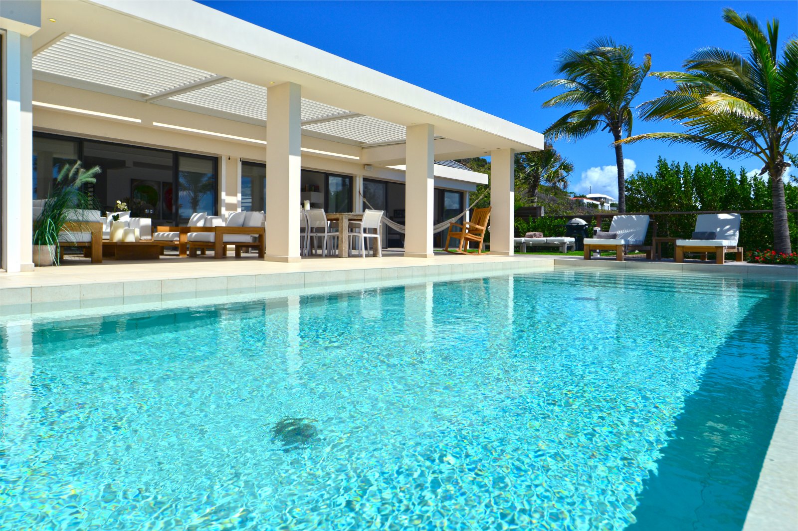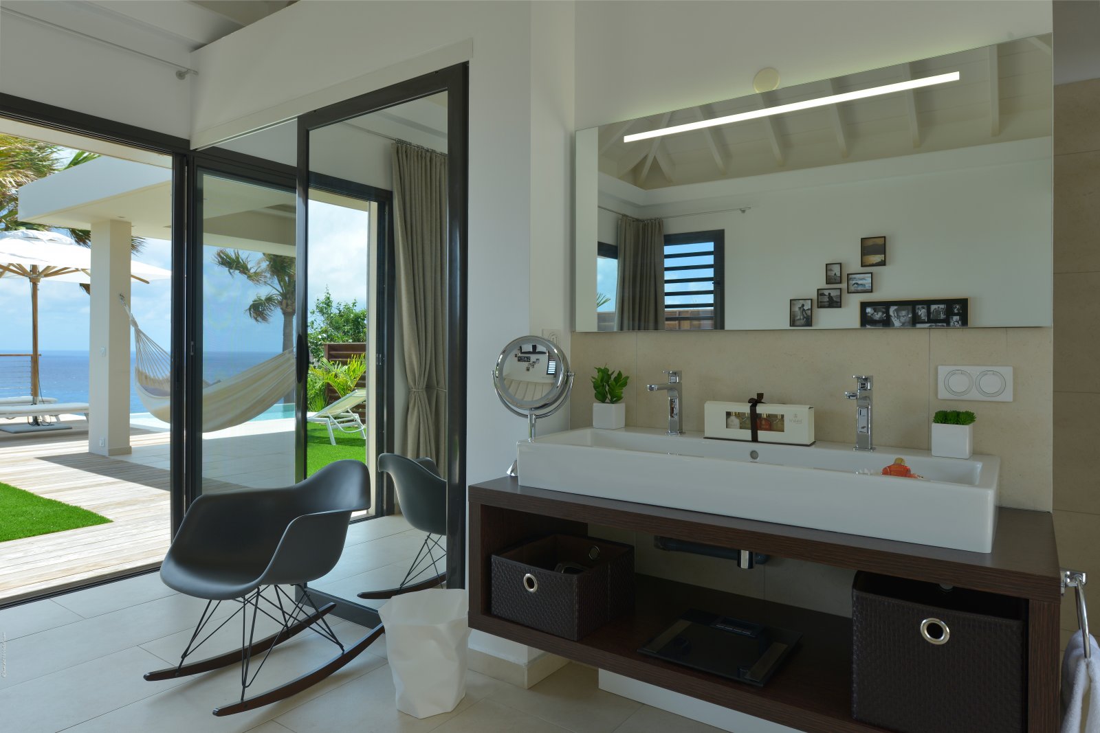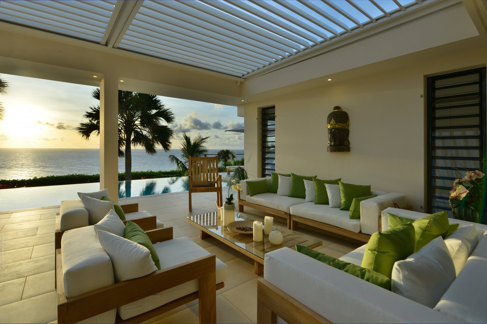 The heart of Villa Enzuma is its open living area, kitchen, and good-size terrace, which has a hammock, infinity pool, and adjustable roof that accommodates your desires for sunshine or shade. The bedrooms lie on either side of this central socializing space.