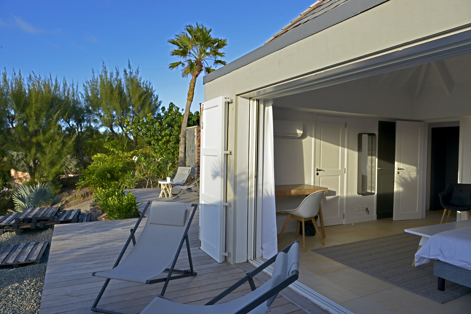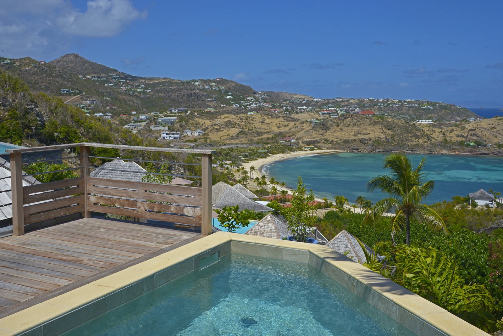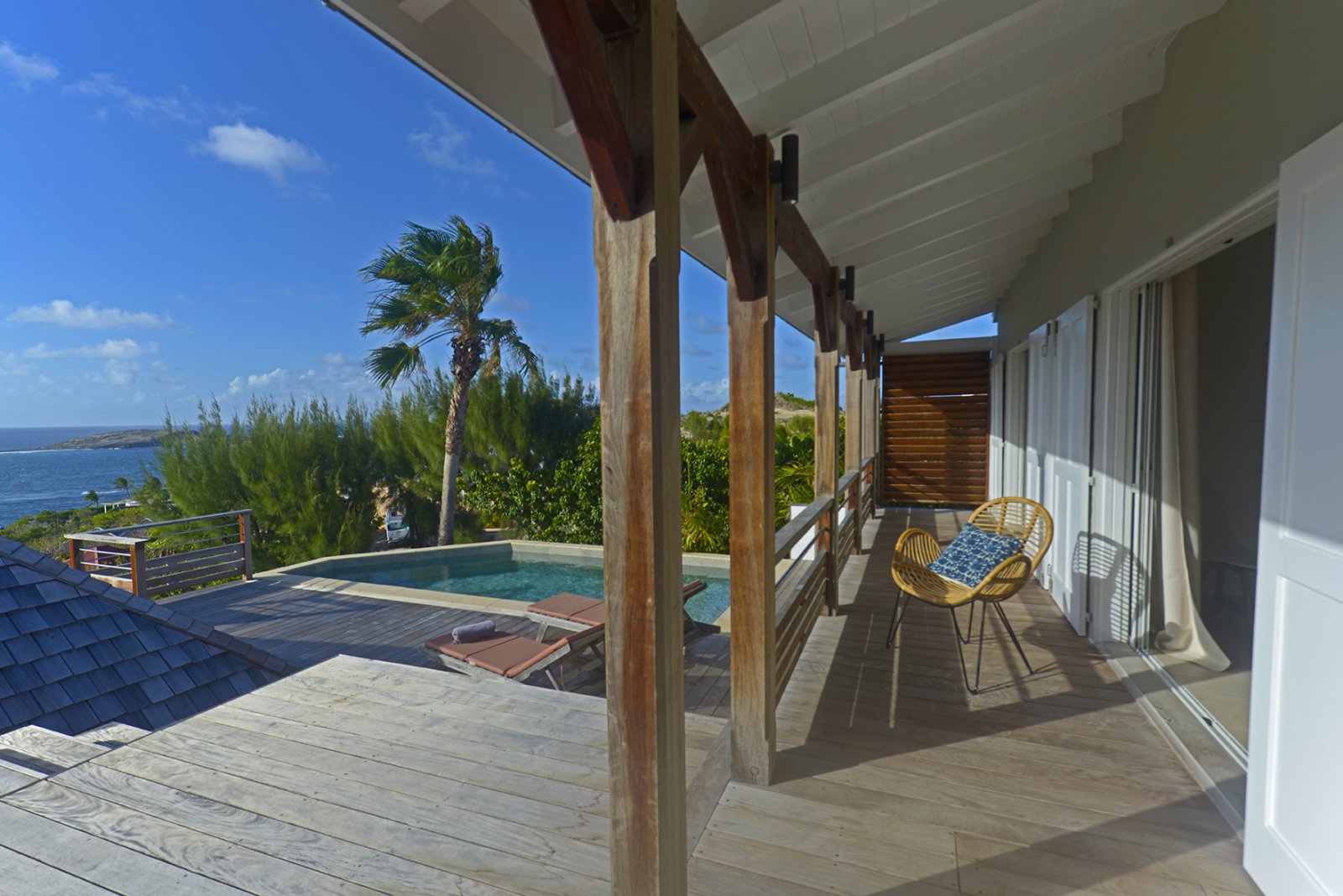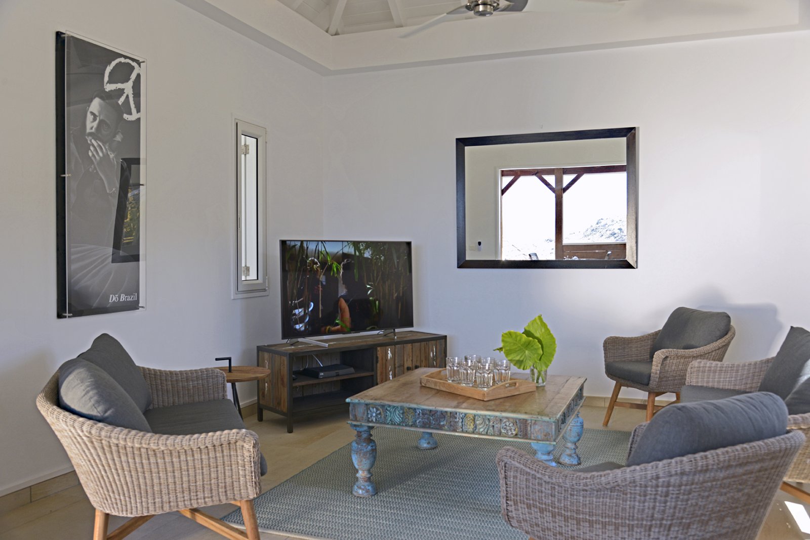 Villa Lagon Blue (LAB) is one of two villas located on the hillside right at the top of Petit Cul de Sac, in the exclusive gated community of Domaine du Levant. It offers three beds, three baths, a large pool and breath-taking views over Petit Cul de Sac to Tortue Island and distant St Martin. The three bedrooms are of similar size and comfort, and all open to a terrace with ocean view. Bedroom four is in its own bungalow. The spacious living area and fully equipped, modern kitchen open onto the pool and terrace , where the dining area overlooks the ocean, and benefits from the cooling breeze. The private community beach is just a pleasant stroll away.