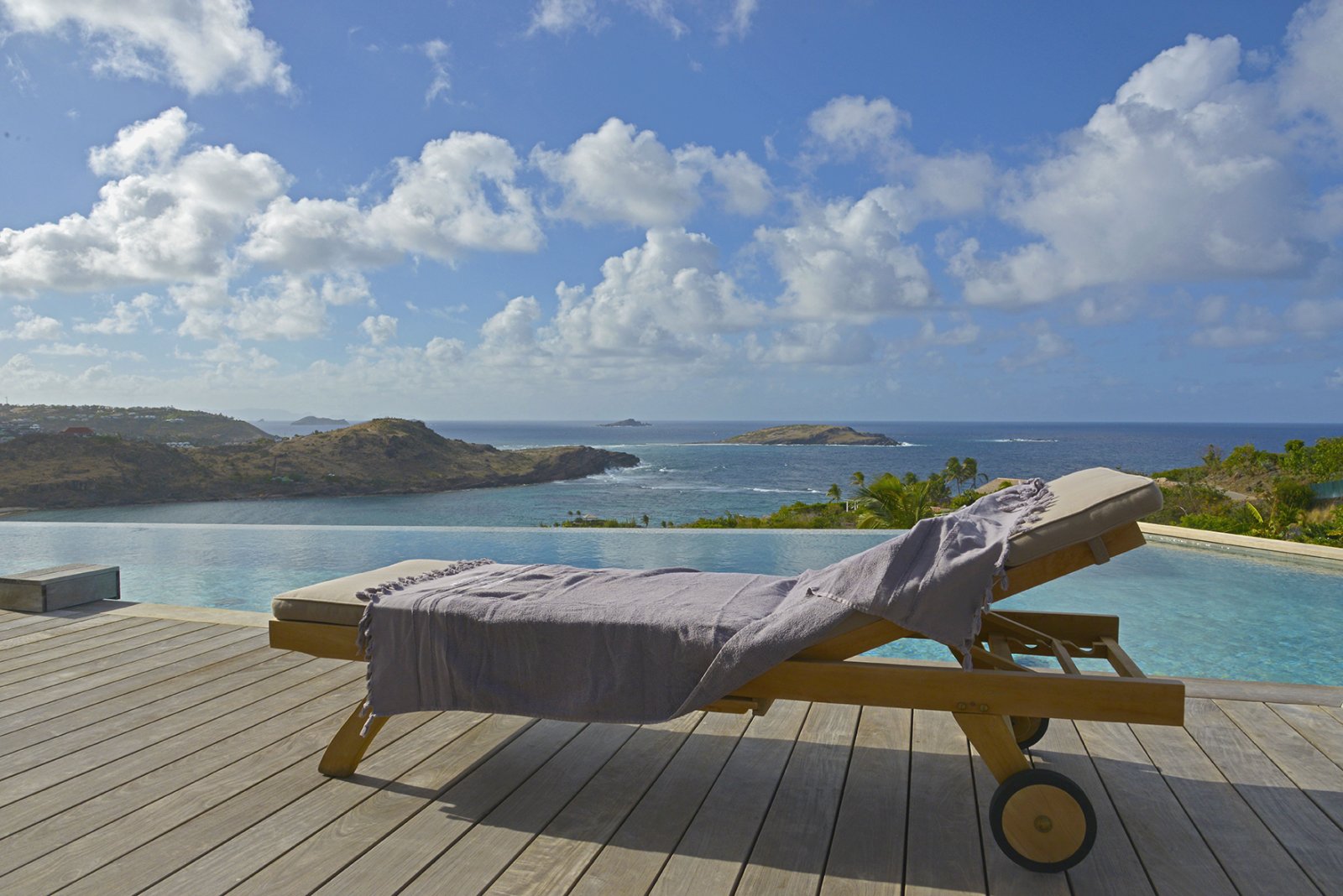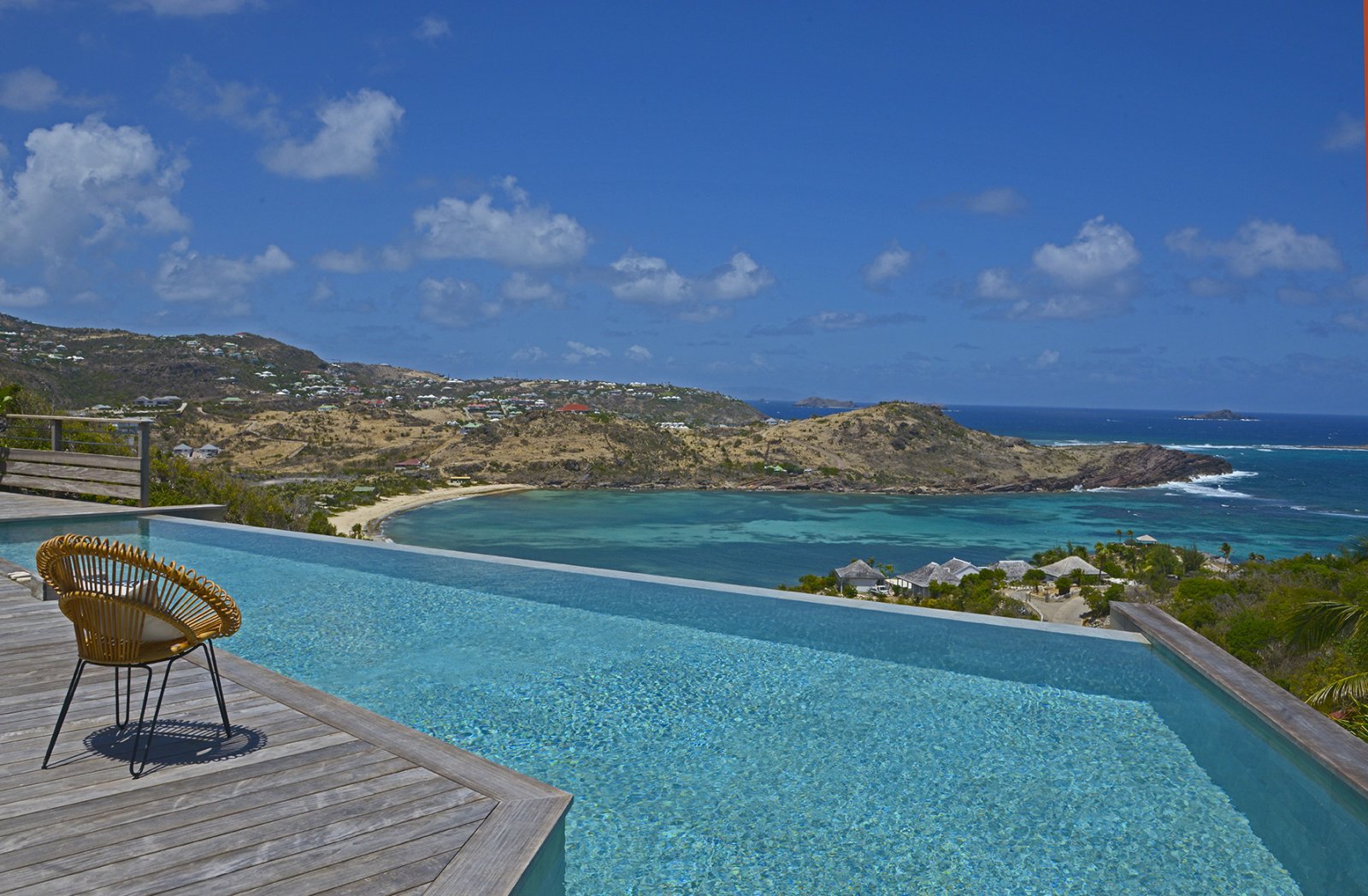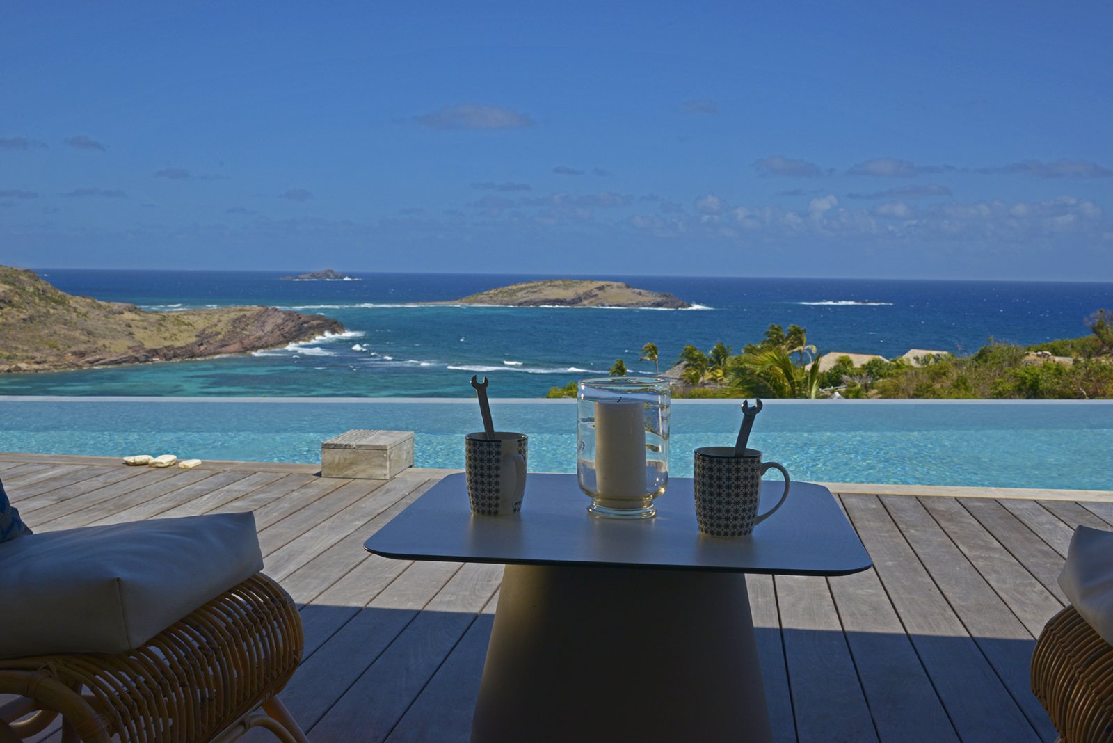 Villa Lagon Blue (LAB) is one of two villas located on the hillside right at the top of Petit Cul de Sac, in the exclusive gated community of Domaine du Levant. It offers three beds, three baths, a large pool and breath-taking views over Petit Cul de Sac to Tortue Island and distant St Martin. The three bedrooms are of similar size and comfort, and all open to a terrace with ocean view. Bedroom four is in its own bungalow. The spacious living area and fully equipped, modern kitchen open onto the pool and terrace , where the dining area overlooks the ocean, and benefits from the cooling breeze. The private community beach is just a pleasant stroll away.