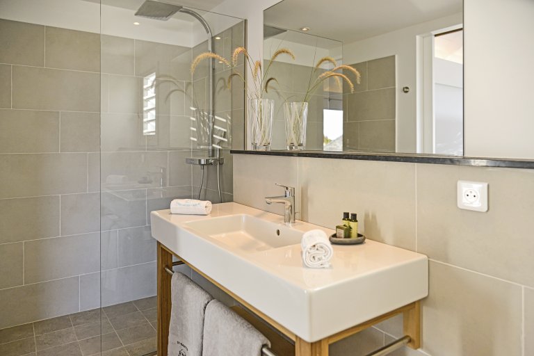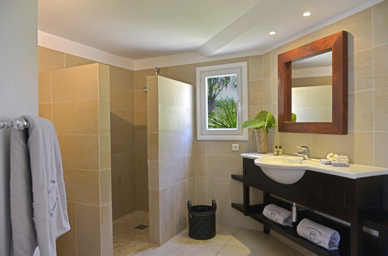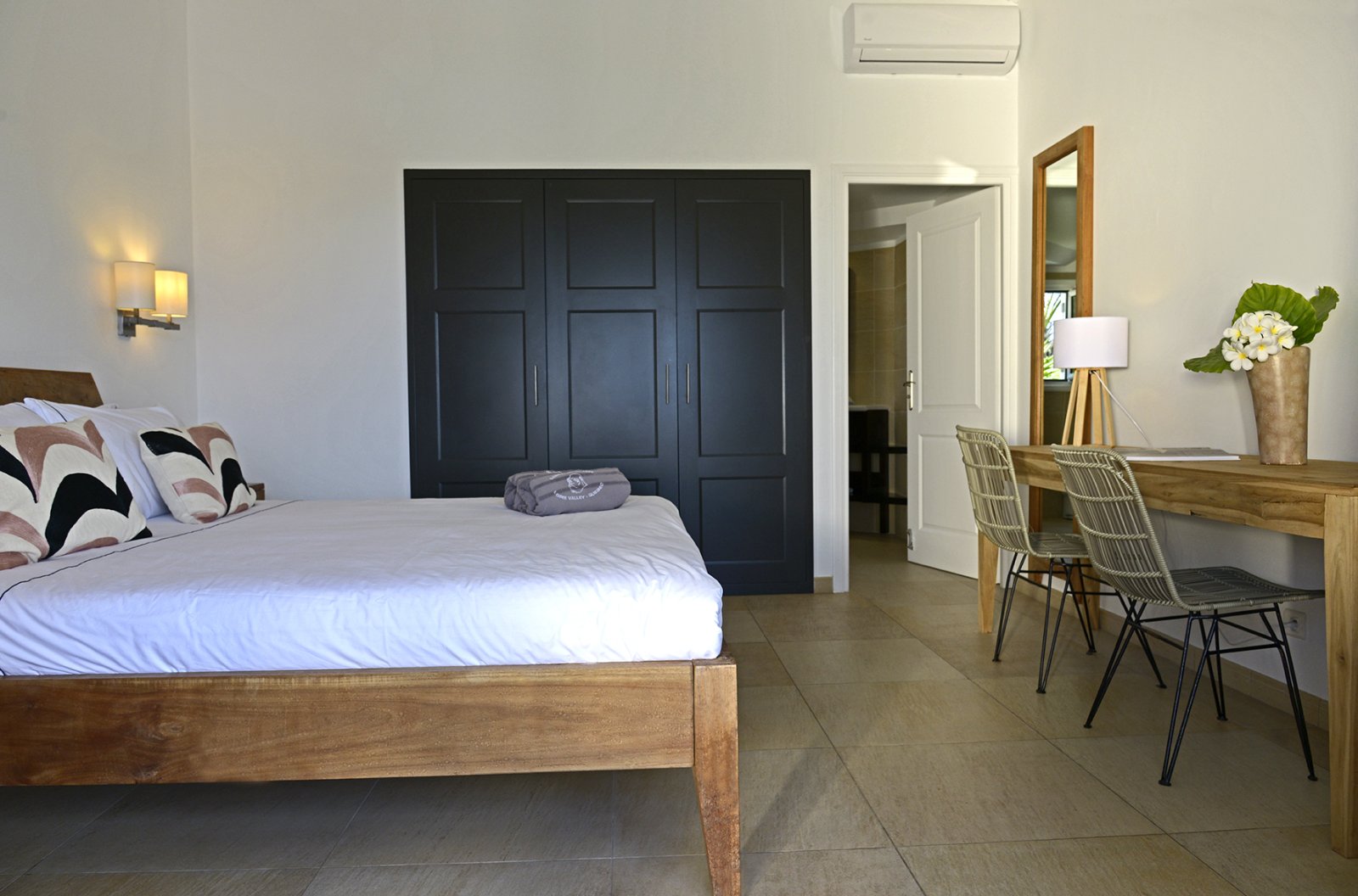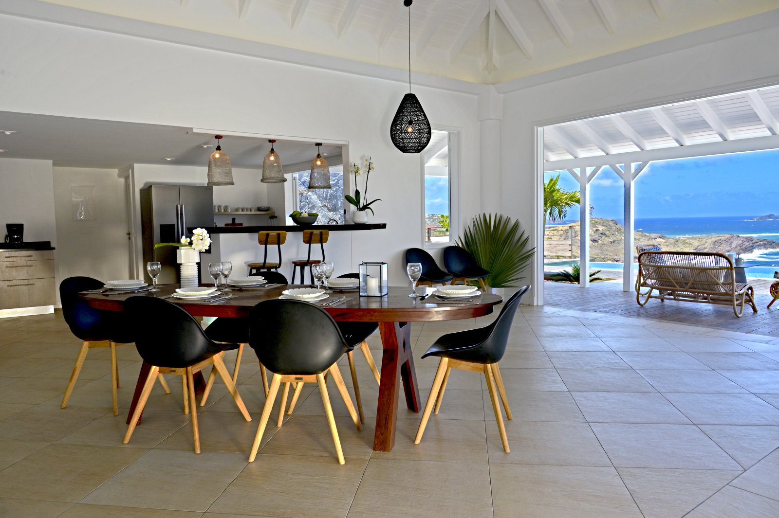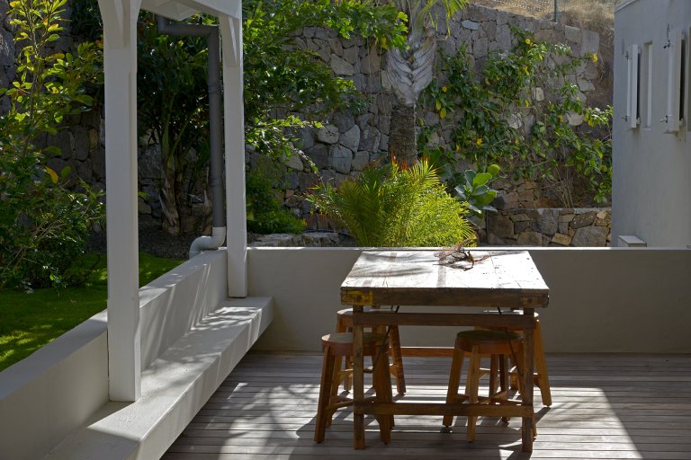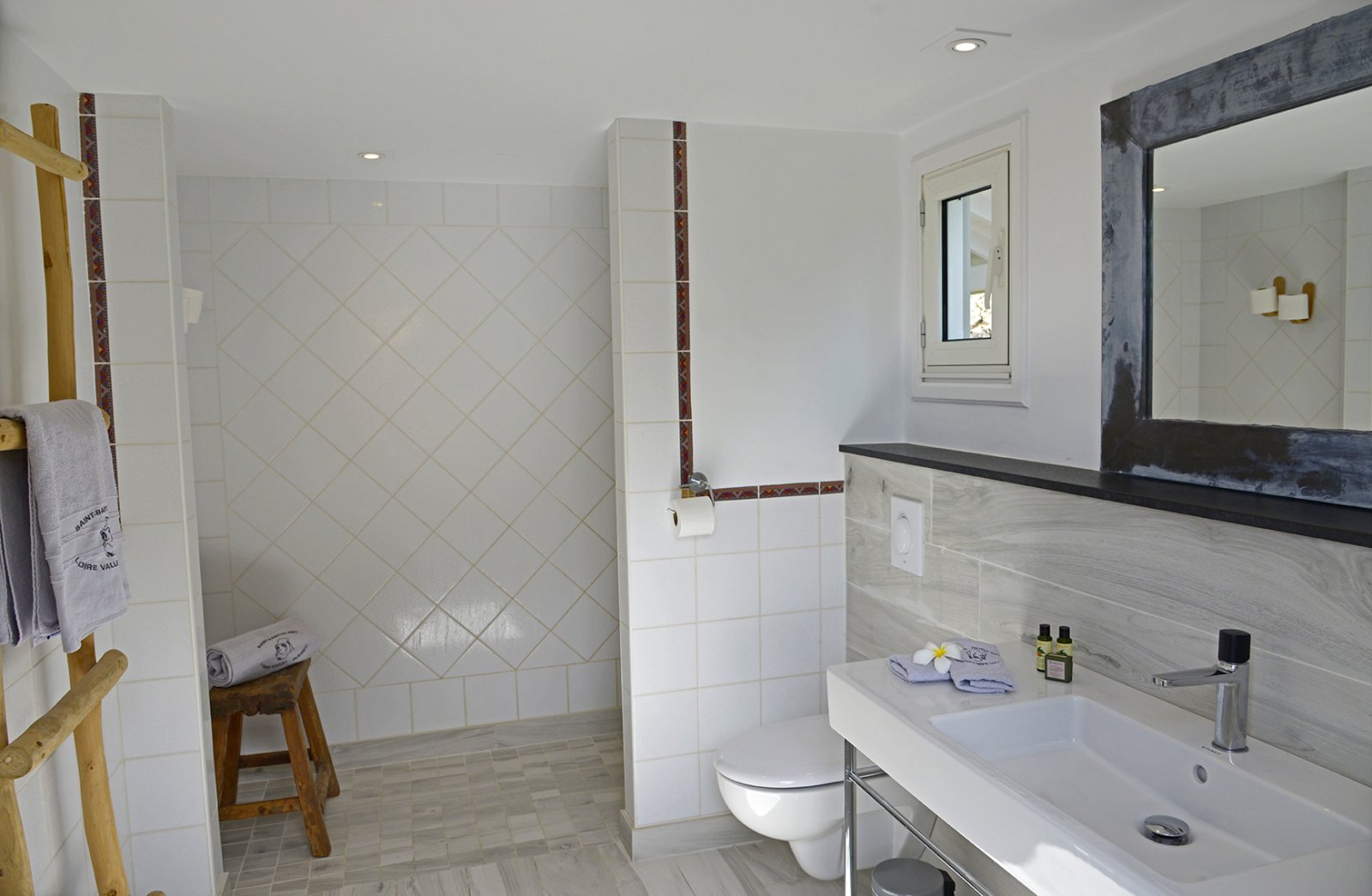 Villa Lagon Blue (LAB) is one of two villas located on the hillside right at the top of Petit Cul de Sac, in the exclusive gated community of Domaine du Levant. It offers three beds, three baths, a large pool and breath-taking views over Petit Cul de Sac to Tortue Island and distant St Martin. The three bedrooms are of similar size and comfort, and all open to a terrace with ocean view. Bedroom four is in its own bungalow. The spacious living area and fully equipped, modern kitchen open onto the pool and terrace , where the dining area overlooks the ocean, and benefits from the cooling breeze. The private community beach is just a pleasant stroll away.