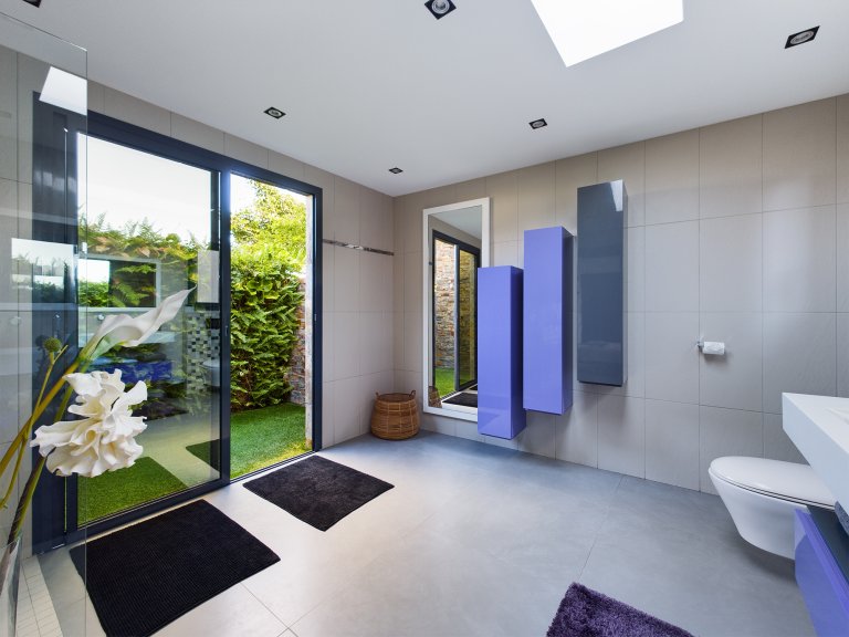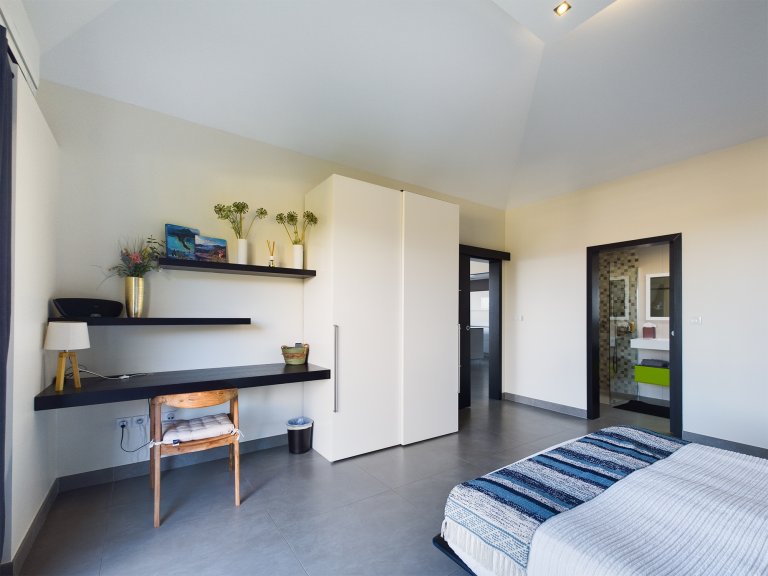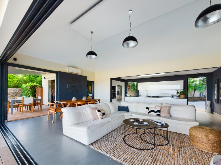 The focal point is the outdoors, especially the expansive terrace with its shimmering infinity pool overlooking the bay. Next to the pool are sunbeds on a grass lawn, and under the roof of the house is a shaded outdoor dining area that comfortably seats four. The rooms inside the house have wall-doors that can be opened wide to blend this terrace with the indoor areas, which include a second dining area for six, a living room and a galley kitchen that opens onto the living room, and ultimately onto the terrace.