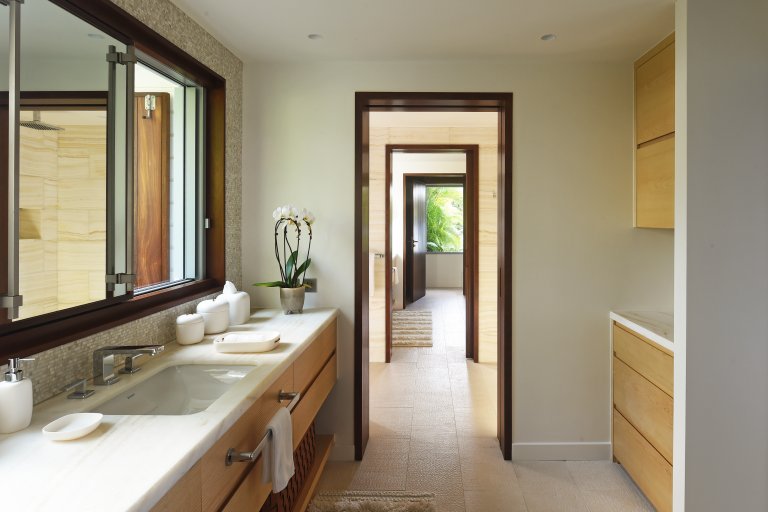 After a pleasant morning spent poolside, you may retreat from the noonday sun into the open living room, still just steps from the refreshing waters of the infinity pool, one of the largest on the island. Or you can find a shady spot on the master-bedroom terrace, surrounded by a drift of bougainvillea blossoms. The master bedroom offers the comfort of a modern bed. His-and-hers dressing rooms lead into separate bathrooms, complete with two rain-head showers, one inside and the other outside, sheltered by flowering bird-of-paradise plants.