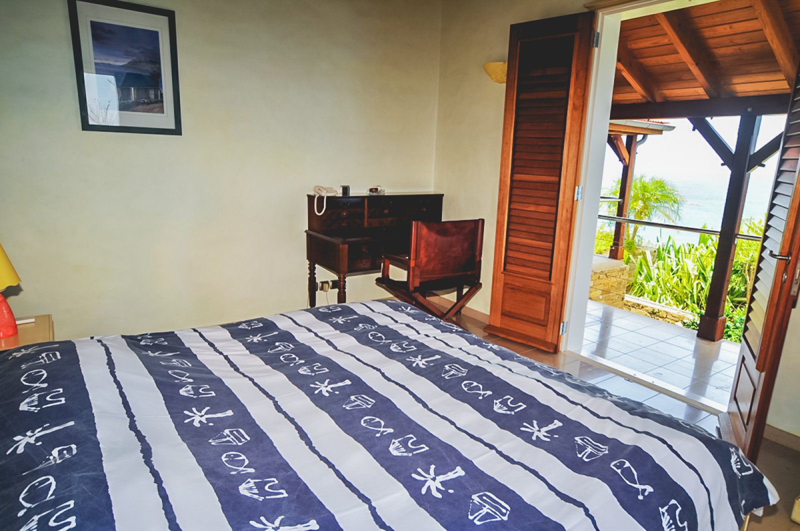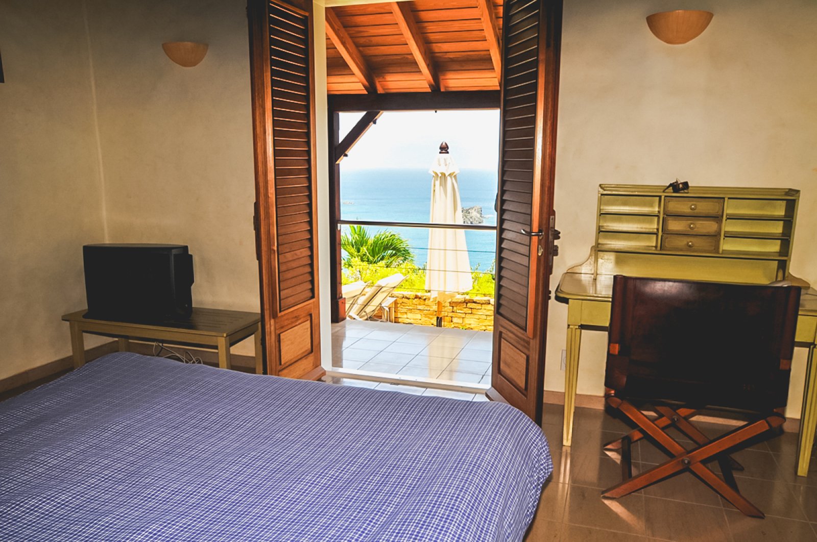 Bed: King Bed • En-Suite Bath with Hair Dryer • Walk-In Closet • High Definition TV • DVD Player • Air Conditioning • Ceiling Fan • Sound System • iPod Docking Station • Telephone • Direct Access to Private Terrace • Ocean View