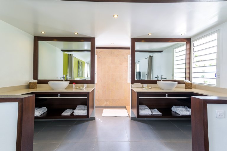 On the terrace off the main house, the clear and inviting water of the infinity pool looks as though it is overflowing into the ocean below. Comfortable seating and chaises for sunning are available on the terrace, along with an outdoor rain-head shower by the pool and a half-bath near the main house. A dining deck above the pool is an ideal spot to enjoy the end of the day while watching sailboats returning to port under the spectacular colors of the sky at sunset. Lush vegetation surrounds this villa, providing exceptional privacy and quiet.