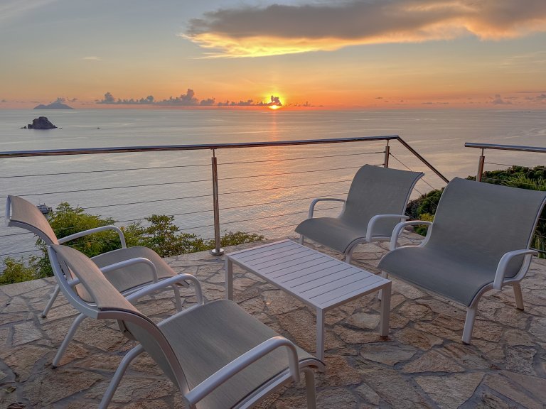 Nestled high up on hillside in Colombier, Villa L'Enclos (CLO) offers quiet seclusion and a spectacular ocean vista, a true panorama ranging from Gustavia Harbor to the east to the island of St. Maarten to the west. Recently renovated and redecorated, Villa CLO provides its guests with genuine West Indies charm with updated amenities and features. The open-plan living/dining and kitchen area occupies the main house, and large French doors open onto the terrace facing the Caribbean Sea and Saba. The convenient kitchen is modern and well equipped, with plenty of counter space, discrete under-counter refrigerators, and a Leibherr gas range-top.