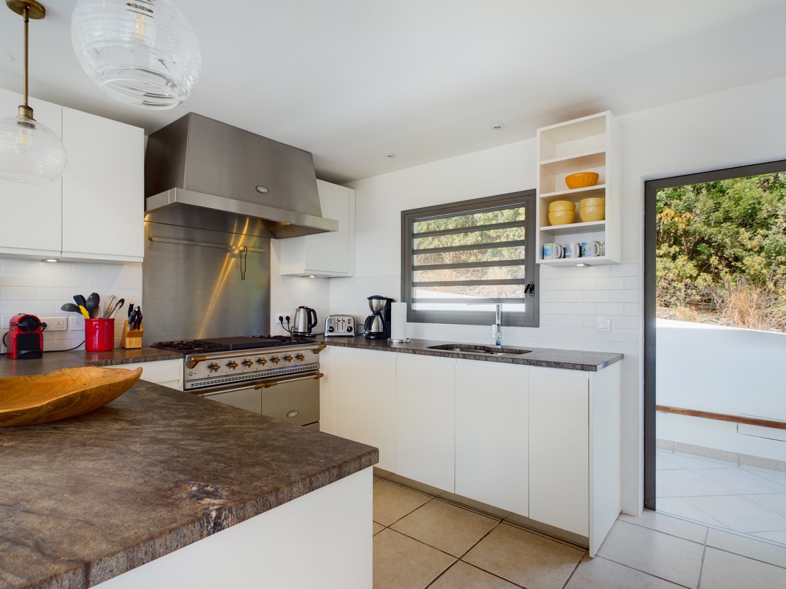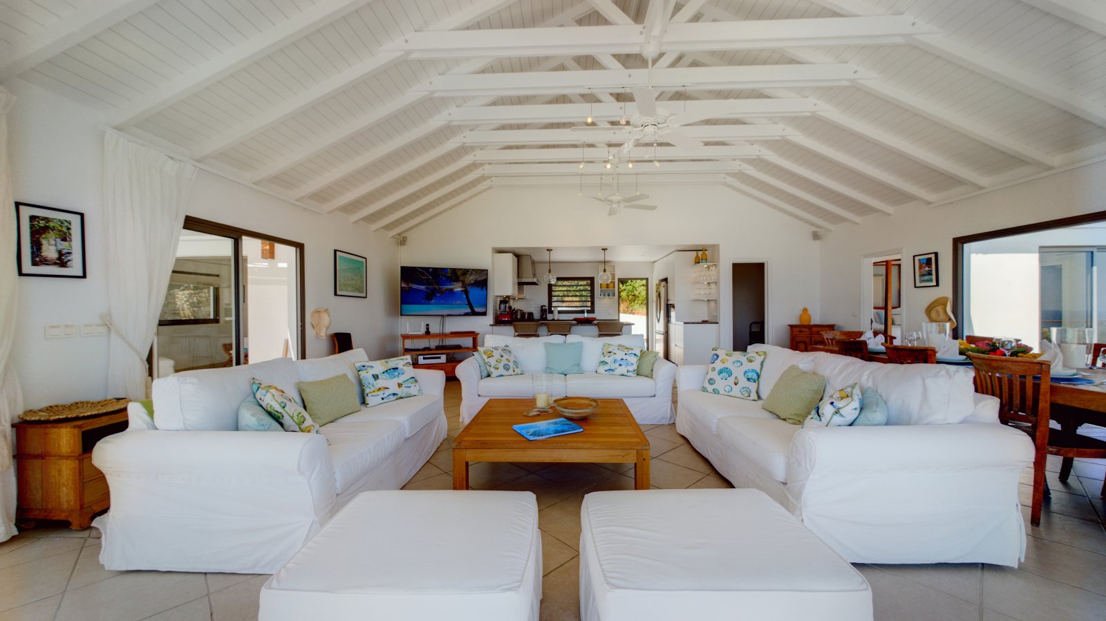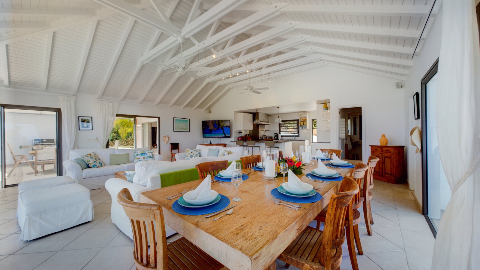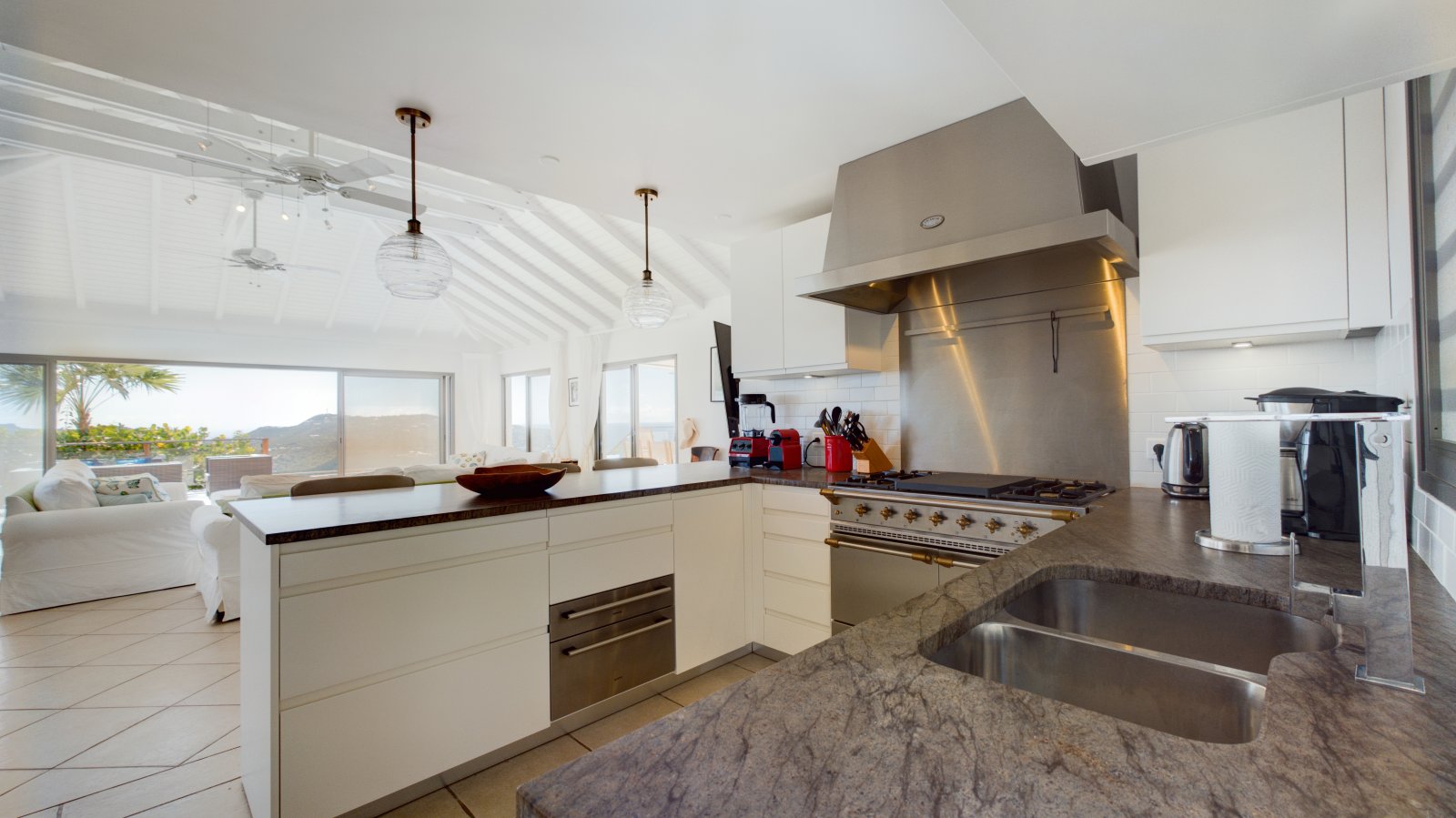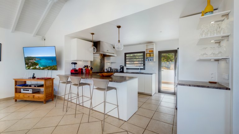 Villa Mirador offers a welcoming living room with comfortable sofas and adjacent to the indoor and outdoor dining areas. At the back of the villa, the kitchen is modern and well-equipped. This large room opens onto the terrace and the view.