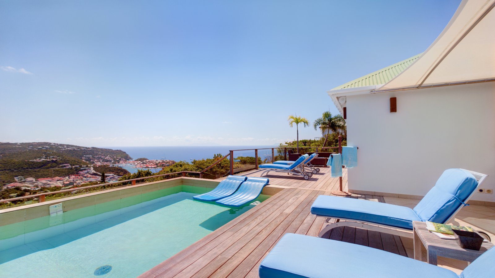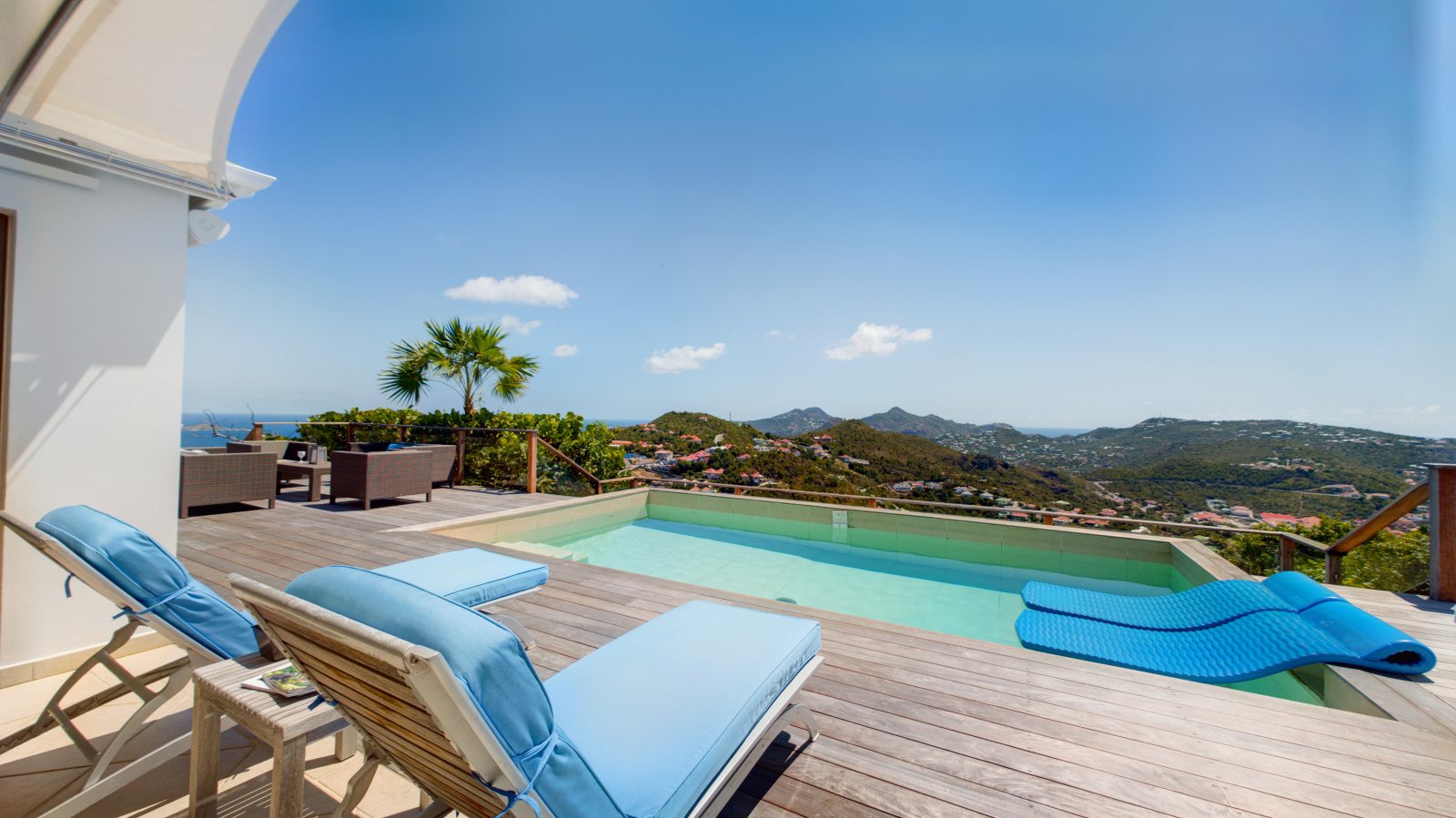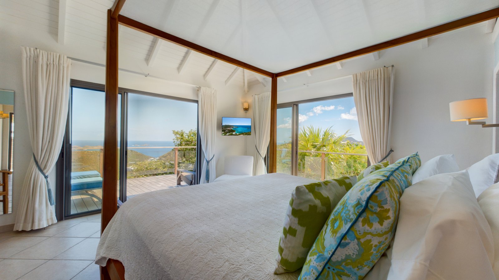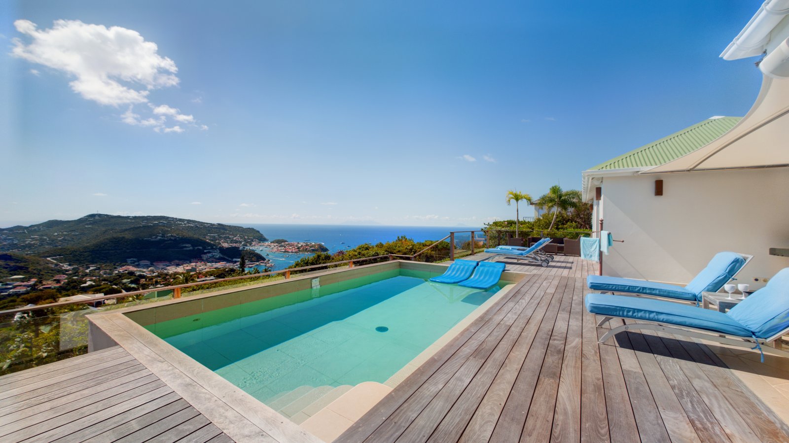 Decorated in light wood and white cotton, with warm accents of blue and green, Villa Mirador (ING) creates an inviting and sun-dappled atmosphere that will make you feel instantly at home. Outside, a wide ipe deck and shimmering pool overlook a panorama including the harbor of Gustavia and the blue Caribbean.