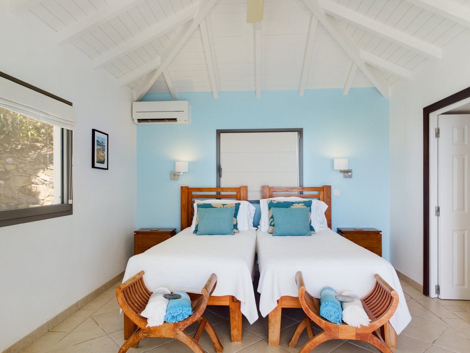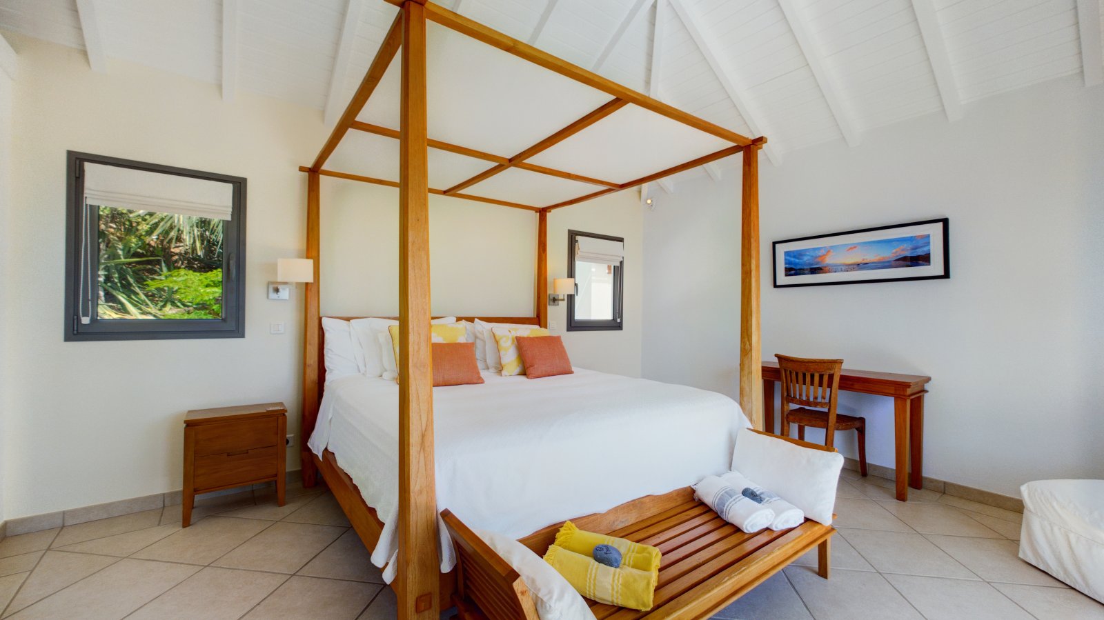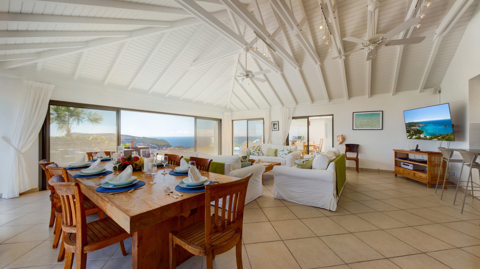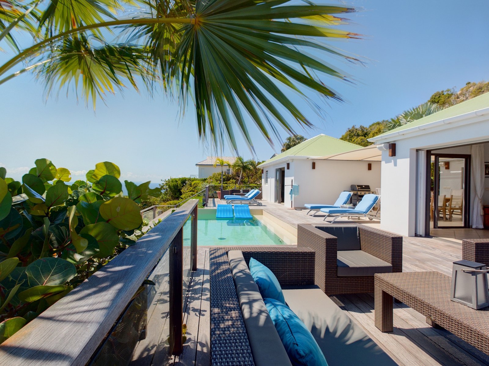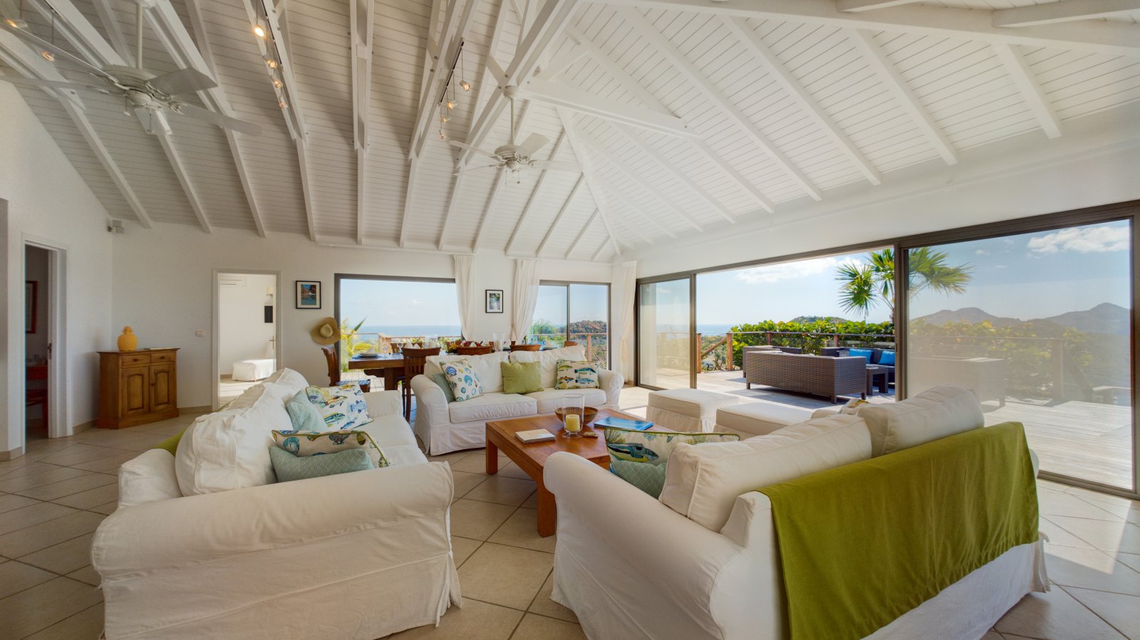 Decorated in light wood and white cotton, with warm accents of blue and green, Villa Mirador (ING) creates an inviting and sun-dappled atmosphere that will make you feel instantly at home. Outside, a wide ipe deck and shimmering pool overlook a panorama including the harbor of Gustavia and the blue Caribbean.