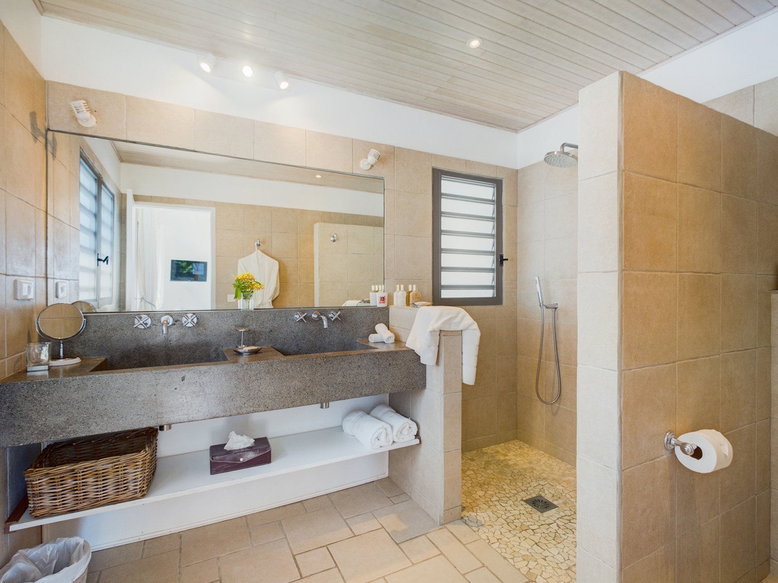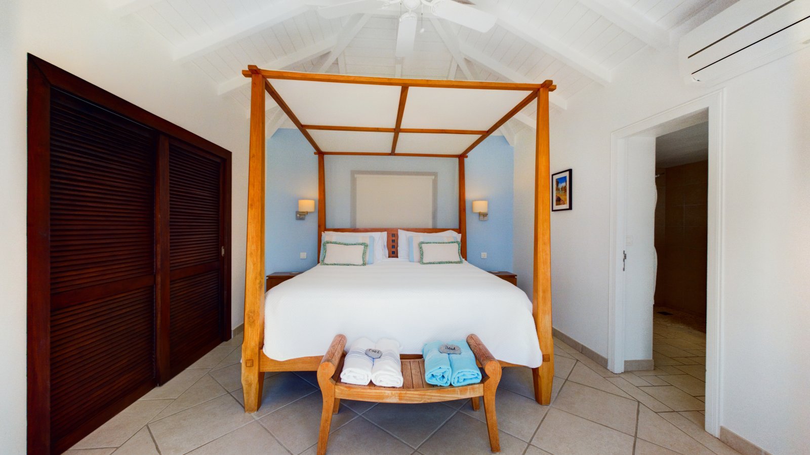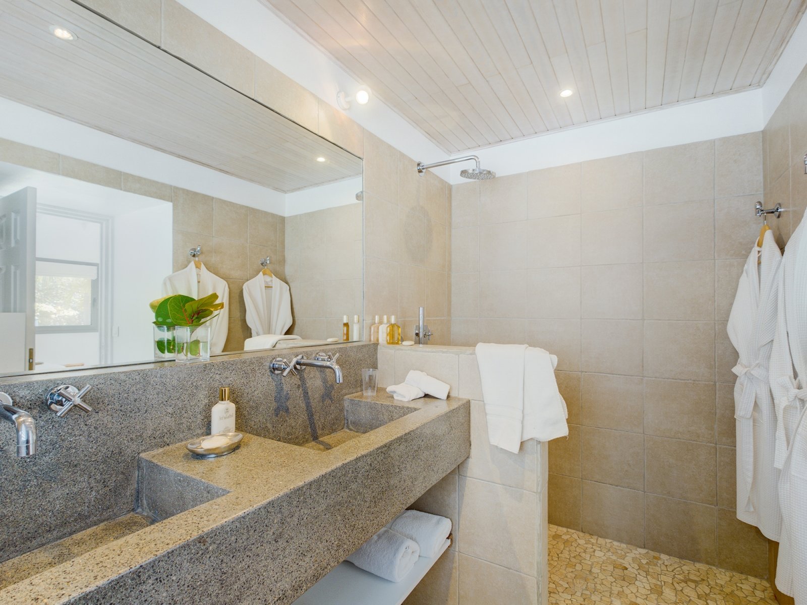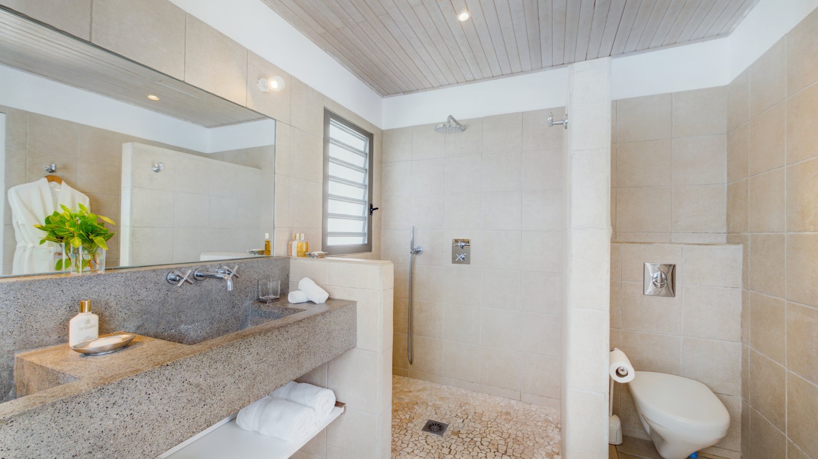 Decorated in light wood and white cotton, with warm accents of blue and green, Villa Mirador (ING) creates an inviting and sun-dappled atmosphere that will make you feel instantly at home. Outside, a wide ipe deck and shimmering pool overlook a panorama including the harbor of Gustavia and the blue Caribbean.