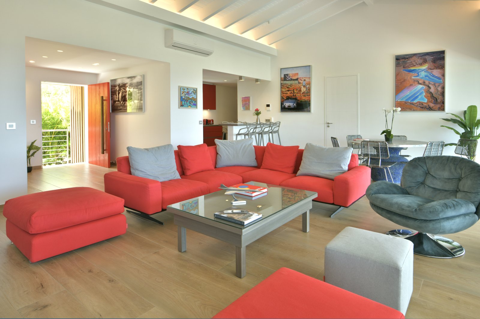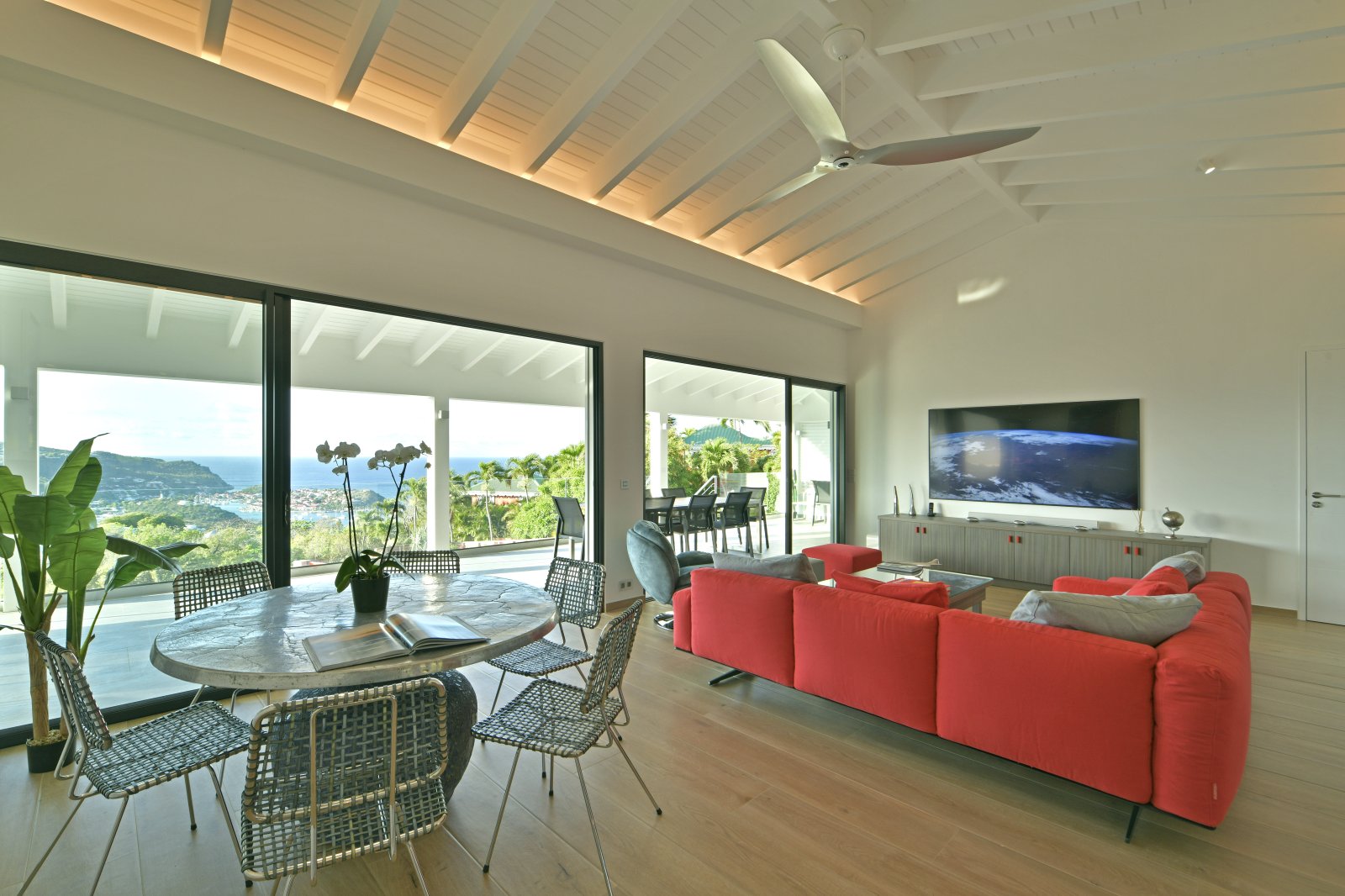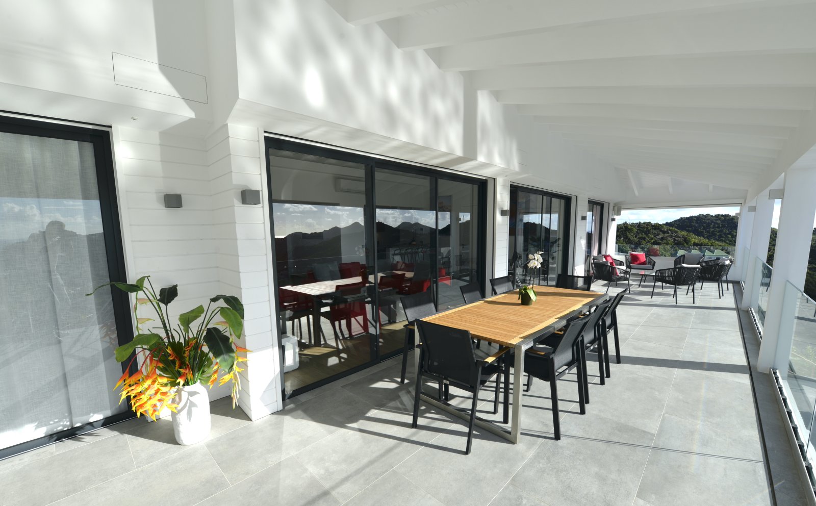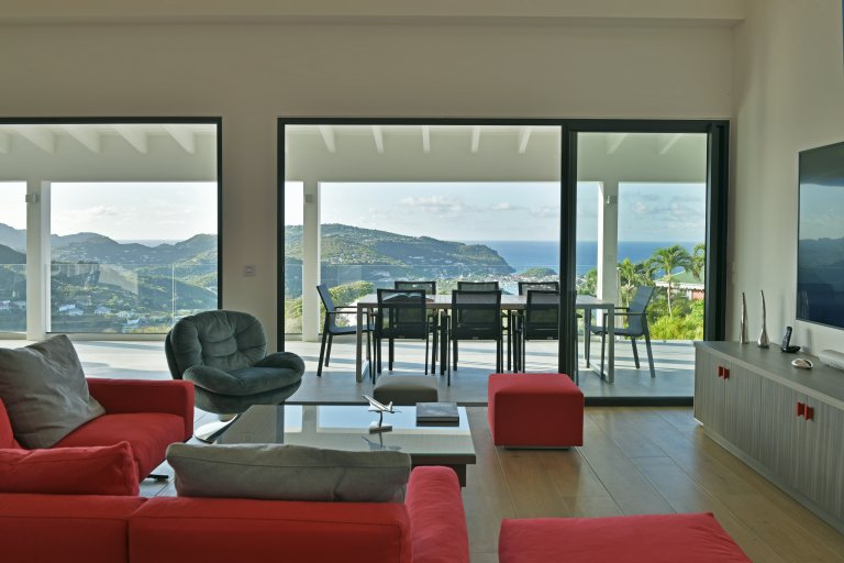 The indoor spaces open onto a large, partially covered terrace with a dining table for 12 guests, a lounge, and a relaxation area. Plane spotters will enjoy watching small aircraft as they make their way toward the famous St. Barth landing.