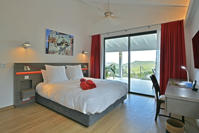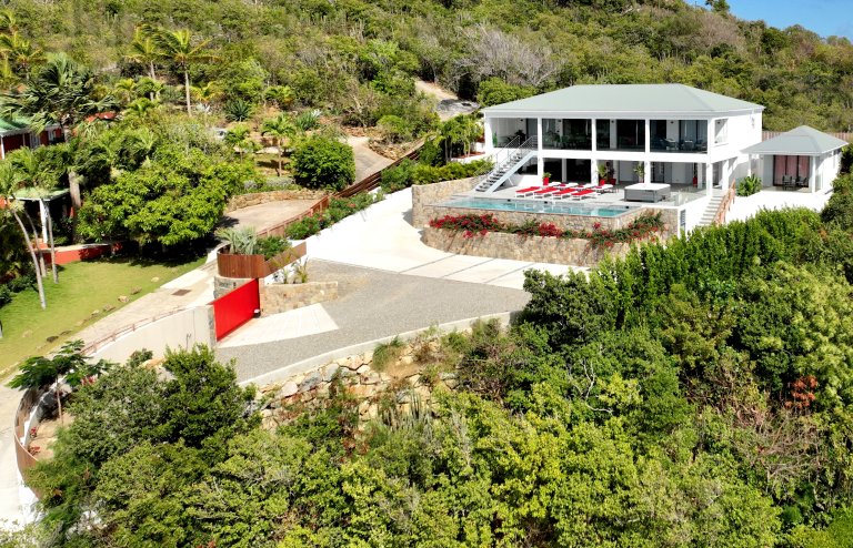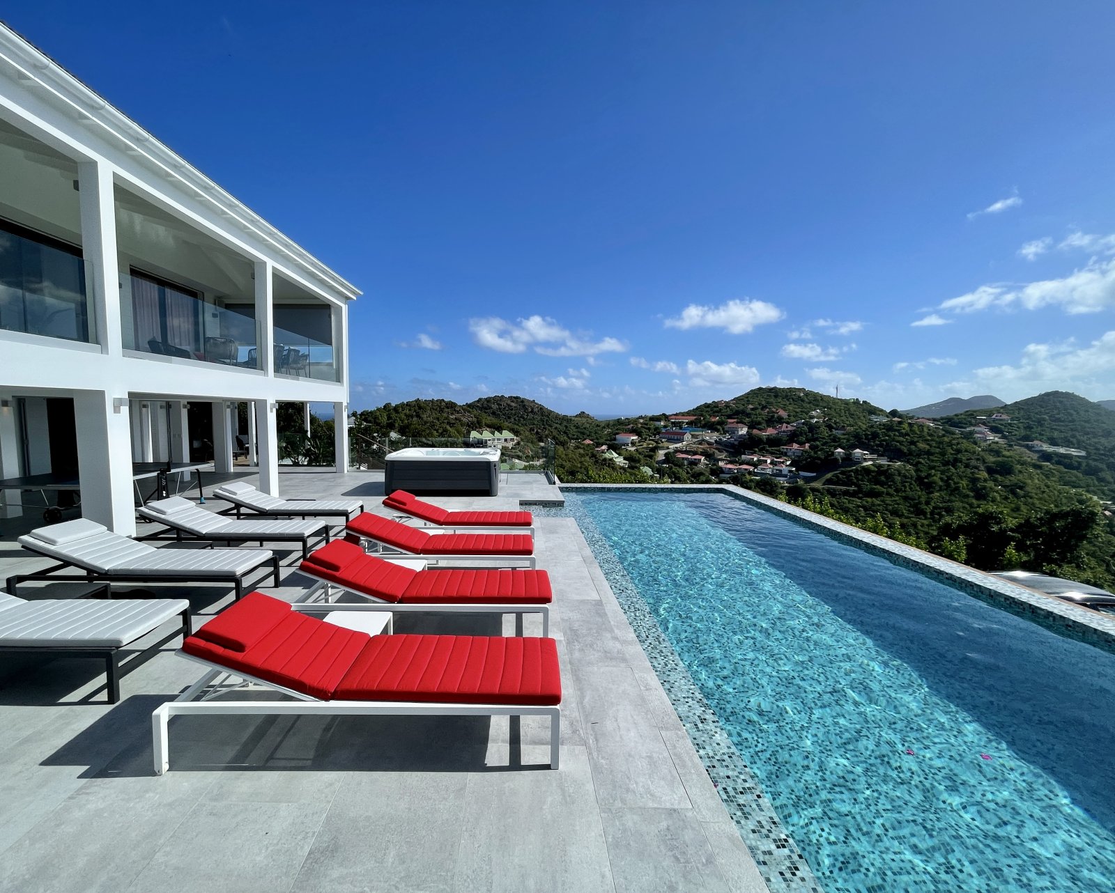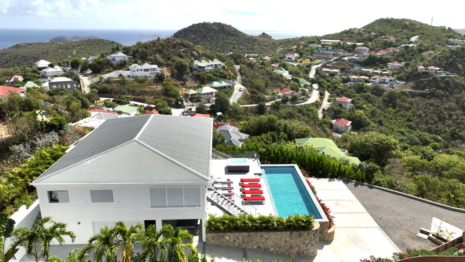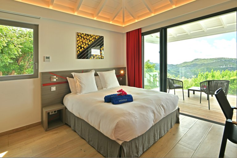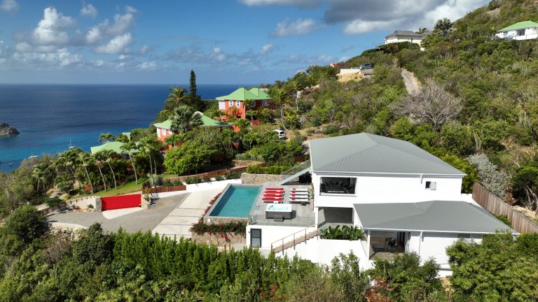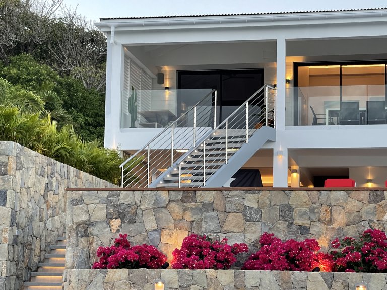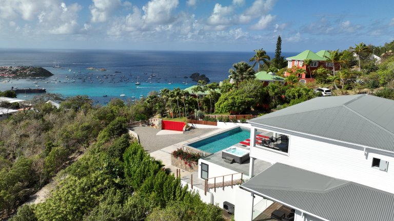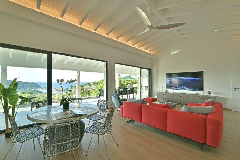 After a thorough renovation in 2022, Villa Voyage (VYE) emerged as a virtually new, ultra-modern vacation home in the hills of Colombier. The luxury rental property has a fantastic view of the nearby green hills, the ocean, neighboring islands, and the yachts in Gustavia harbor. With its very large, multi-use terrace, it is an especially fine place to enjoy the sunset every day and the fireworks during the festive season.