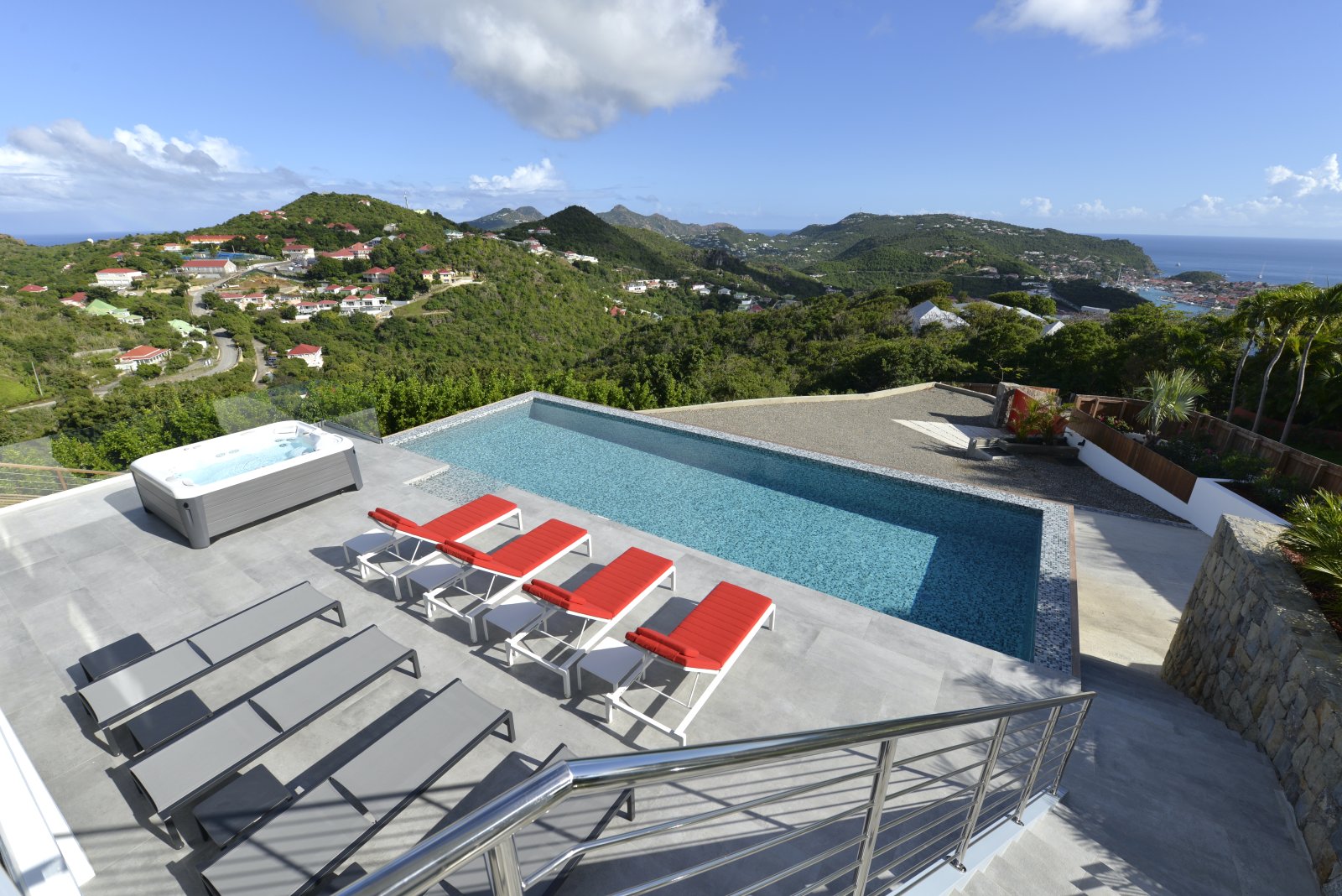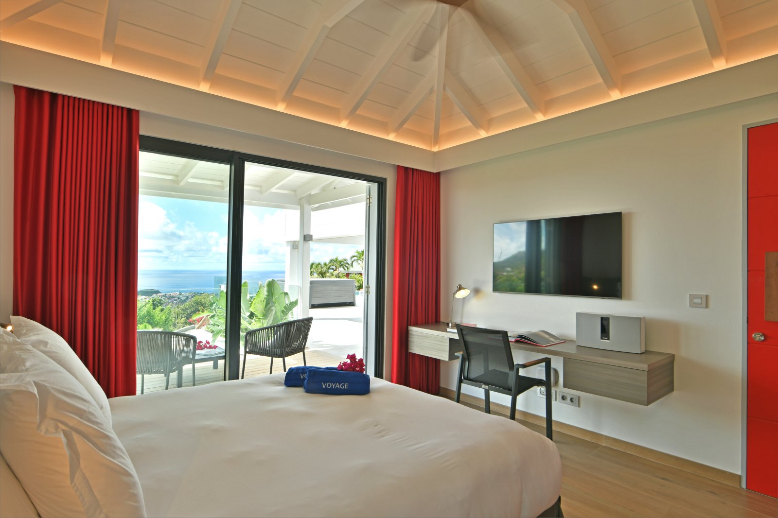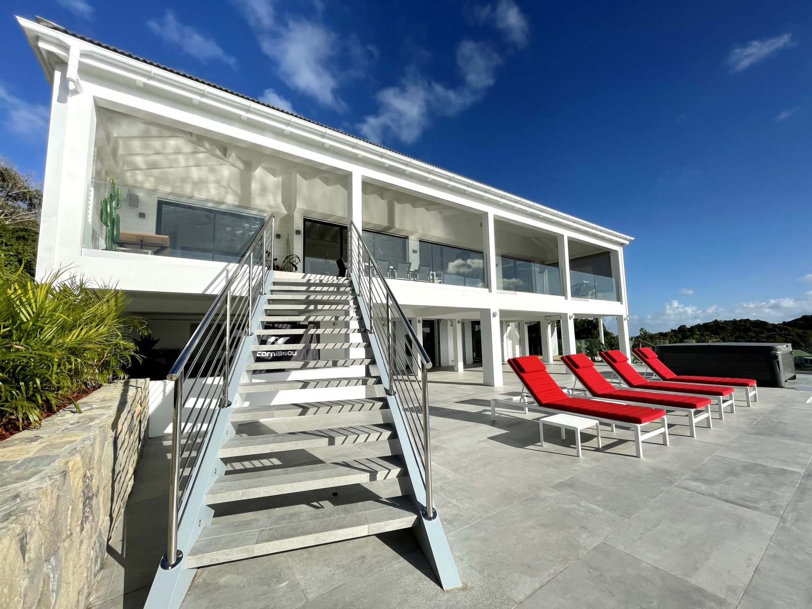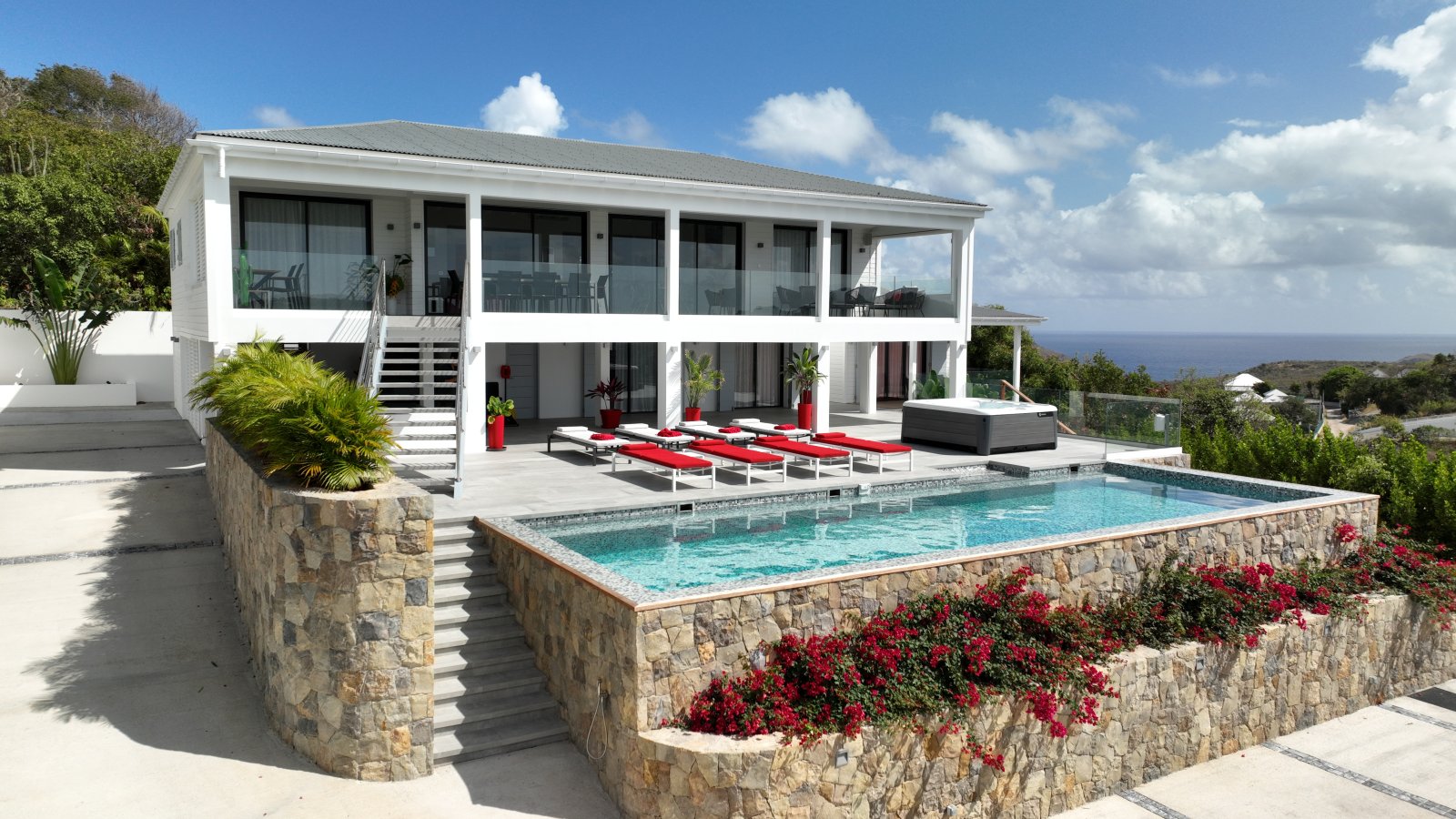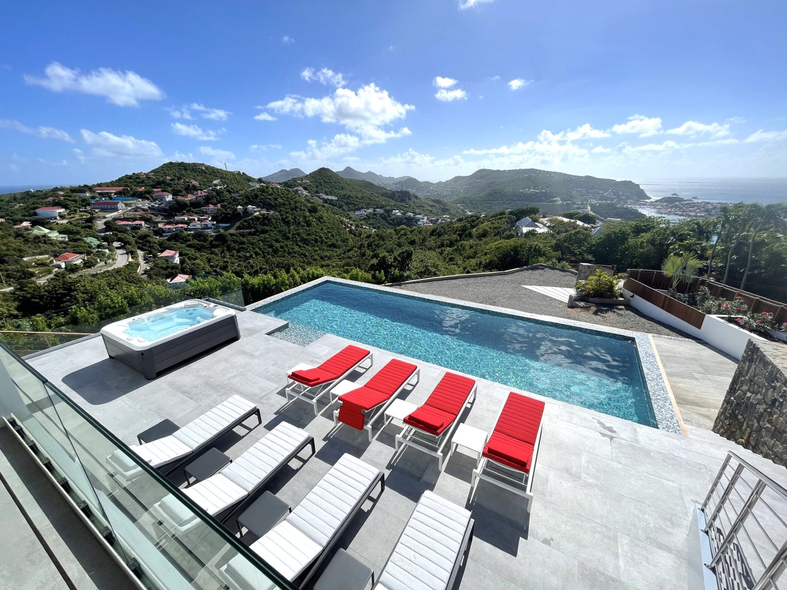 After a thorough renovation in 2022, Villa Voyage (VYE) emerged as a virtually new, ultra-modern vacation home in the hills of Colombier. The luxury rental property has a fantastic view of the nearby green hills, the ocean, neighboring islands, and the yachts in Gustavia harbor. With its very large, multi-use terrace, it is an especially fine place to enjoy the sunset every day and the fireworks during the festive season.
