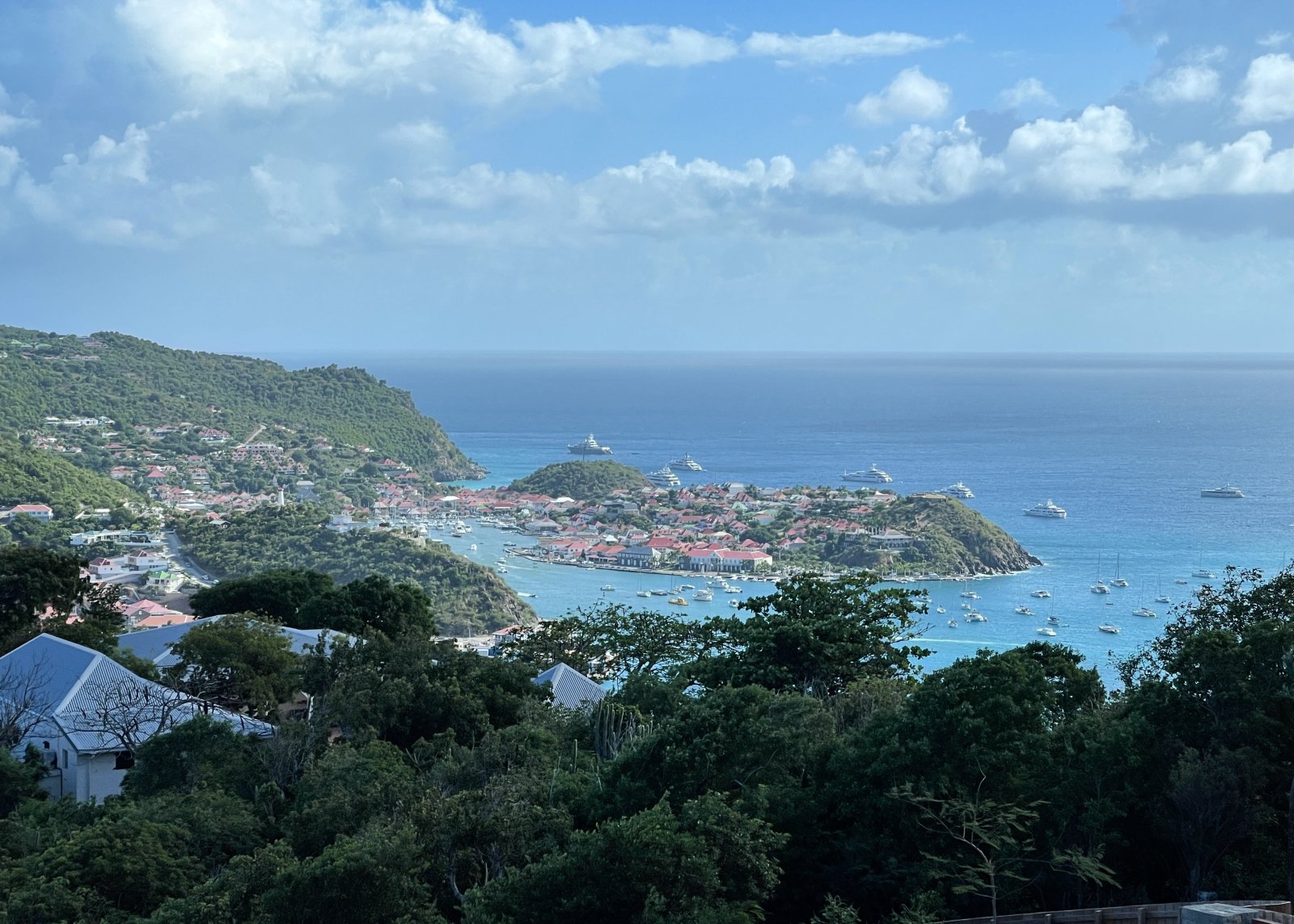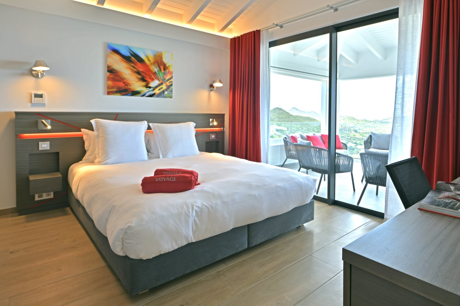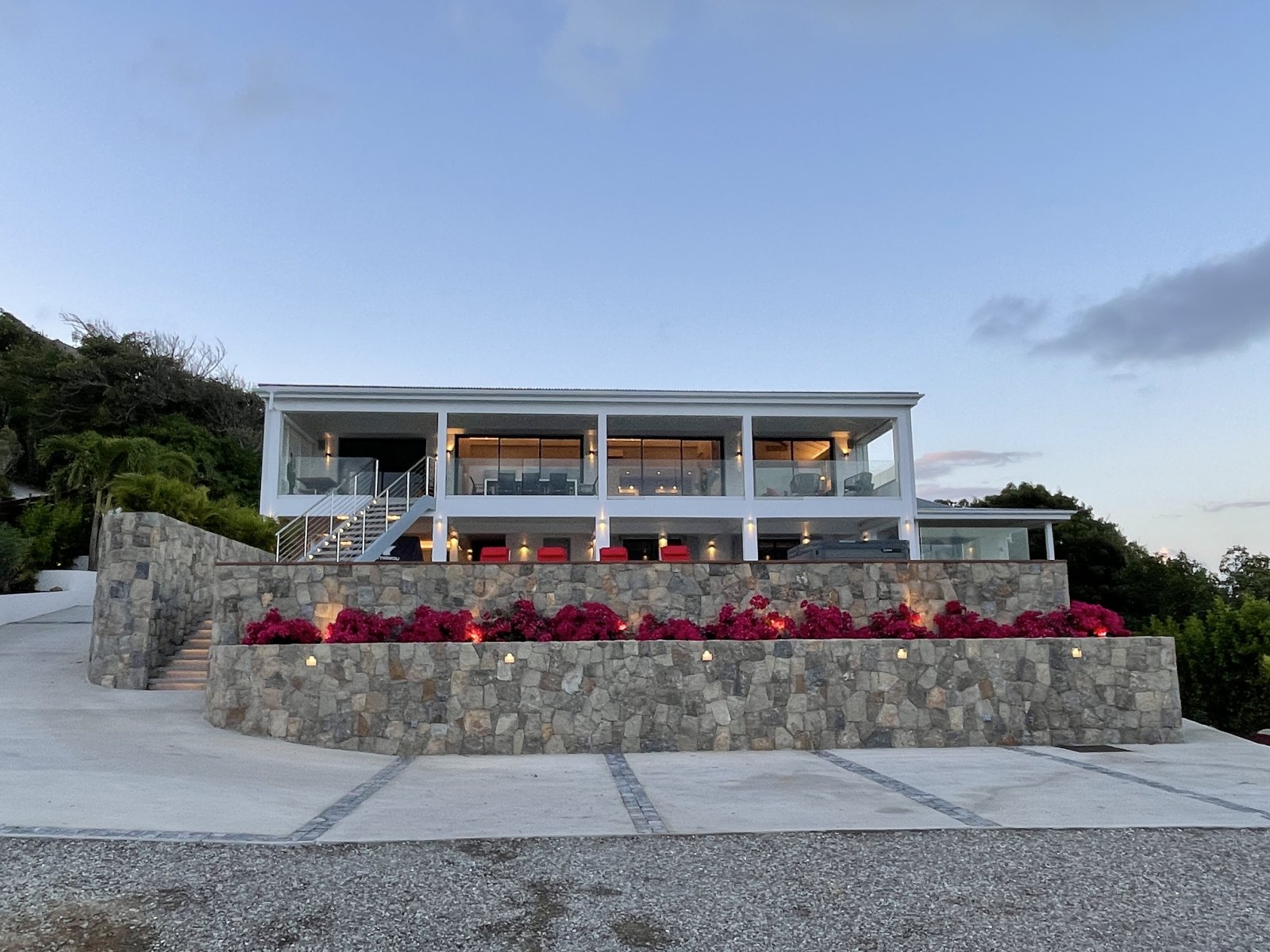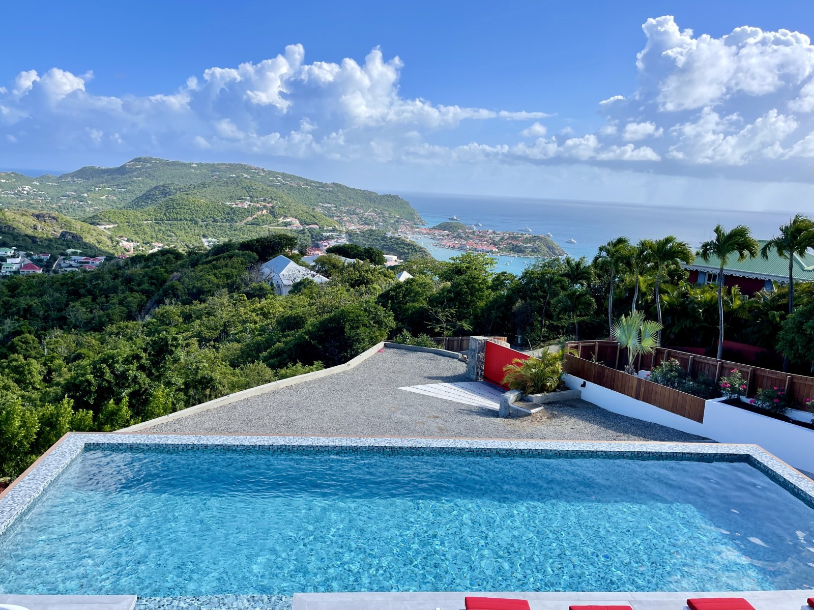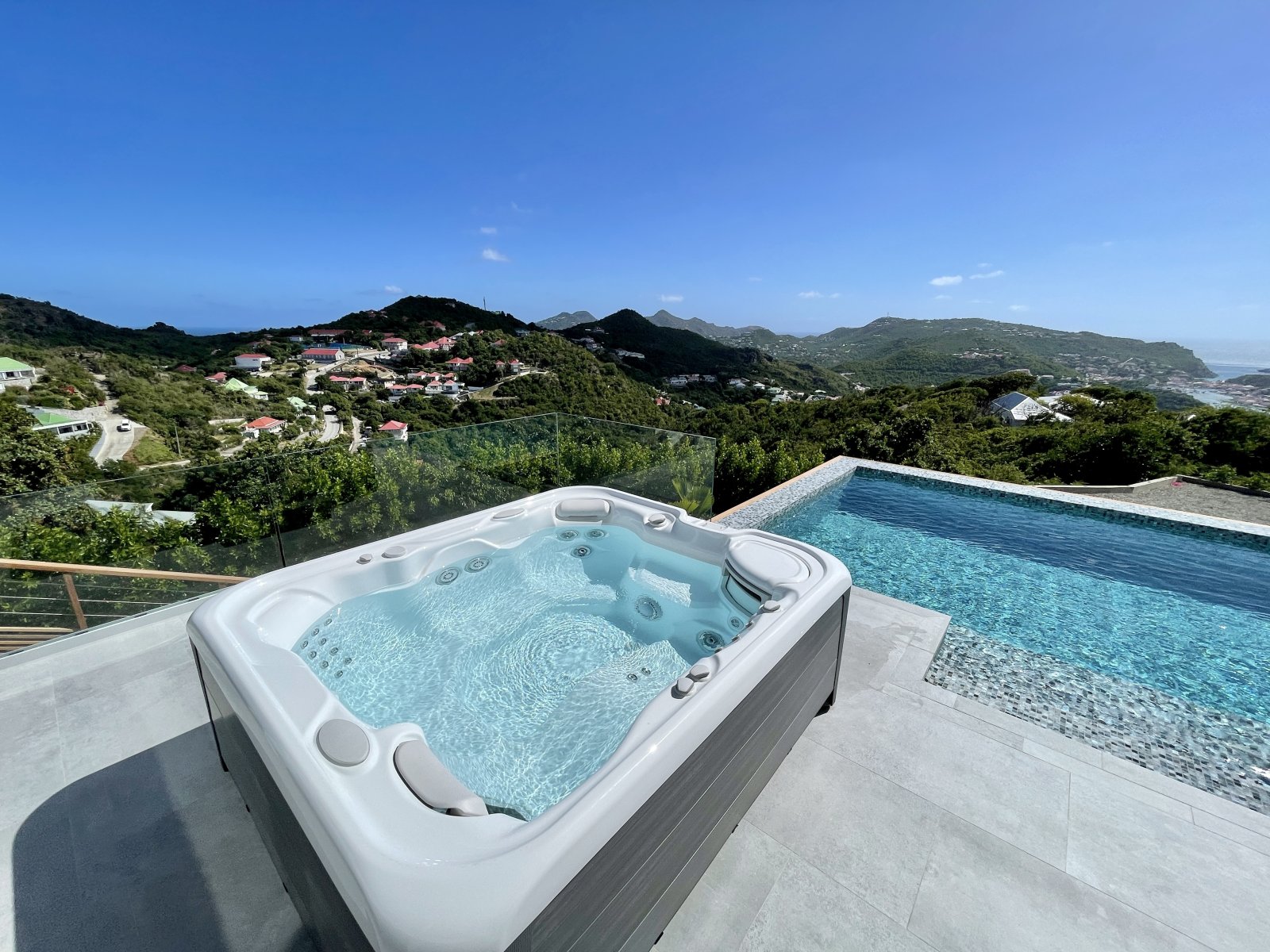 After a thorough renovation in 2022, Villa Voyage (VYE) emerged as a virtually new, ultra-modern vacation home in the hills of Colombier. The luxury rental property has a fantastic view of the nearby green hills, the ocean, neighboring islands, and the yachts in Gustavia harbor. With its very large, multi-use terrace, it is an especially fine place to enjoy the sunset every day and the fireworks during the festive season.