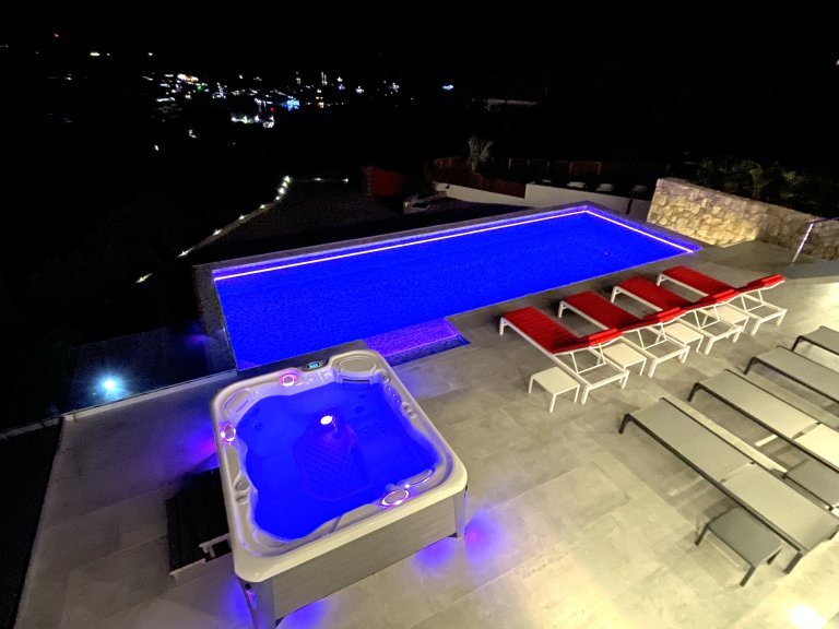 The master bedroom and one of the additional bedrooms are on this same level, with excellent views and direct access to the terrace. Two more bedrooms are on the lower level, which has a terrace of its own, as well as the villa’s fluorescent mosaic swimming pool—which is superbly illuminated at night—foosball table, ping-pong table, and ultra-modern, six-person hot tub.