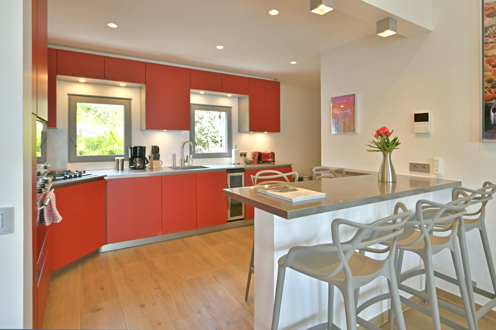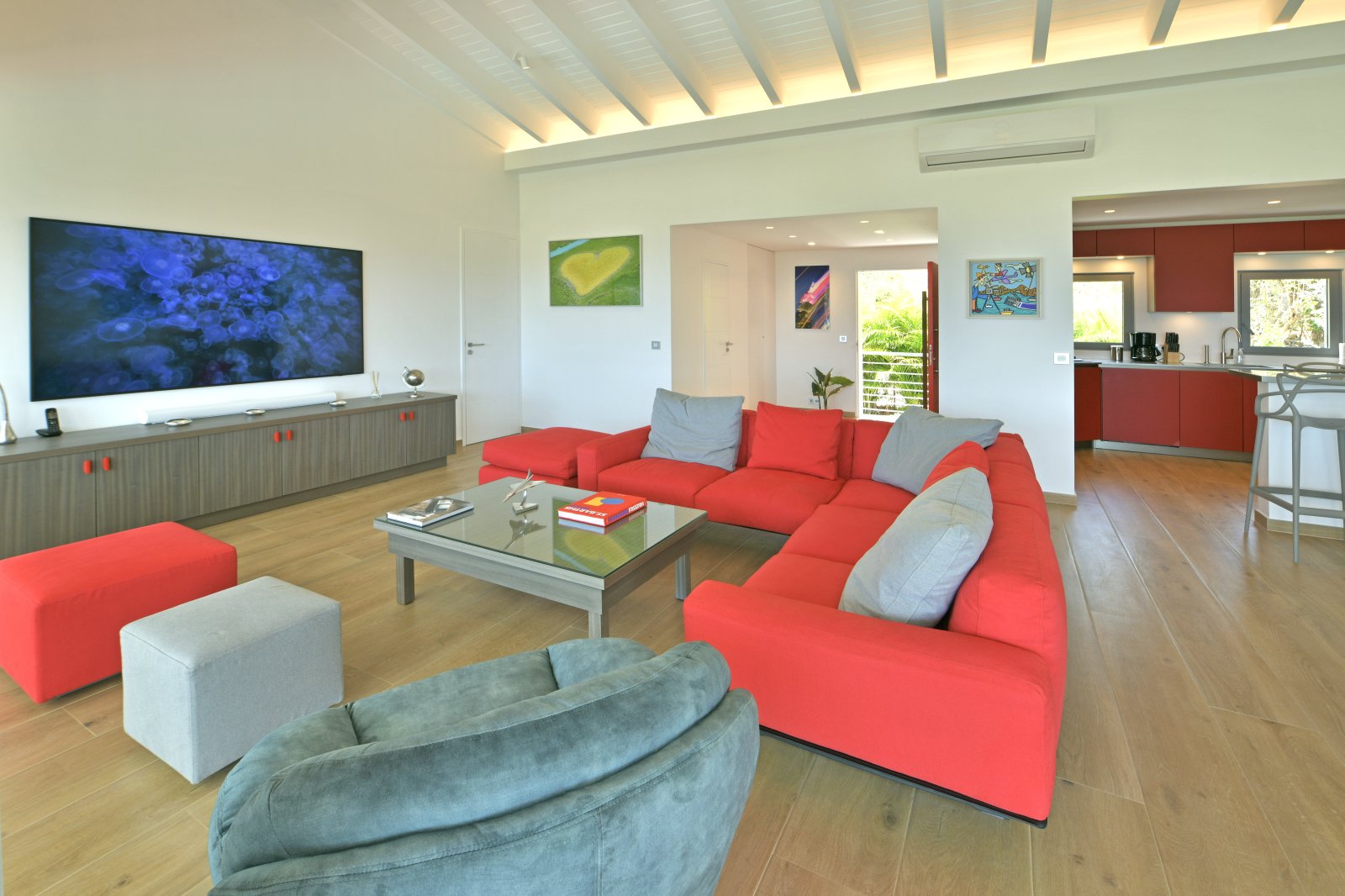 On the upper floor, the open-plan kitchen is separated from the living room by a bar. Both areas are air-conditioned and benefit from large picture windows that maximize the panoramic view. The living room has an 85-inch television, and there is fiber optic internet throughout.