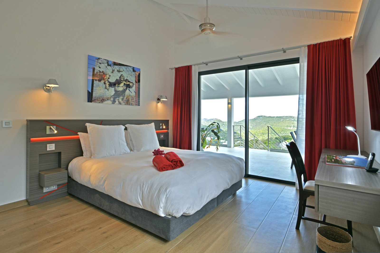 Bed: King Bed • En-Suite Bath with Shower and Dual Vanity • Air Conditioning • Ceiling Fan • Flat-Screen TV • Hair Dryer • Safe • Direct Access to Terrace