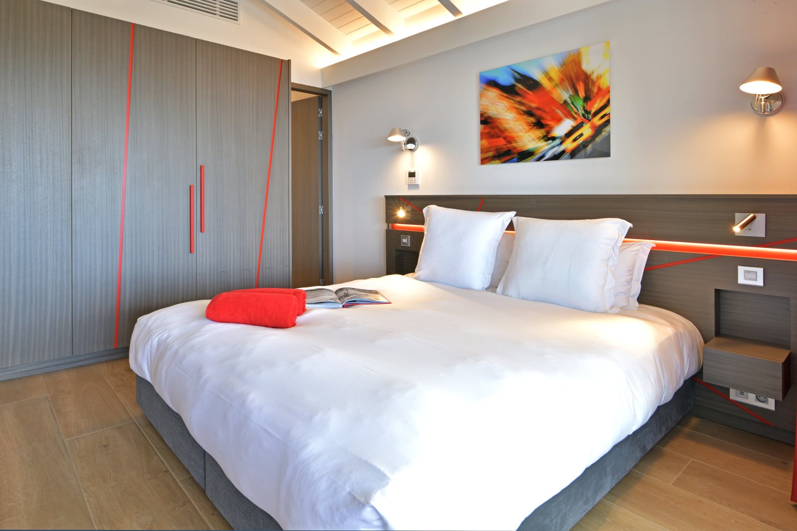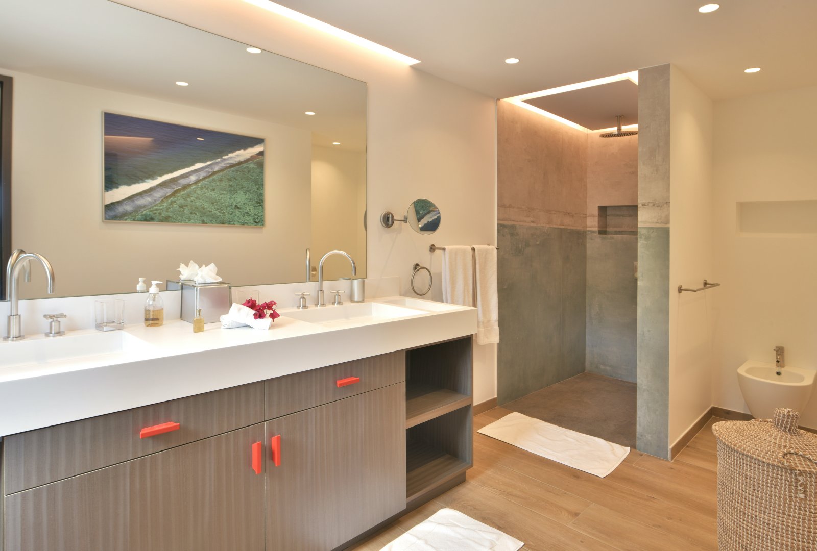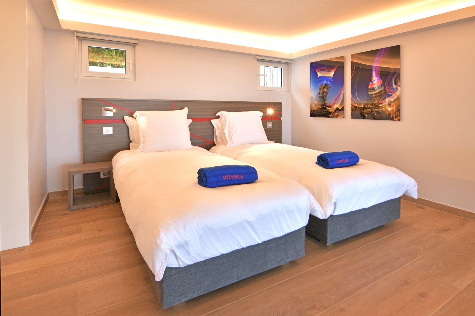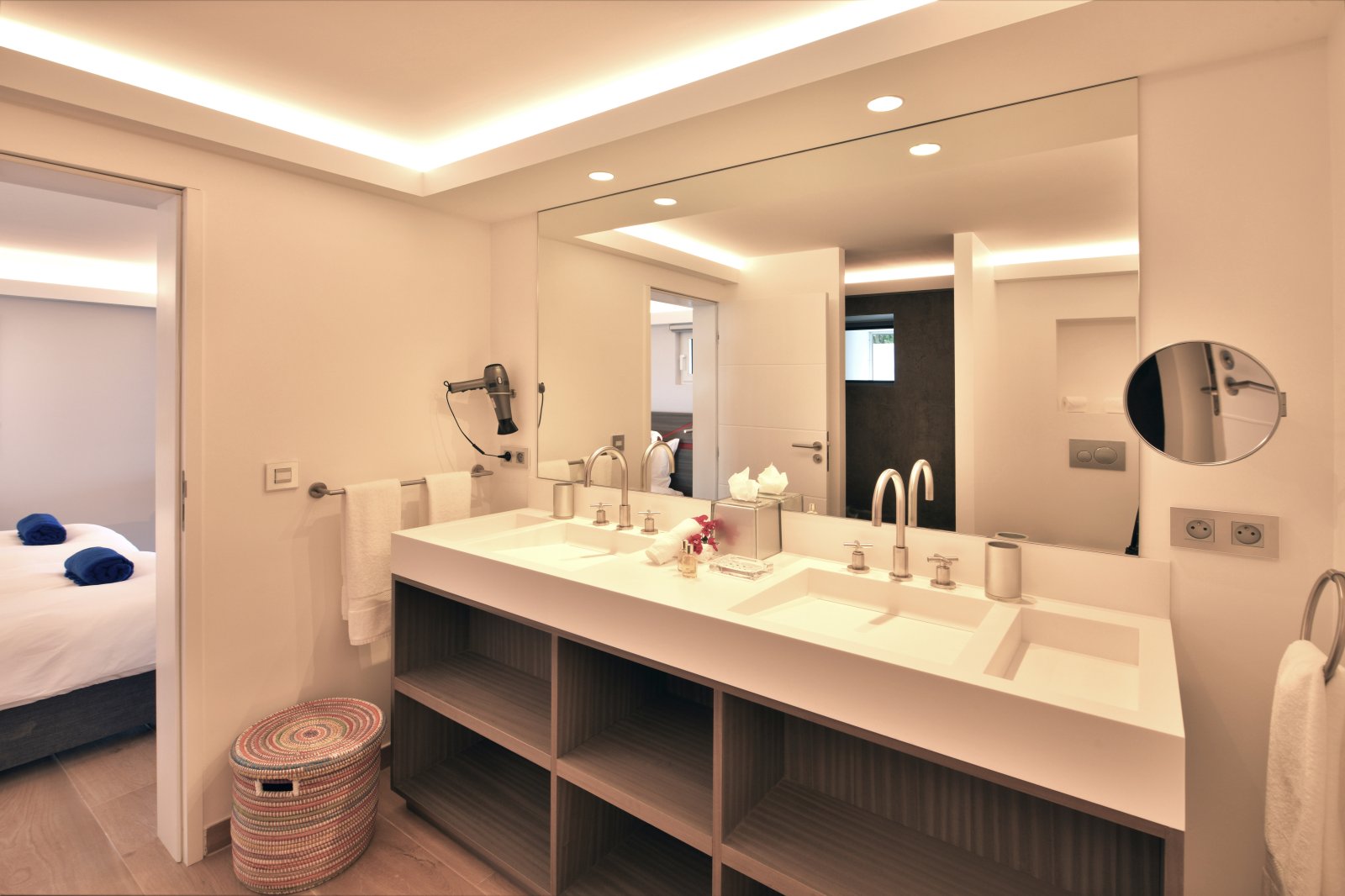 Each of the bedrooms features a broad range of modern comforts including headboards with sophisticated lighting, smart TVs, studies, large closets, and ensuite bathrooms with twin sinks and showers. The downstairs bedrooms can be configured with one king bed or two twin beds, which is another advantage for families with children.