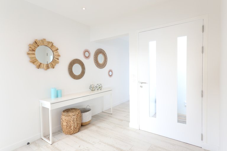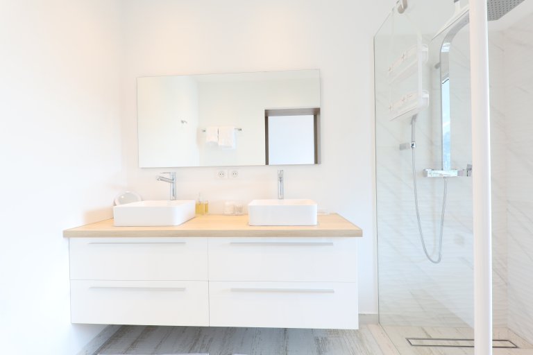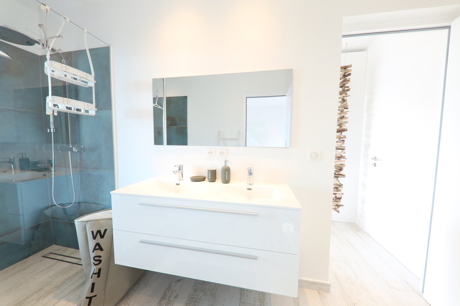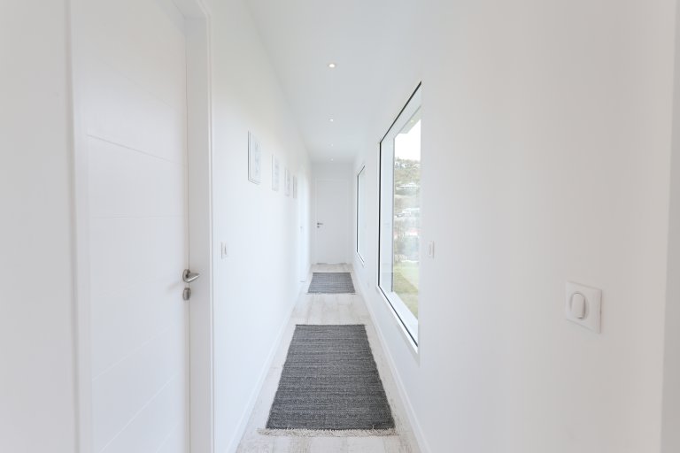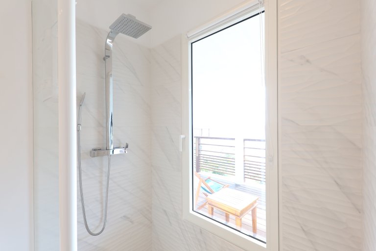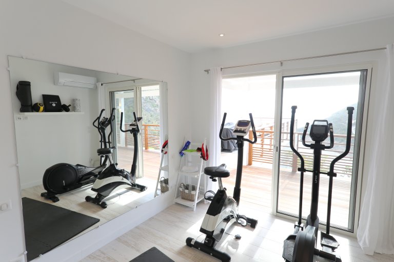 The two bedrooms are on the right side of the living room and have access to the terrace in front of them. Each one has an ensuite bathroom. The fitness room is also in this area of the house.