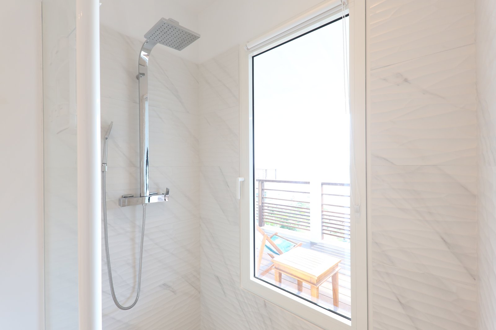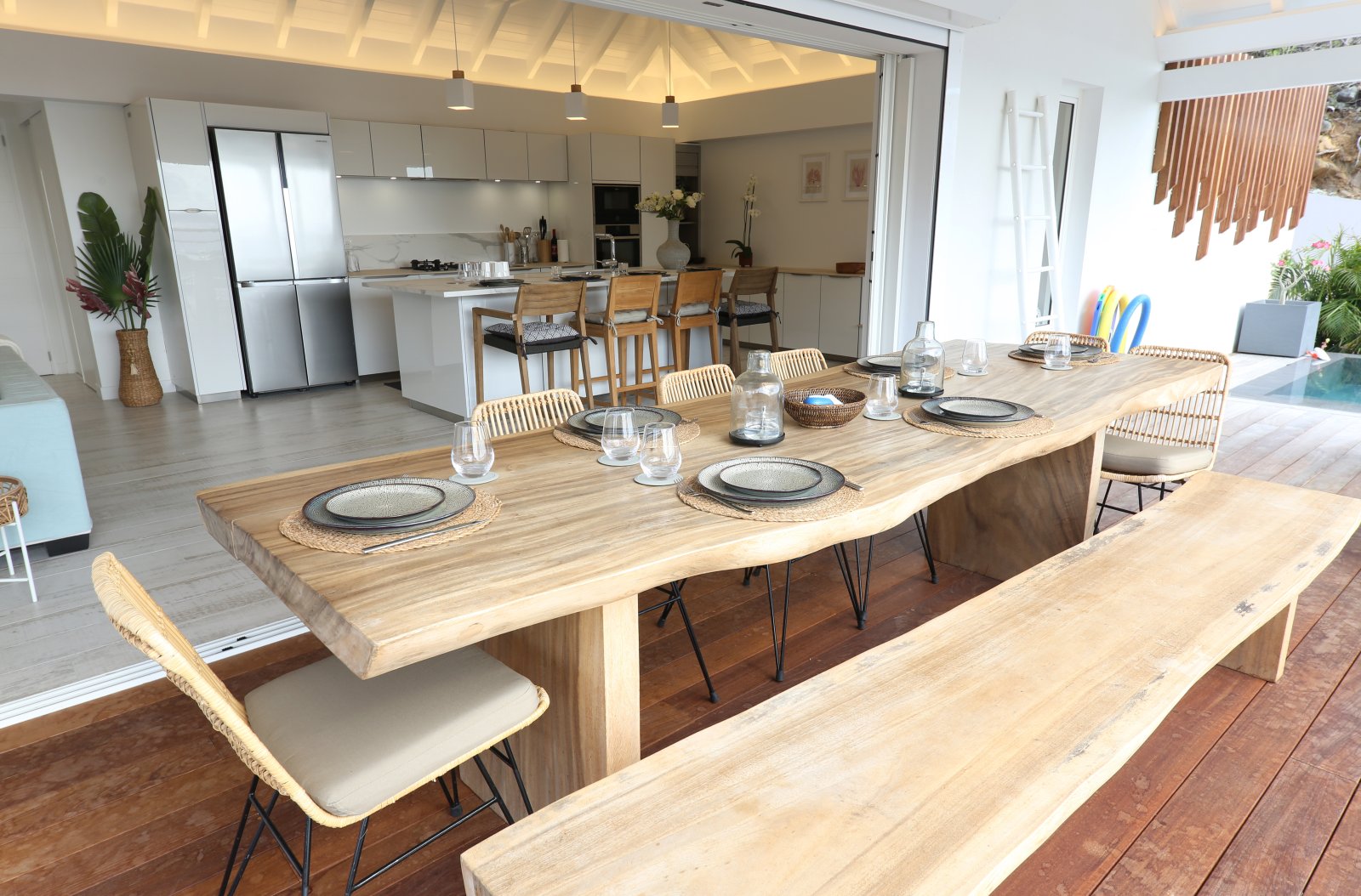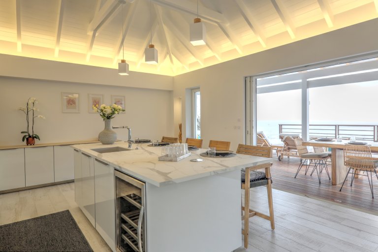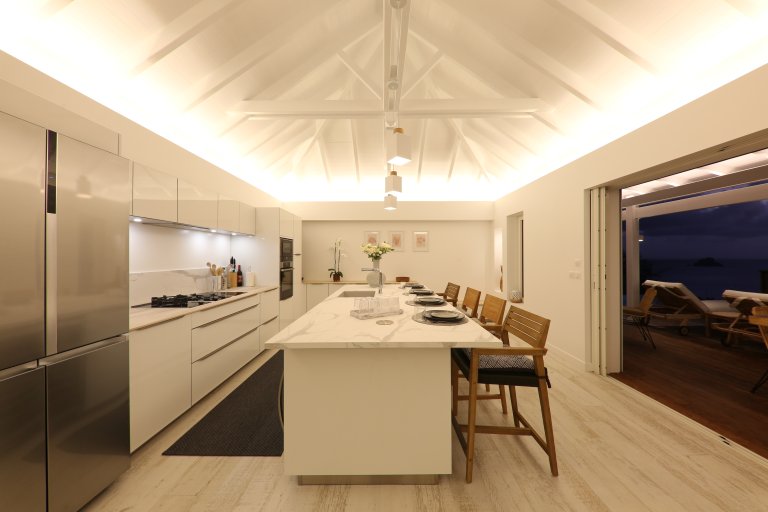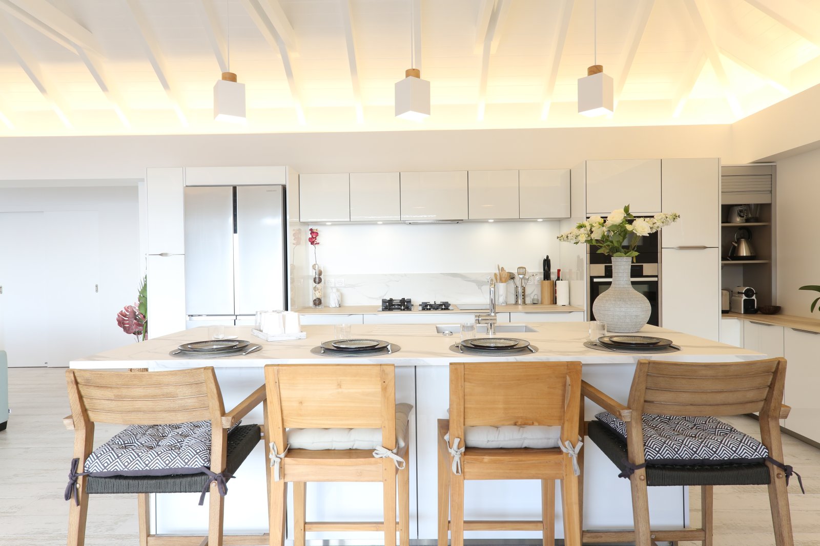 The entrance to Villa Coucher de Soleil puts you in the living area and kitchen when you arrive. These have vaulted, warmly lit ceilings and are decorated largely in white, giving them a feeling of spaciousness. The kitchen has a large island in the middle, which also serves as a bar or breakfast spot. The large dining table is on the covered terrace.