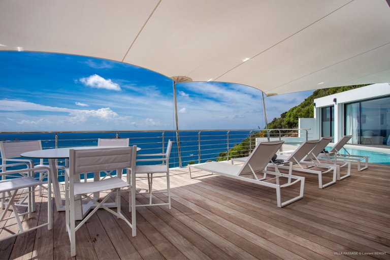 Throughout the year, the terrace is an important part of Villa Passage. It has shaded and sunny areas around a heated infinity pool. There is a green area for sunbathing a little bit down the hill.