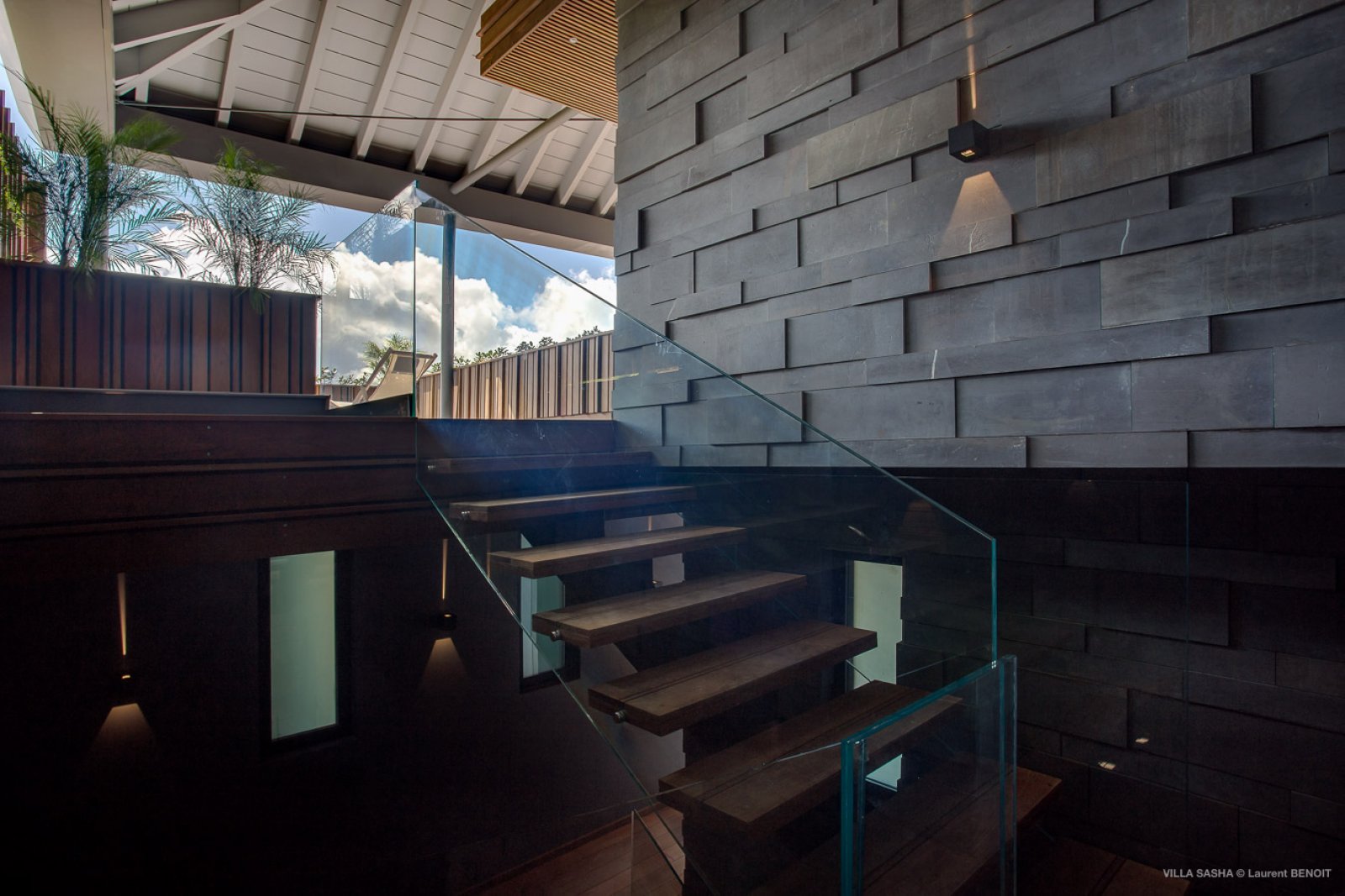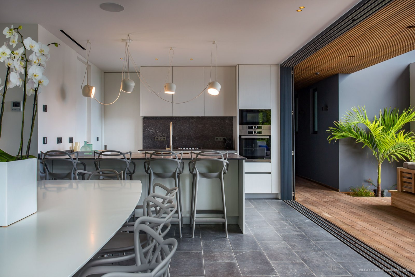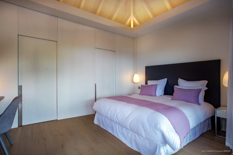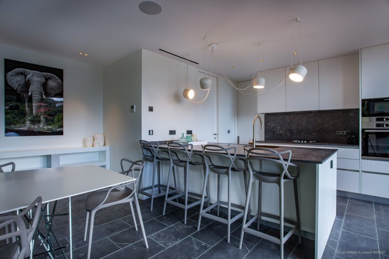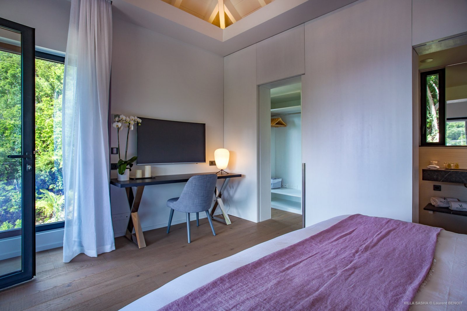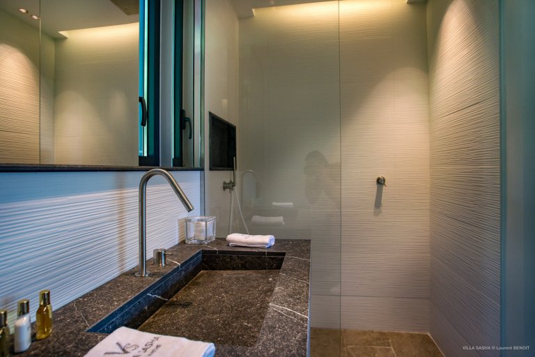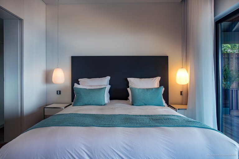 Villa Sasha is built over three levels. On the lowest there is a convenient covered parking area. The living area, kitchen, terrace, and pool are on the middle level, and two additional bedrooms lie upstairs. All three bedrooms are equal in size and come with European king beds and ensuite bathrooms.