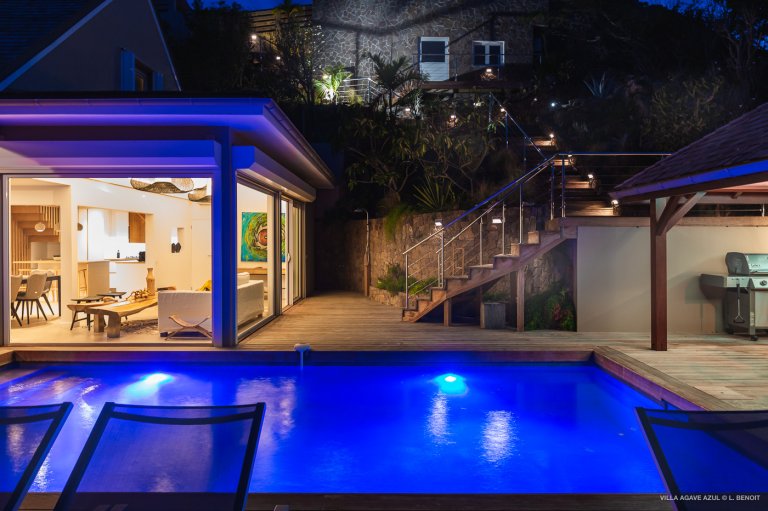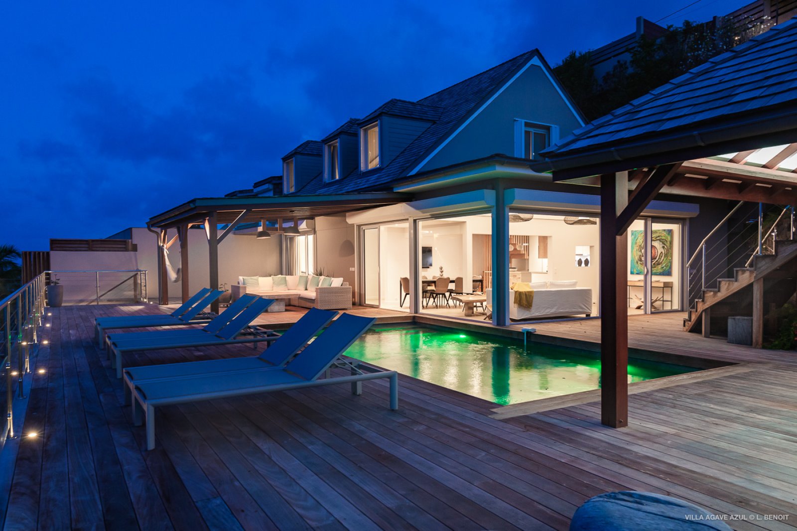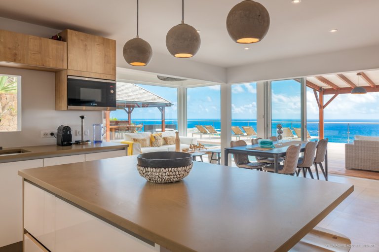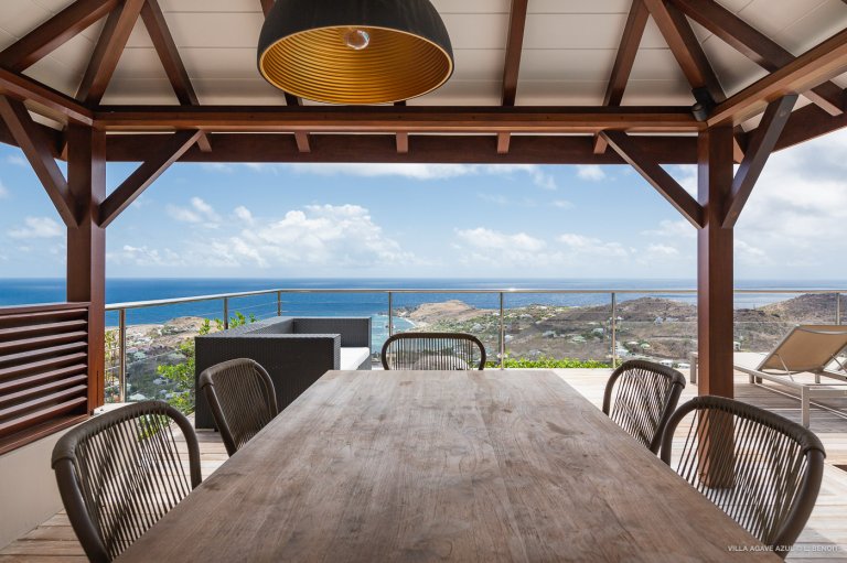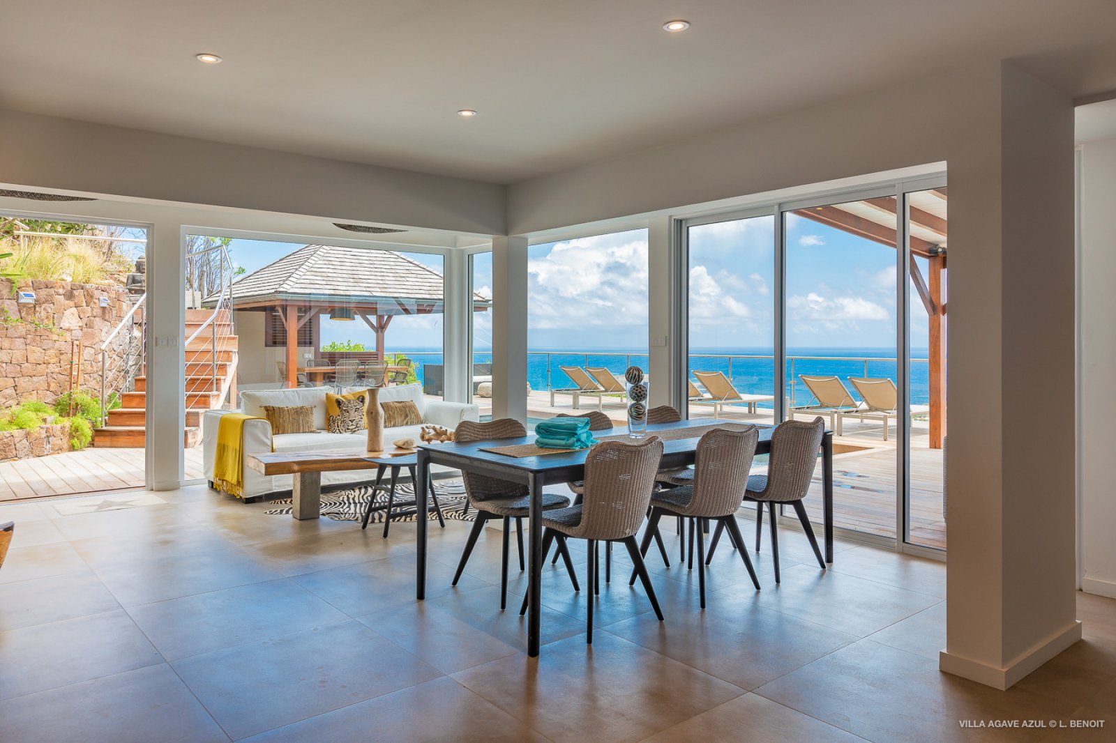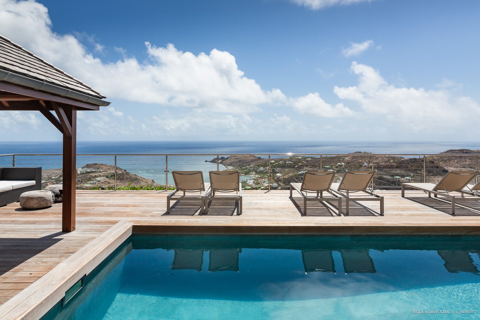 Located on the Vitet hillside high above the turquoise waters of Grand Cul de Sac, Casa Azul (ZUL) offers its guests the peace and tranquility of a very private location while also providing a stunning panoramic view out over the eastern end of the island and the Atlantic Ocean beyond. On the villa's main floor you will find the integrated kitchen, dining and living areas, furnished in dark wood and white fabric, for a clean, contemporary look. Wide sliding glass doors ensure an ocean view from practically every vantage point in the room and also allow easy access to the teak terrace, plentiful and comfortable outdoor seating, and the pool. On this level you will also find Villa Casa Azul's first master bedroom, with an ensuite bath and a view.